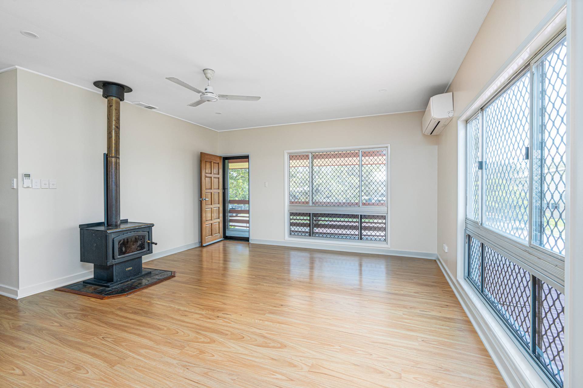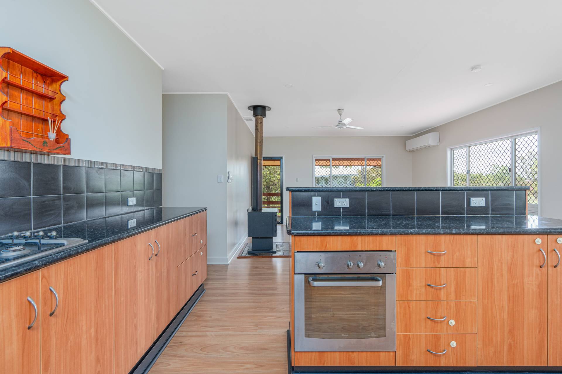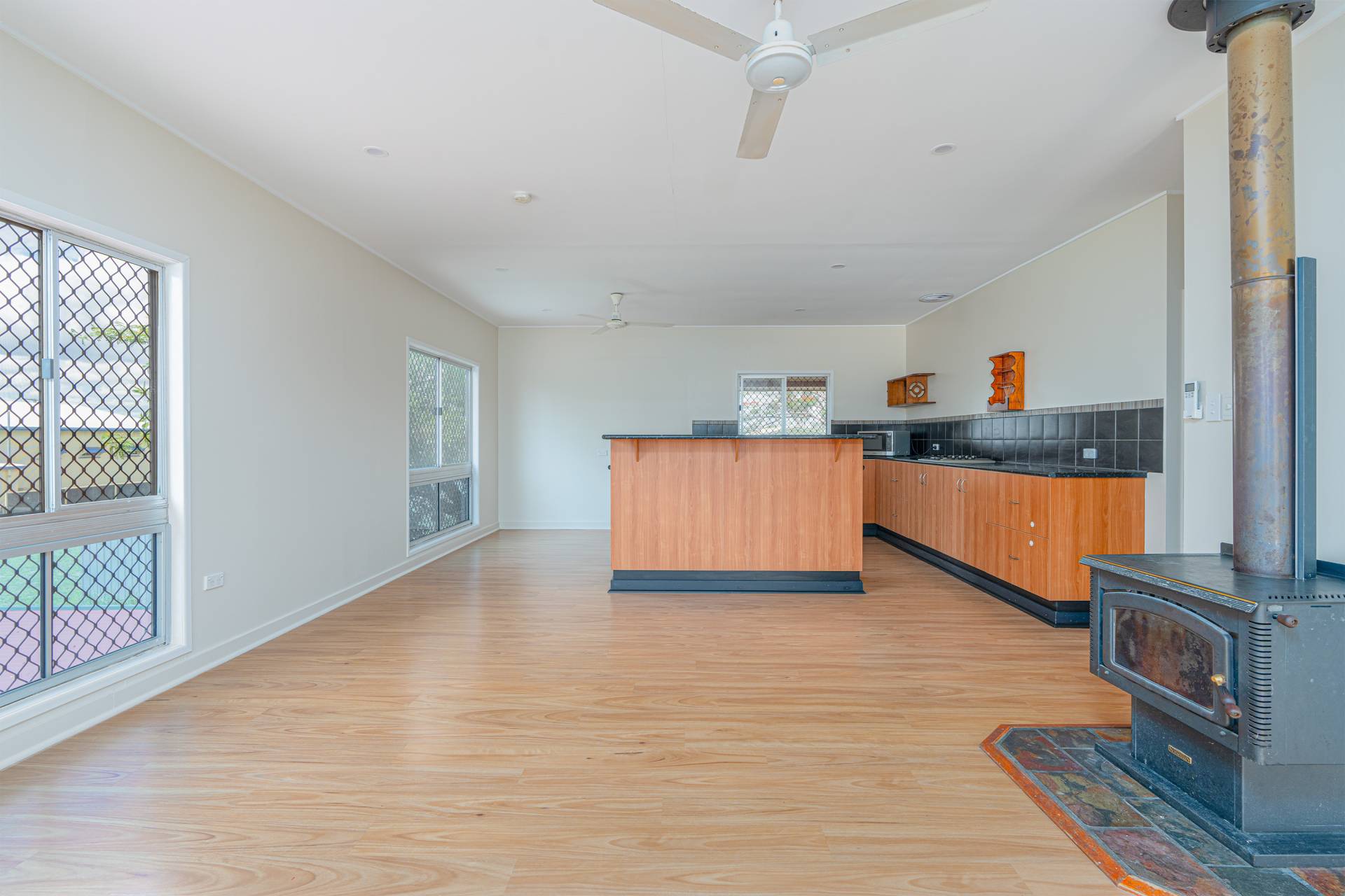 -Open plan living area with freestanding fire place