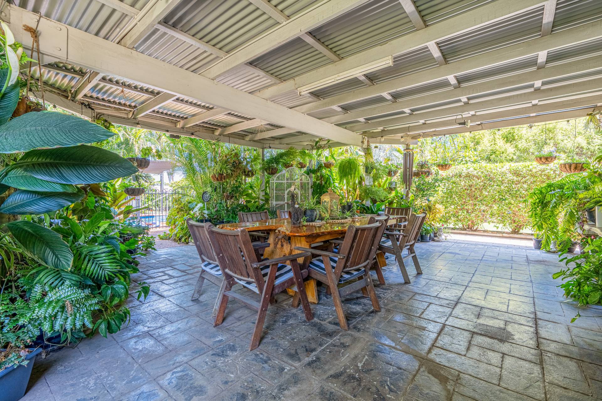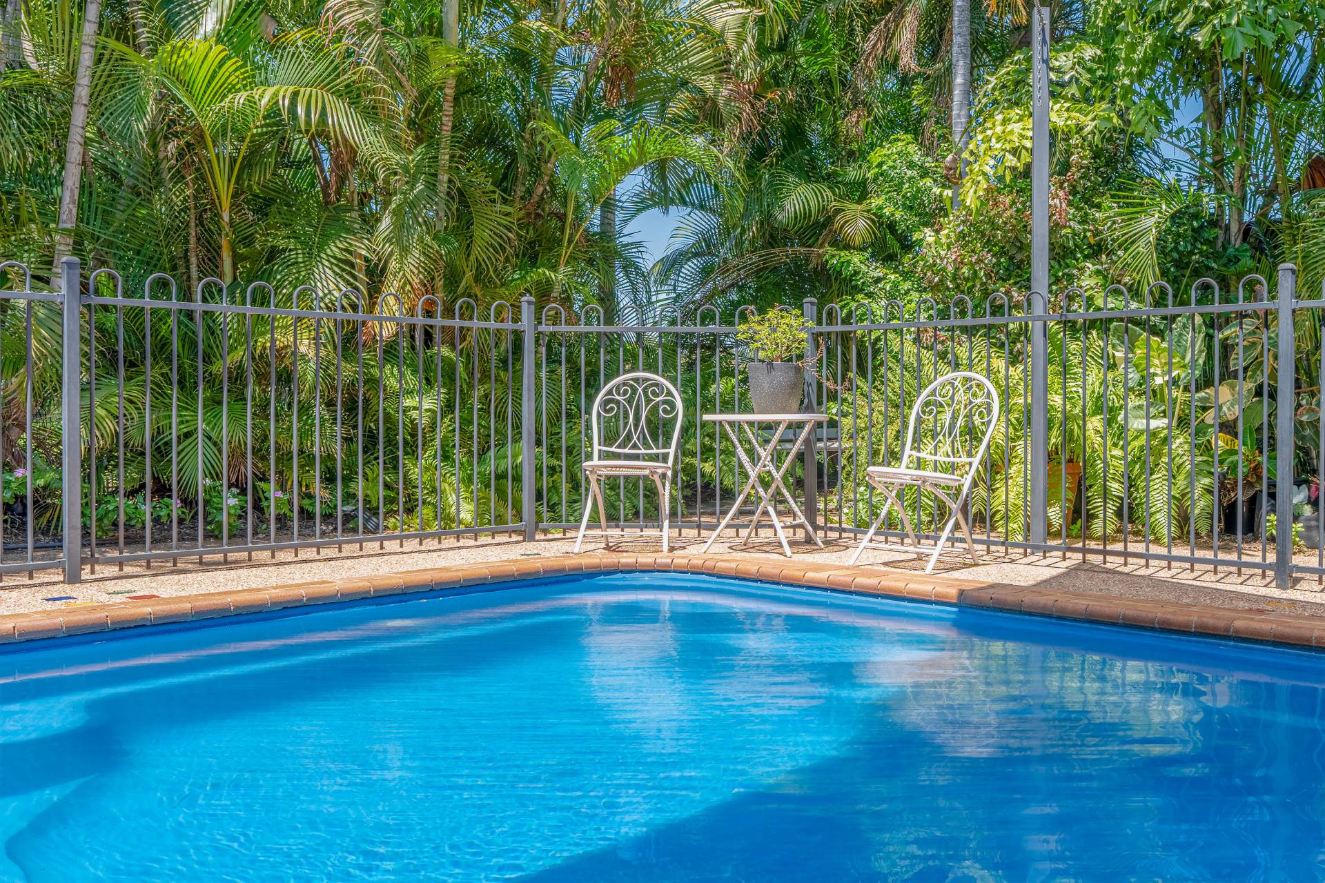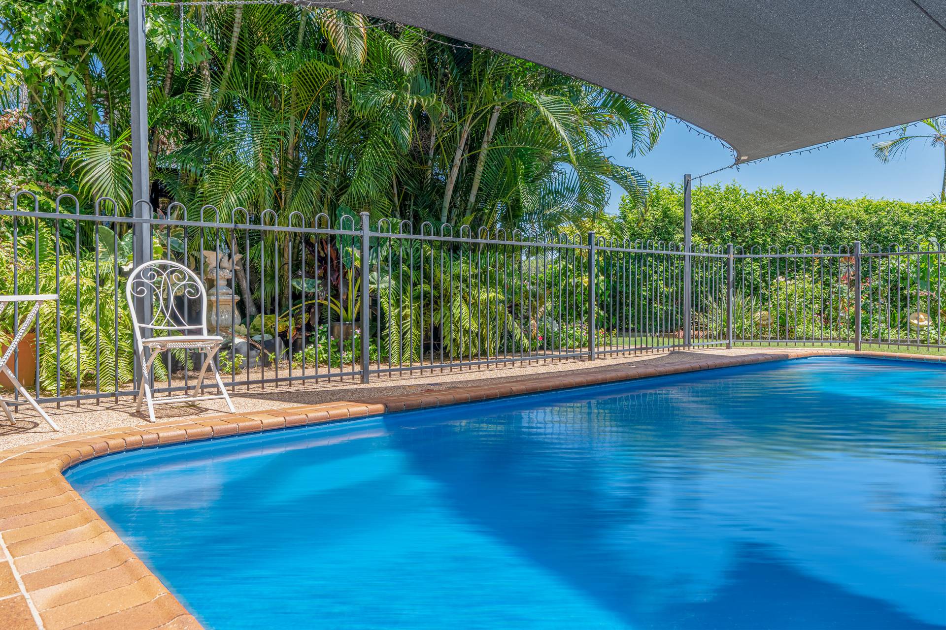 - Tranquil outdoor entertainment area overlooking the sparkling in-ground saltwater swimming pool