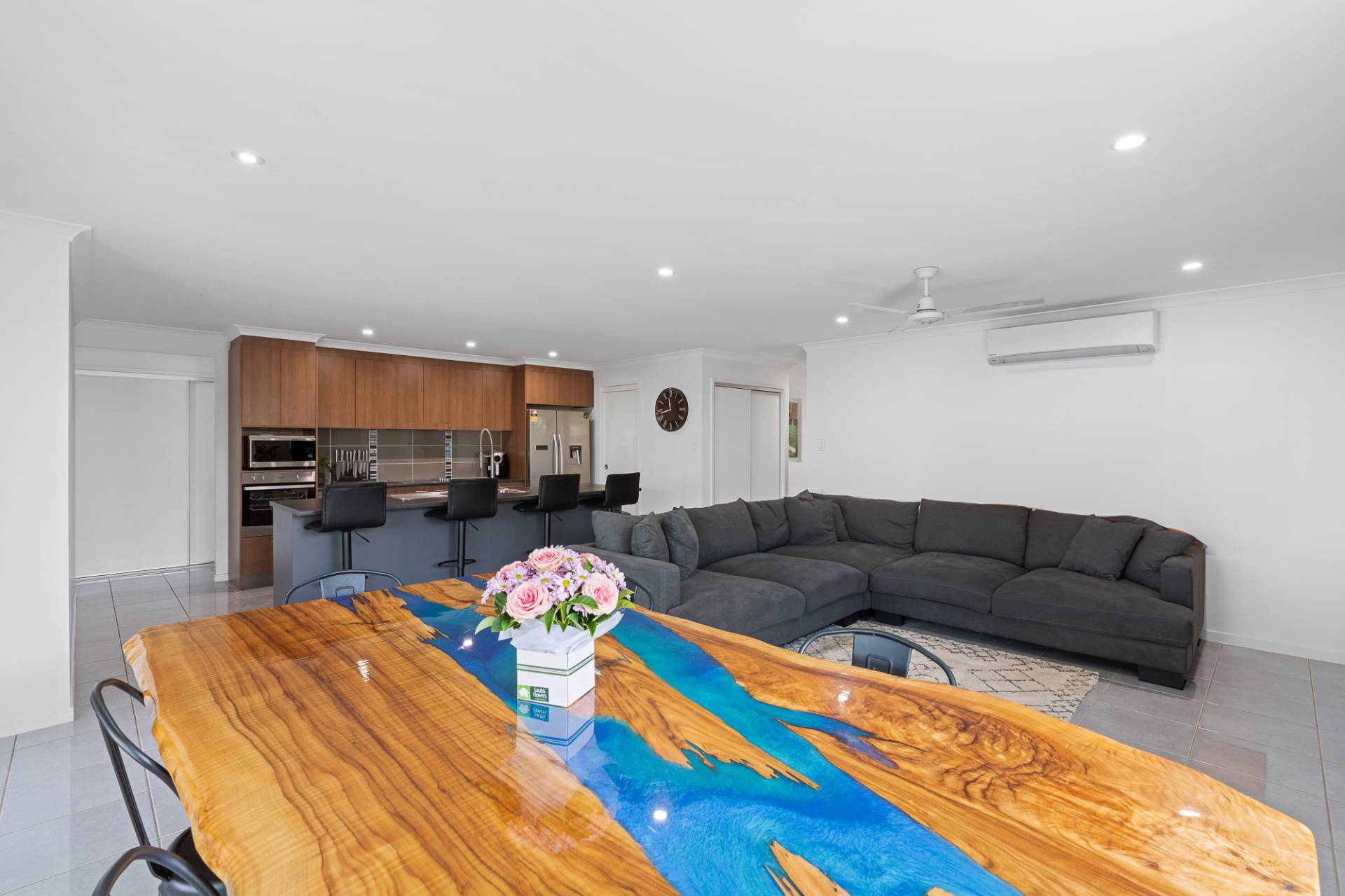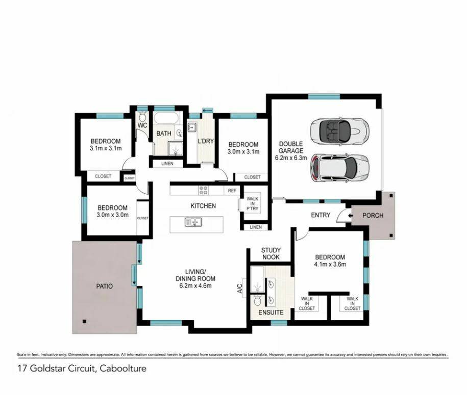 As you walk through the front door, the master is combined with air conditioning, his and her walk in robes, a large open ensuite with double basins, a double shower head shower for couples to enjoy and a tucked away toilet for privacy. As you head through the home, you will find a study nook tucked away prior entering the open plan living, dining and kitchen area and built in recesses for a nice welcoming entrance.