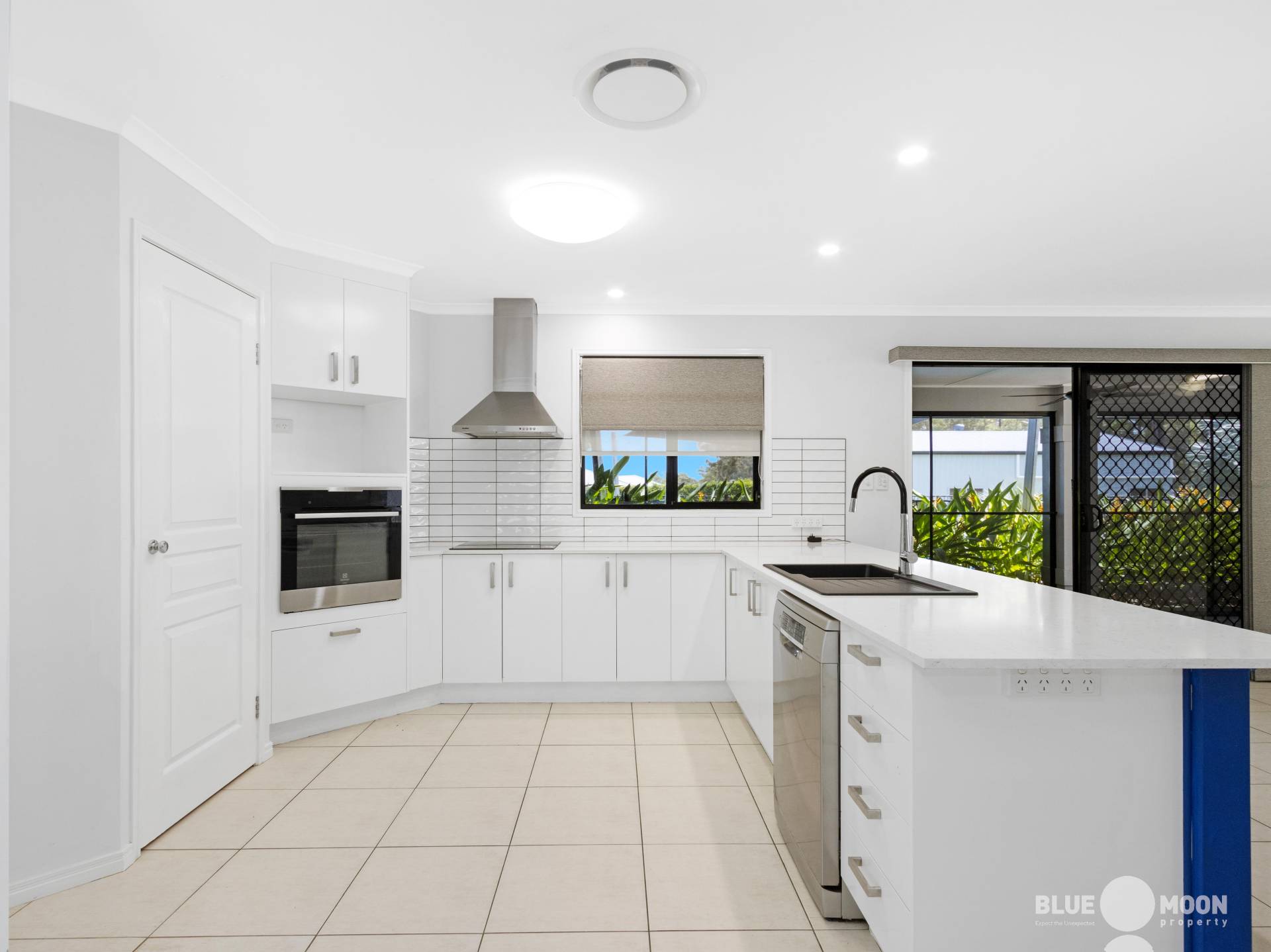 The air conditioned modern kitchen is sleek and stylish. With crisp white cabinetry, stone benchtops, stainless steel appliances, dishwasher, electric induction cooktop, Electrolux Pyrolytic oven and plenty of bench space and storage, this space is a masterclass in functionality and elegant design.