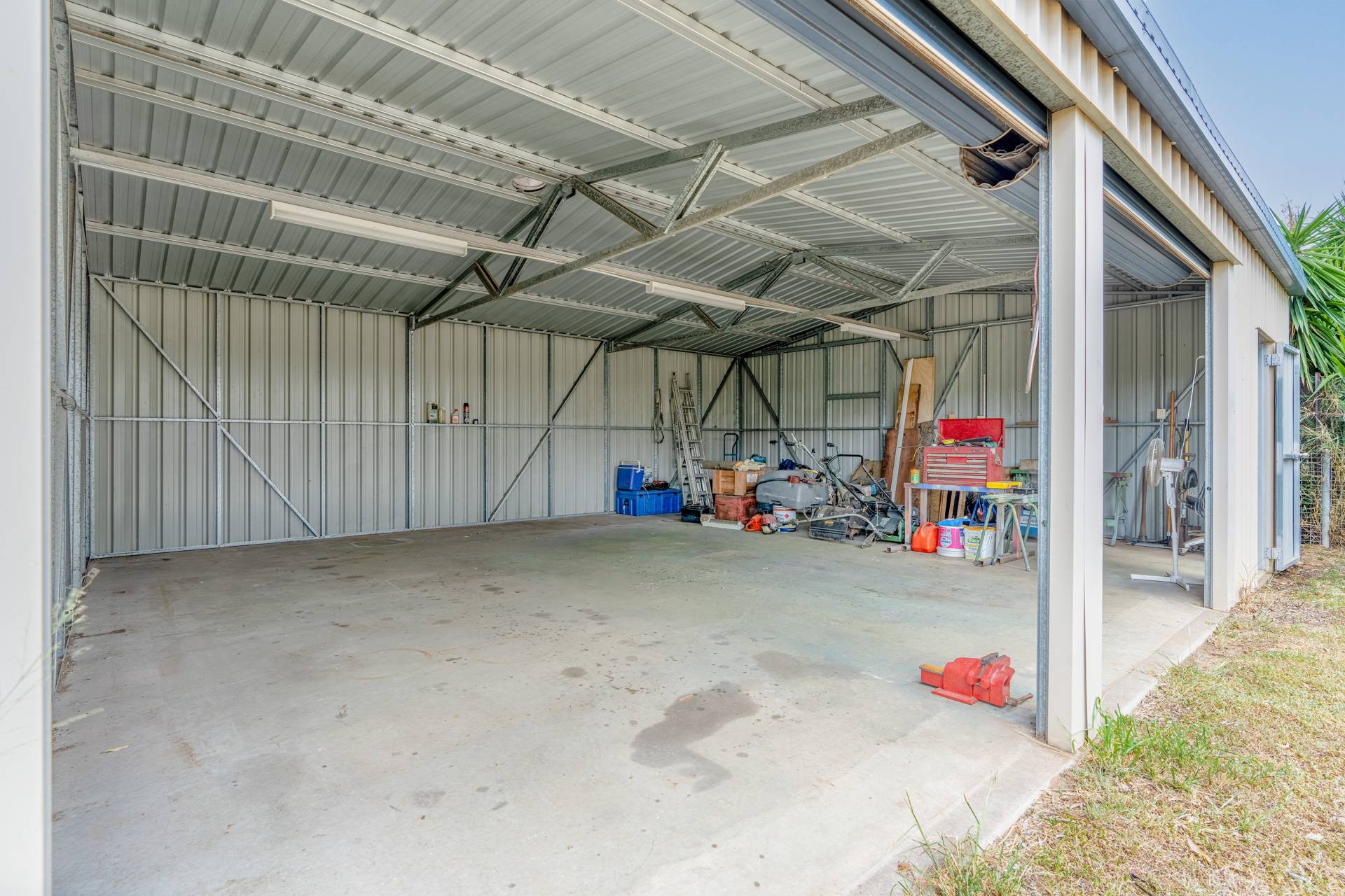 Shed: Side access to the generous triple bay, powered shed.