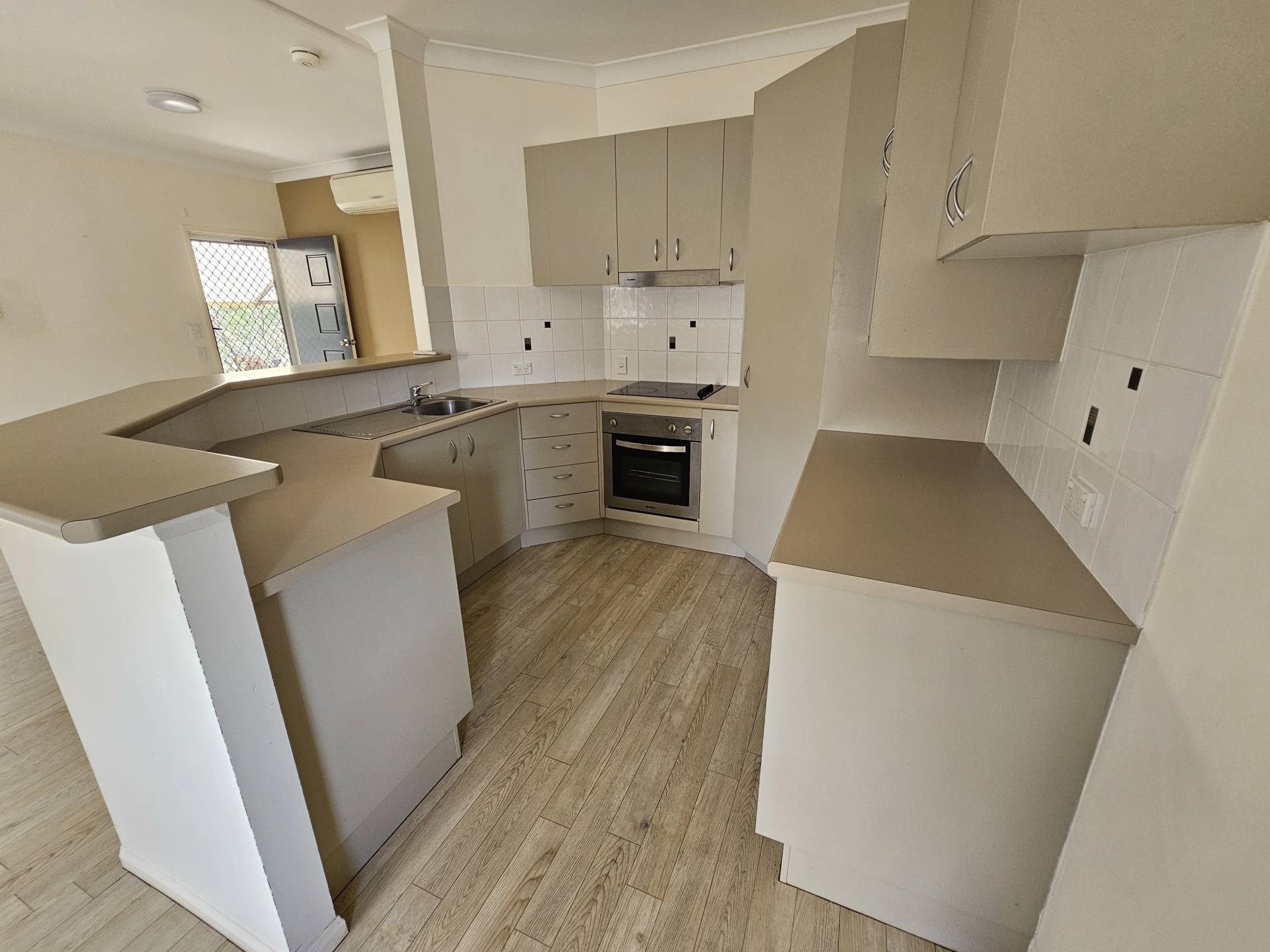 -Modern Kitchen with electric cooktop, range hood, under bench oven, pantry, storage cupboards for the crockery, pots and pans. There is also space enough for a double door fridge