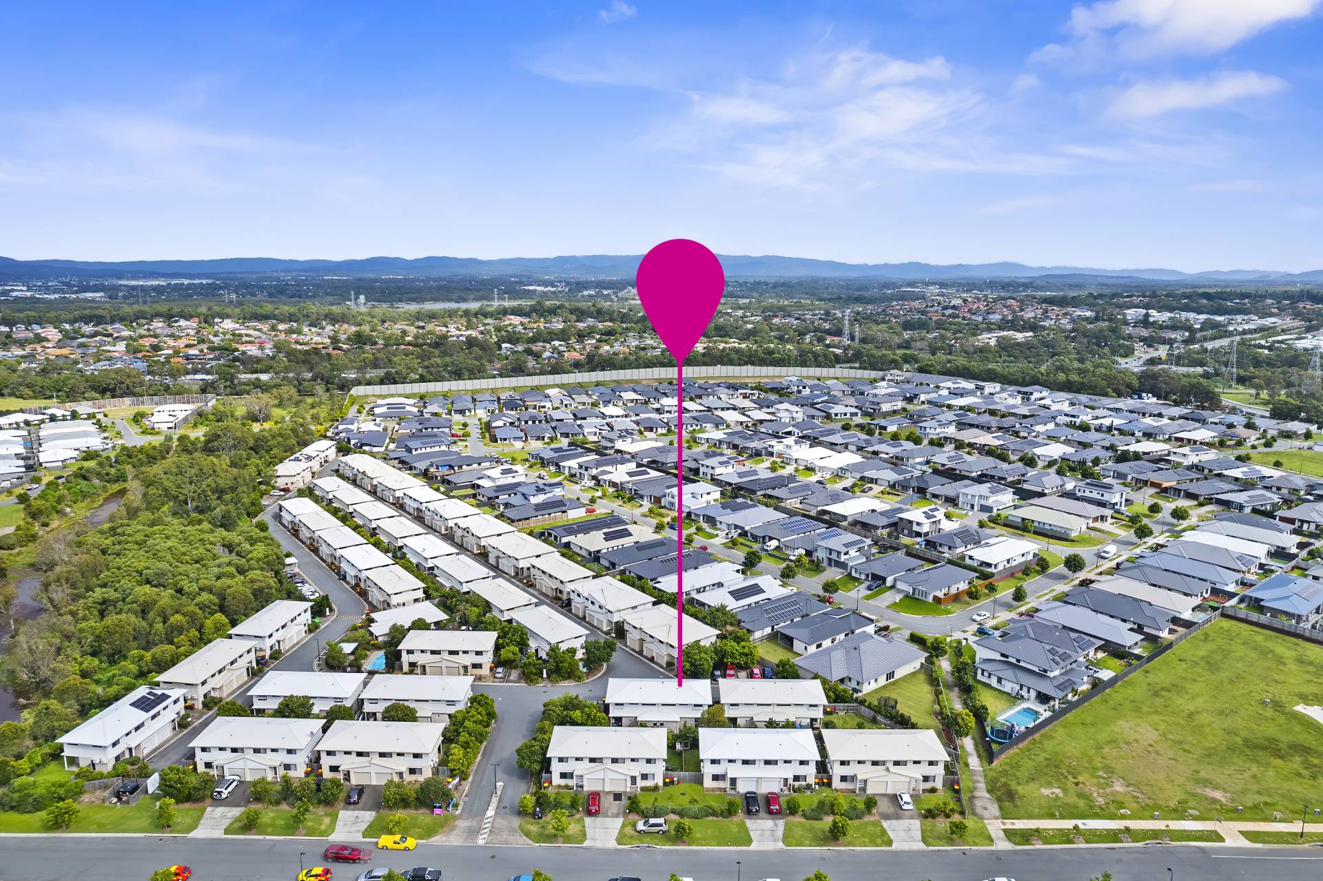 Upstairs offers 3 large bedrooms with built-in robes, the master with a walk in with air conditioning, and a private ensuite. A central bathroom serves upstairs, while downstairs includes a handy powder room accessible via the laundry behind the kitchen. The property offers a private low maintenance backyard and a small patio for outdoor entertaining in peace and tranquillity and the community pool is not far away.