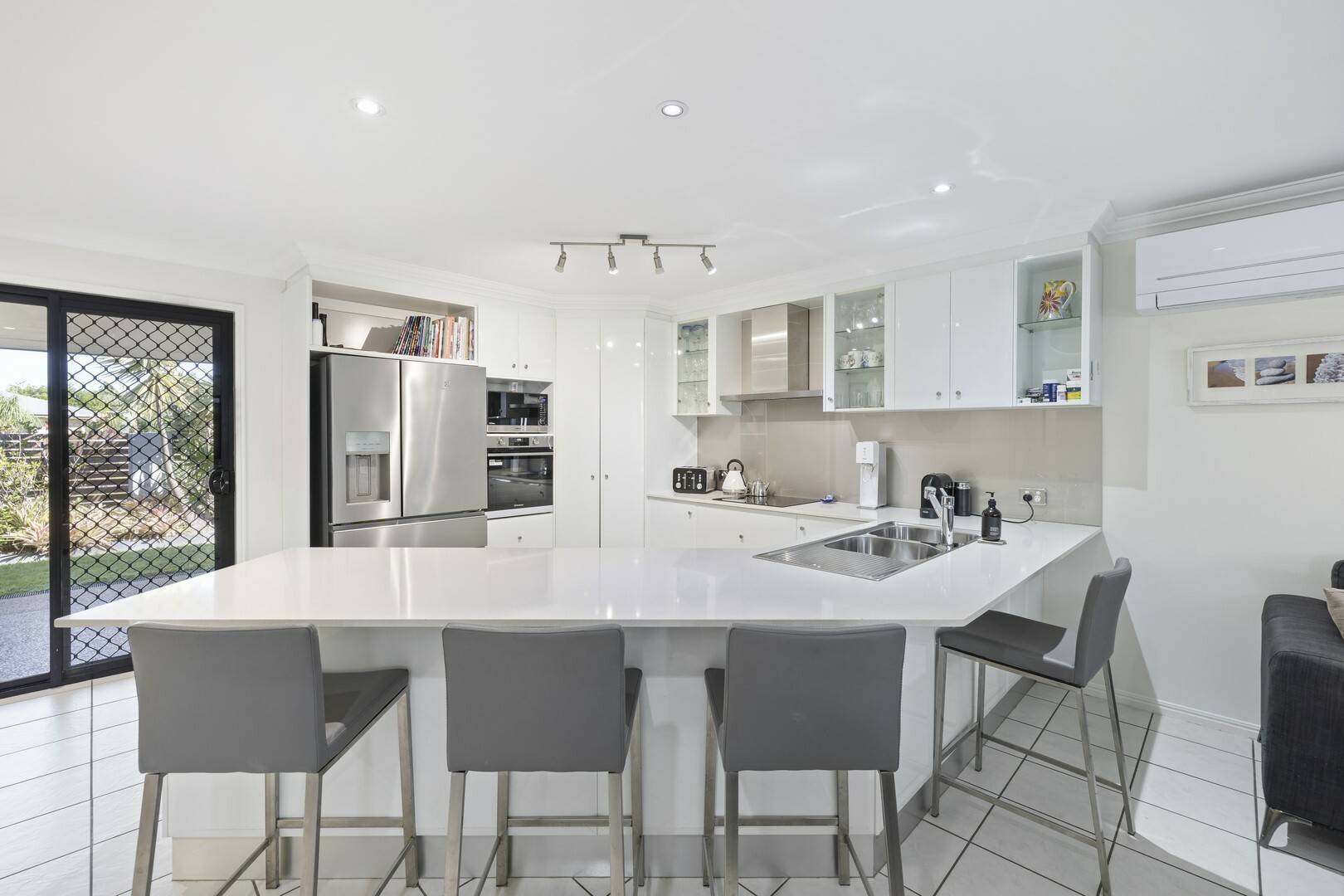 • Centrally located kitchen with loads of cupboard space and stone benchtops.