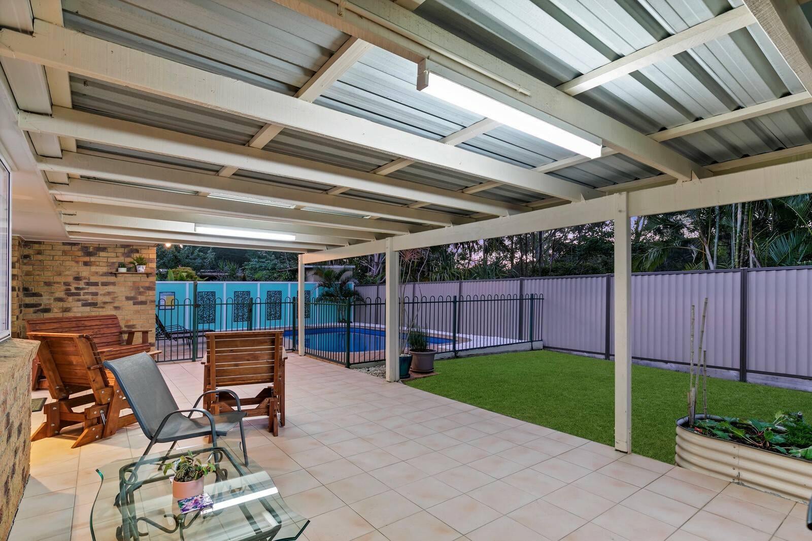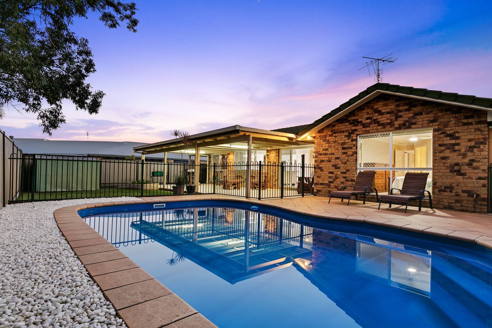 Outside, a north-facing outdoor area beckons, ideal for enjoying sunny days and alfresco dining. The inground pool is surrounded by a generous yard, providing ample space for children and pets to play safely. A secure front gate, double garage, and single carport offer convenience and peace of mind.