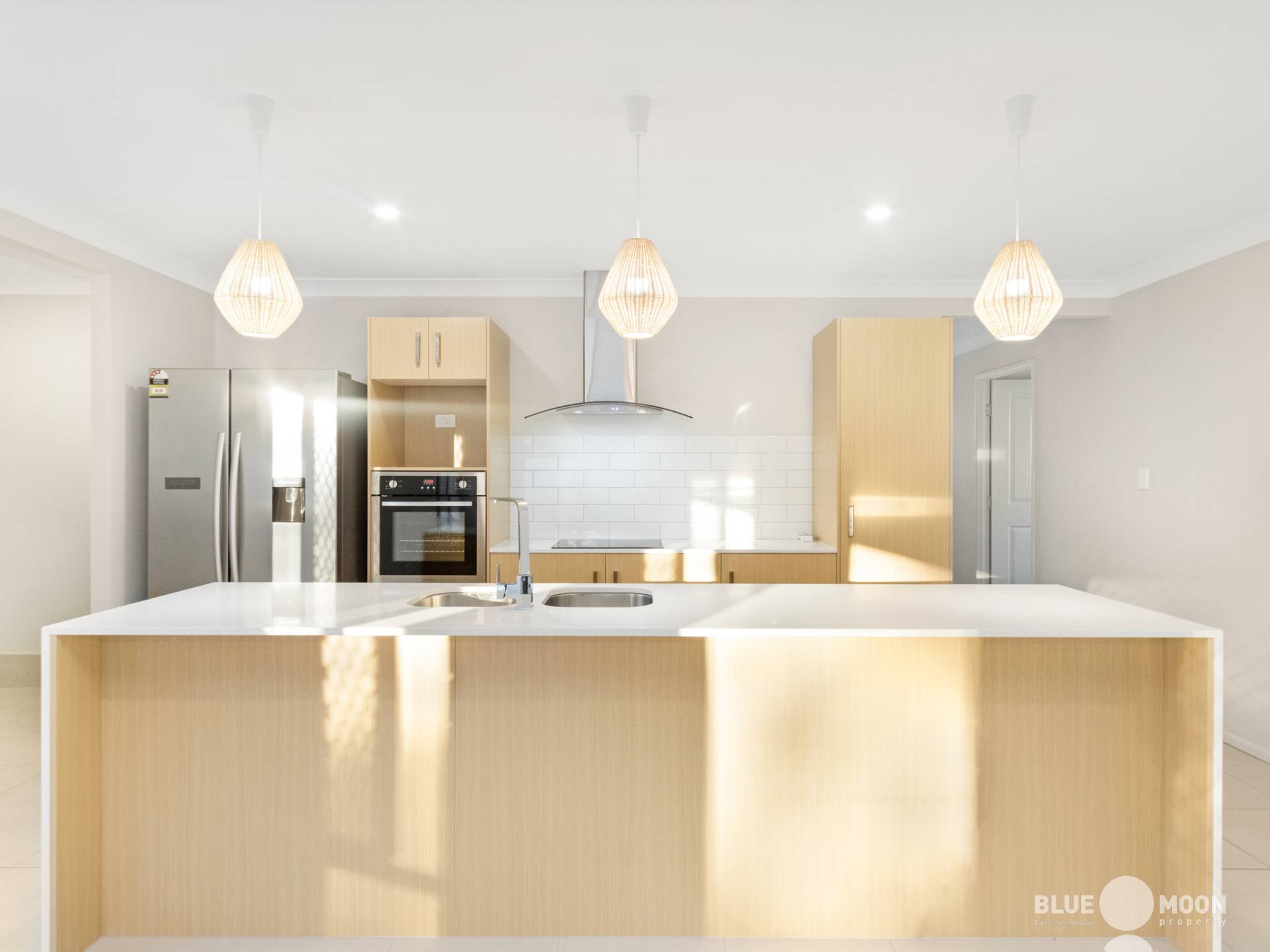 The centrepiece of the home is undoubtedly the stylish, air-conditioned modern kitchen. Boasting quality appliances, an eye-catching subway tiled splashback, island benchtop with waterfall edge, electric cooktop and plenty of bench and cupboard space this area is a masterclass in functional and elegant design. The three beautiful feature pendant lights that hang above the island bench add to the properties unique coastal design elements.