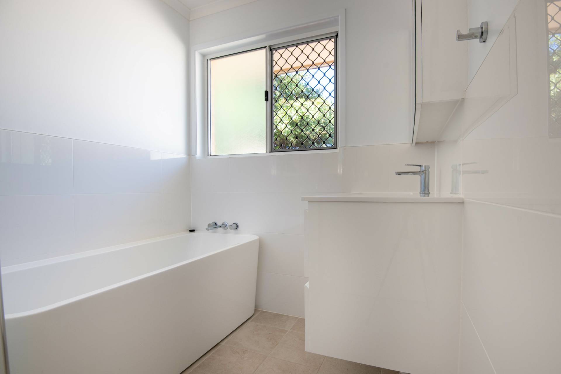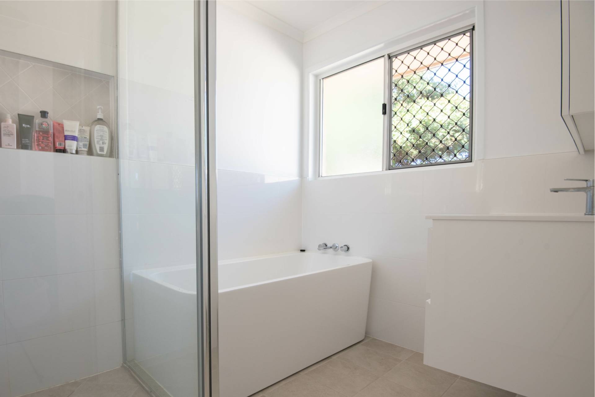 - Renovated bathroom with separate shower and bathtub