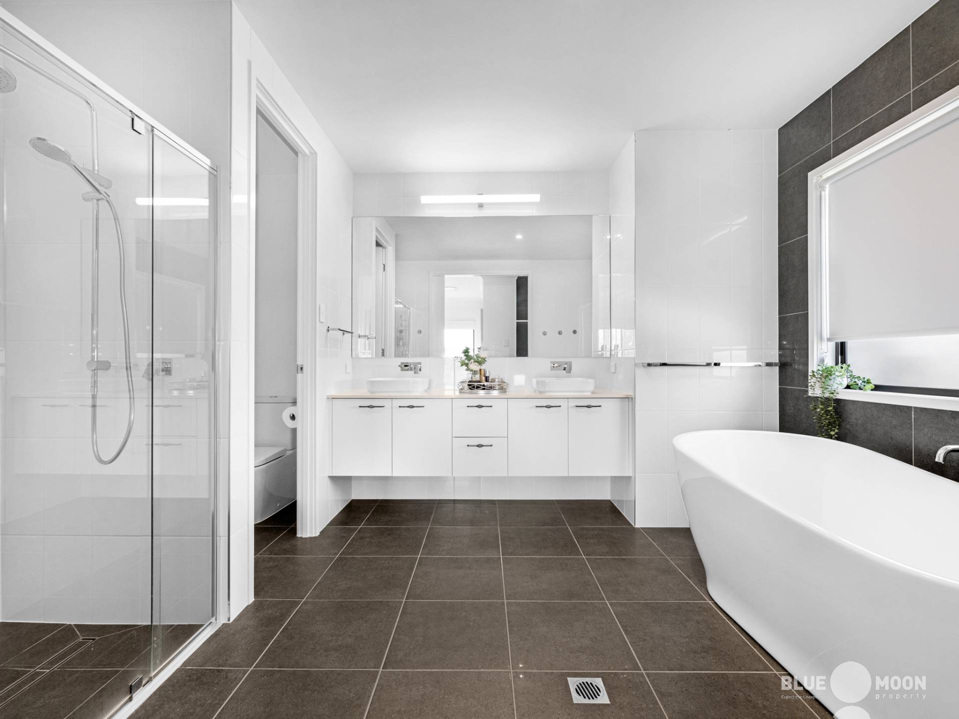 The luxe main bathroom with freestanding bath, double sink vanity and separate toilet ensures the elegance and functionality continue throughout.