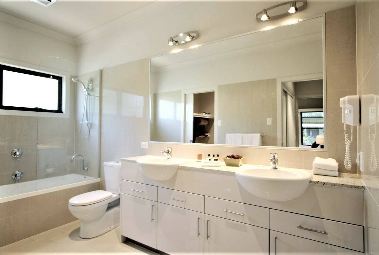 The resort style master bedroom offers a large walk-in robe and access to the dual entry bathroom, with its double vanity, spa bath/shower and toilet.