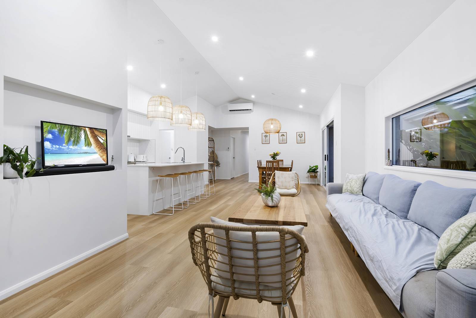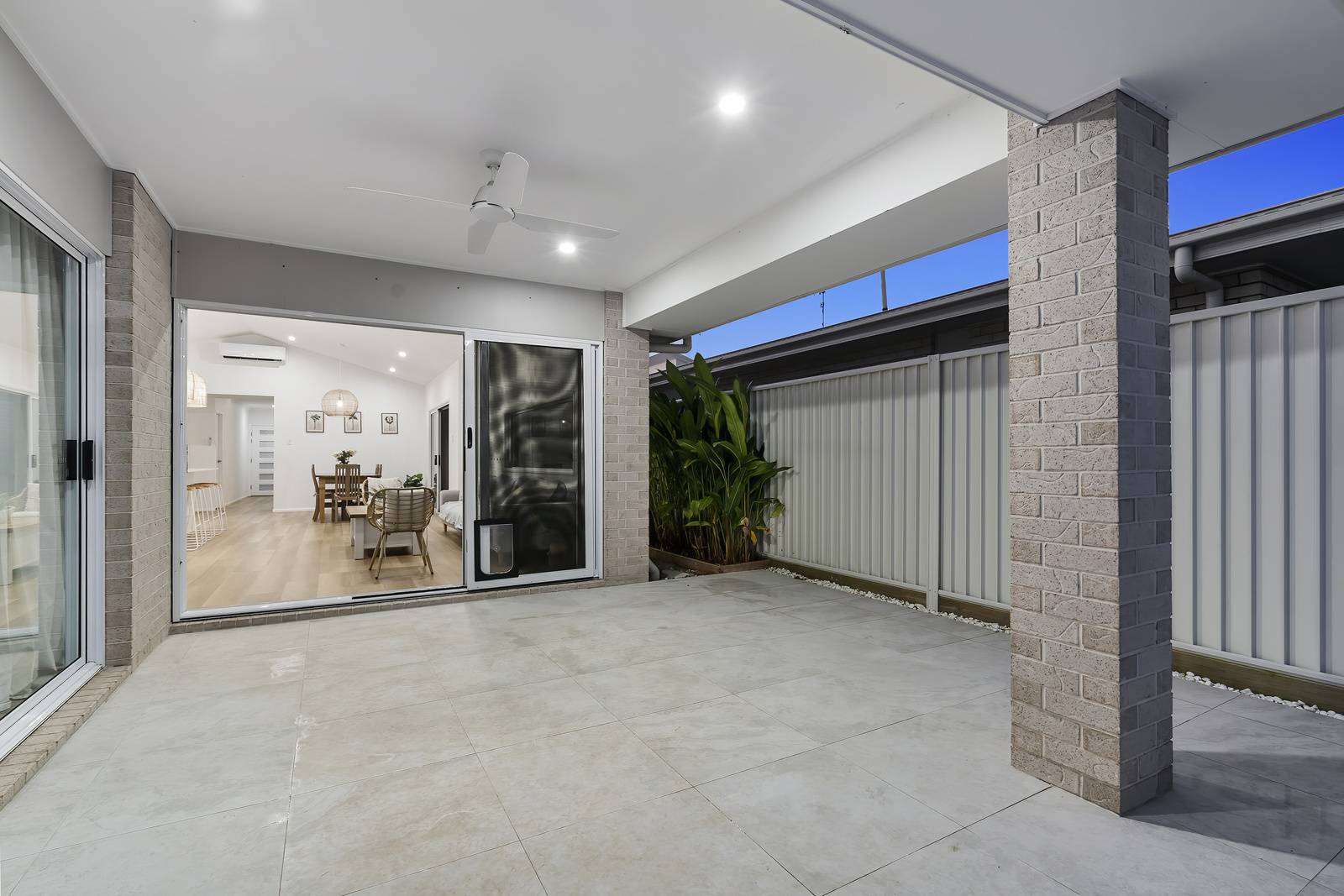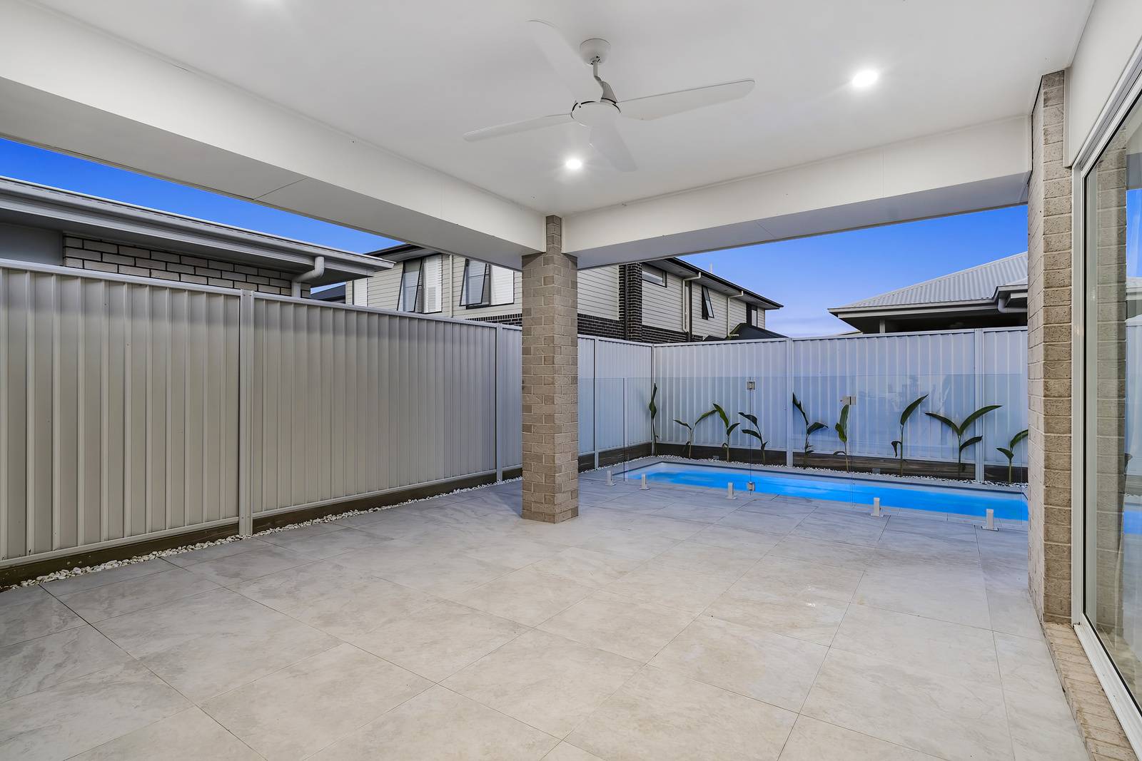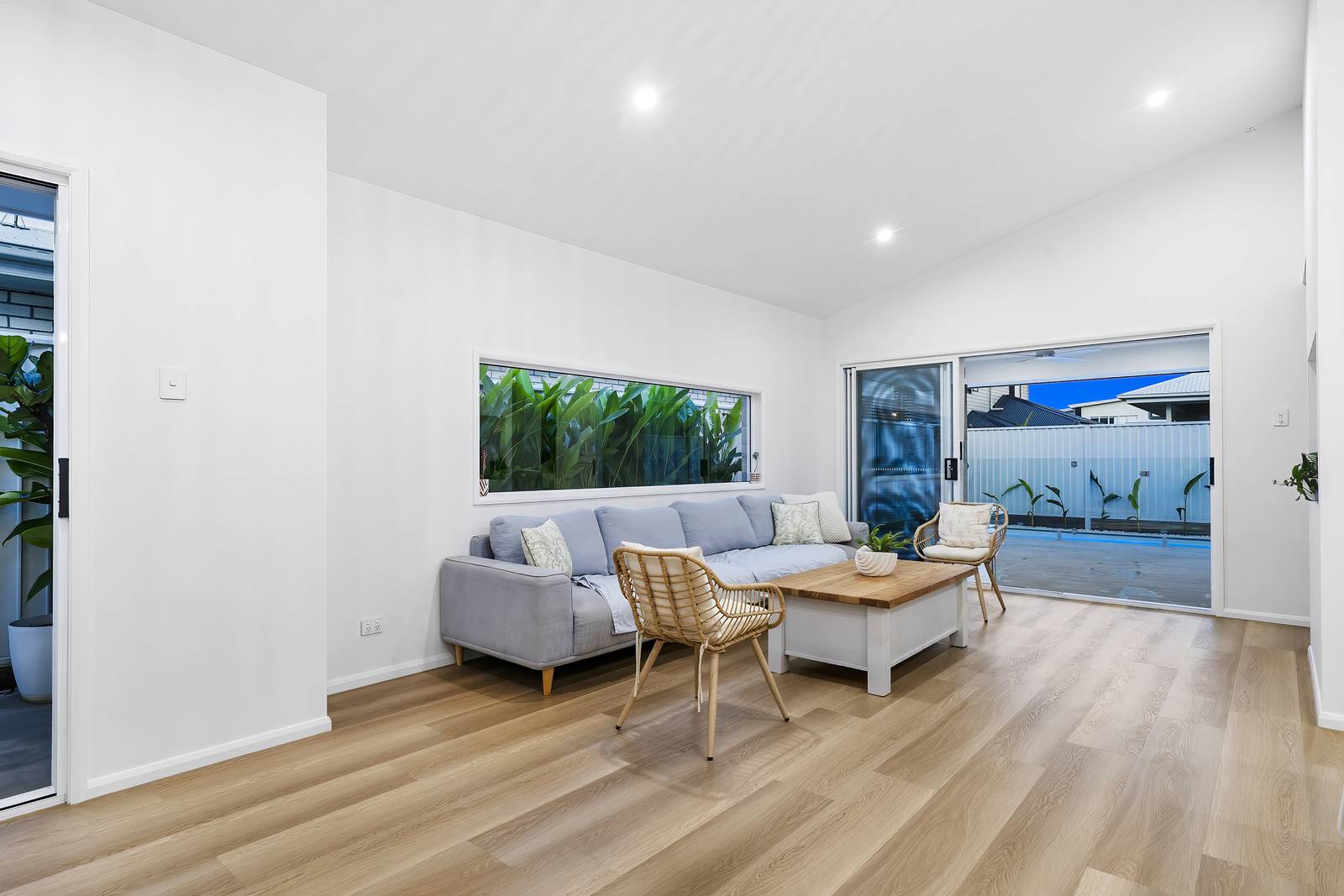 A touch of the lush outdoors is drawn in through a feature window in the living room, perfectly framing vibrant palms to bring natural light and greenery into the home. Stepping outside, neutral grey tiles create the perfect under roof space to enjoy year round. The sparkling in ground swimming pool is the showpiece of this area.