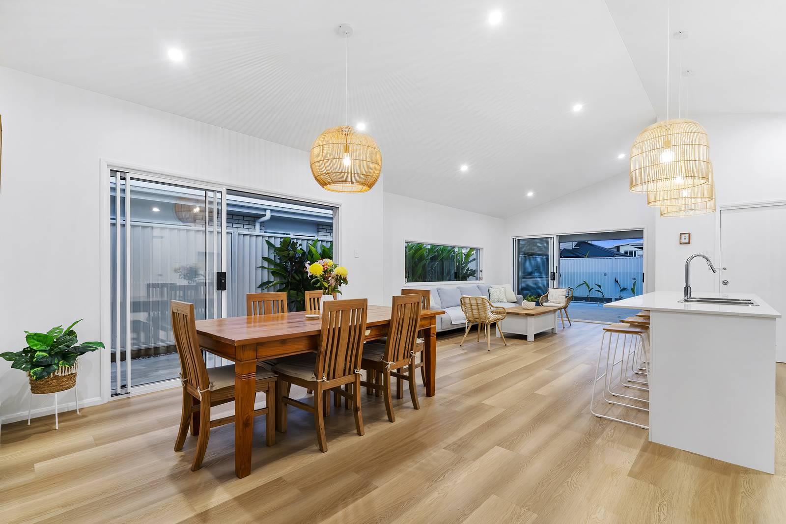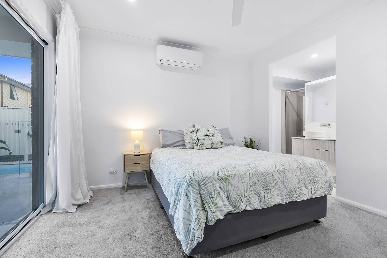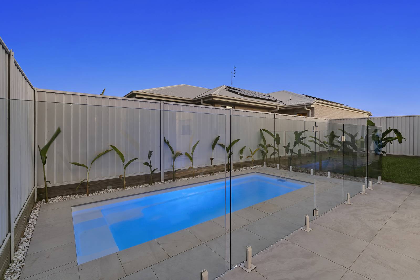 A touch of the lush outdoors is drawn in through a feature window in the living room, perfectly framing vibrant palms to bring natural light and greenery into the home. Stepping outside, neutral grey tiles create the perfect under roof space to enjoy year round. The sparkling in ground swimming pool is the showpiece of this area.