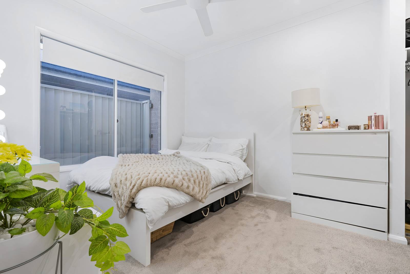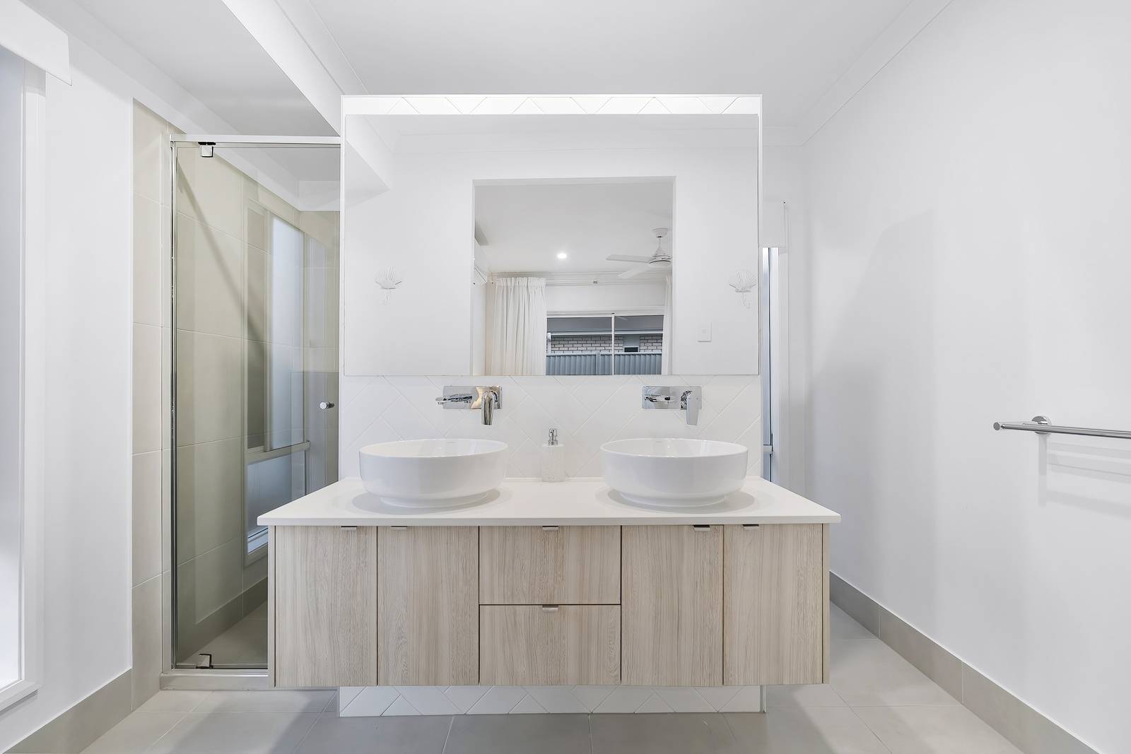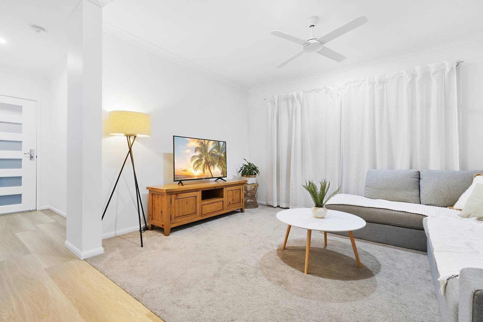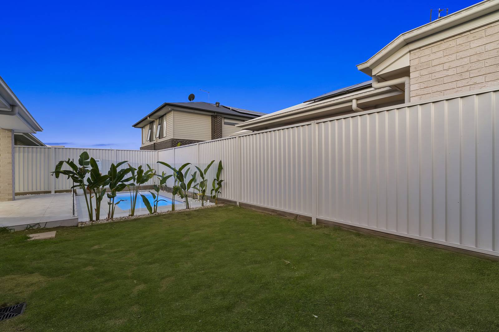 A touch of the lush outdoors is drawn in through a feature window in the living room, perfectly framing vibrant palms to bring natural light and greenery into the home. Stepping outside, neutral grey tiles create the perfect under roof space to enjoy year round. The sparkling in ground swimming pool is the showpiece of this area.
