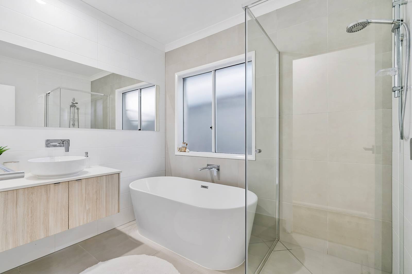 Floor to ceiling tiling in bathroom, luxe bath tub