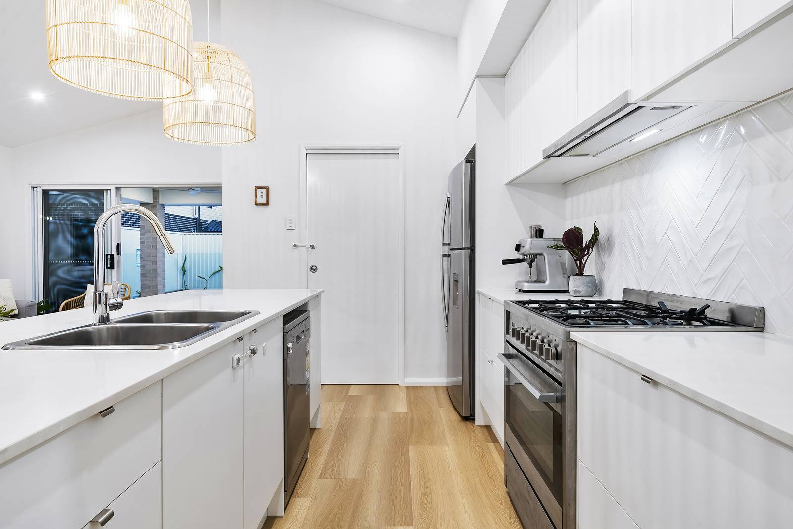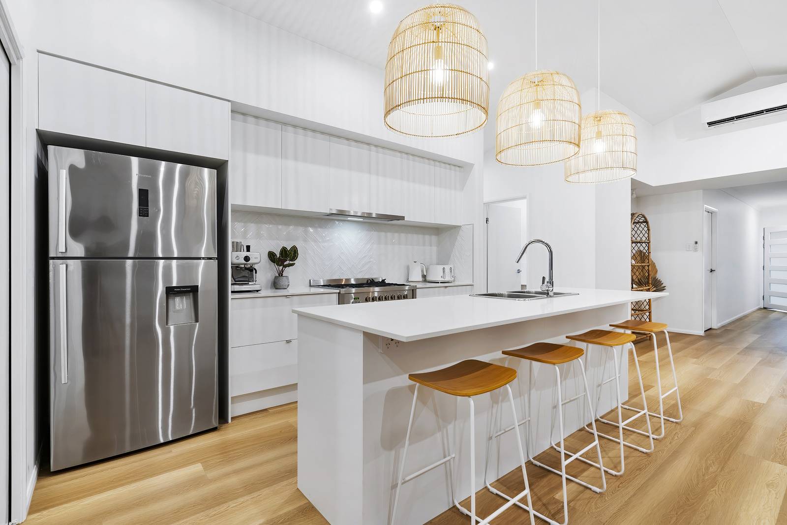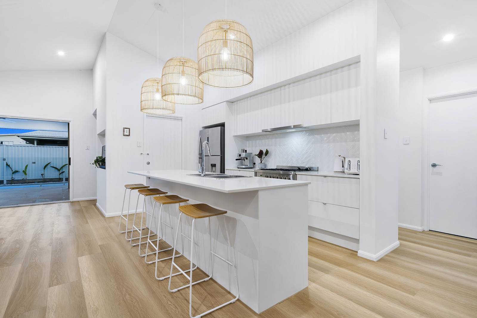 Internally, the eye is drawn up to experience the grandeur of high vaulted ceilings that elevate the main living space and add an element of style. These soaring ceilings create an open, airy ambiance and flood the home with natural light. Classic architectural charm is further enhanced with the finer details, including stunning stone benchtops and chic feature lighting.