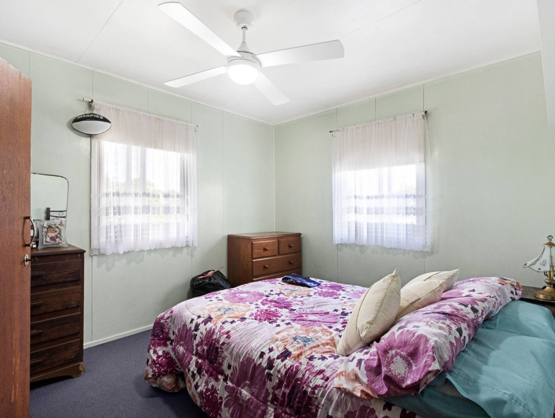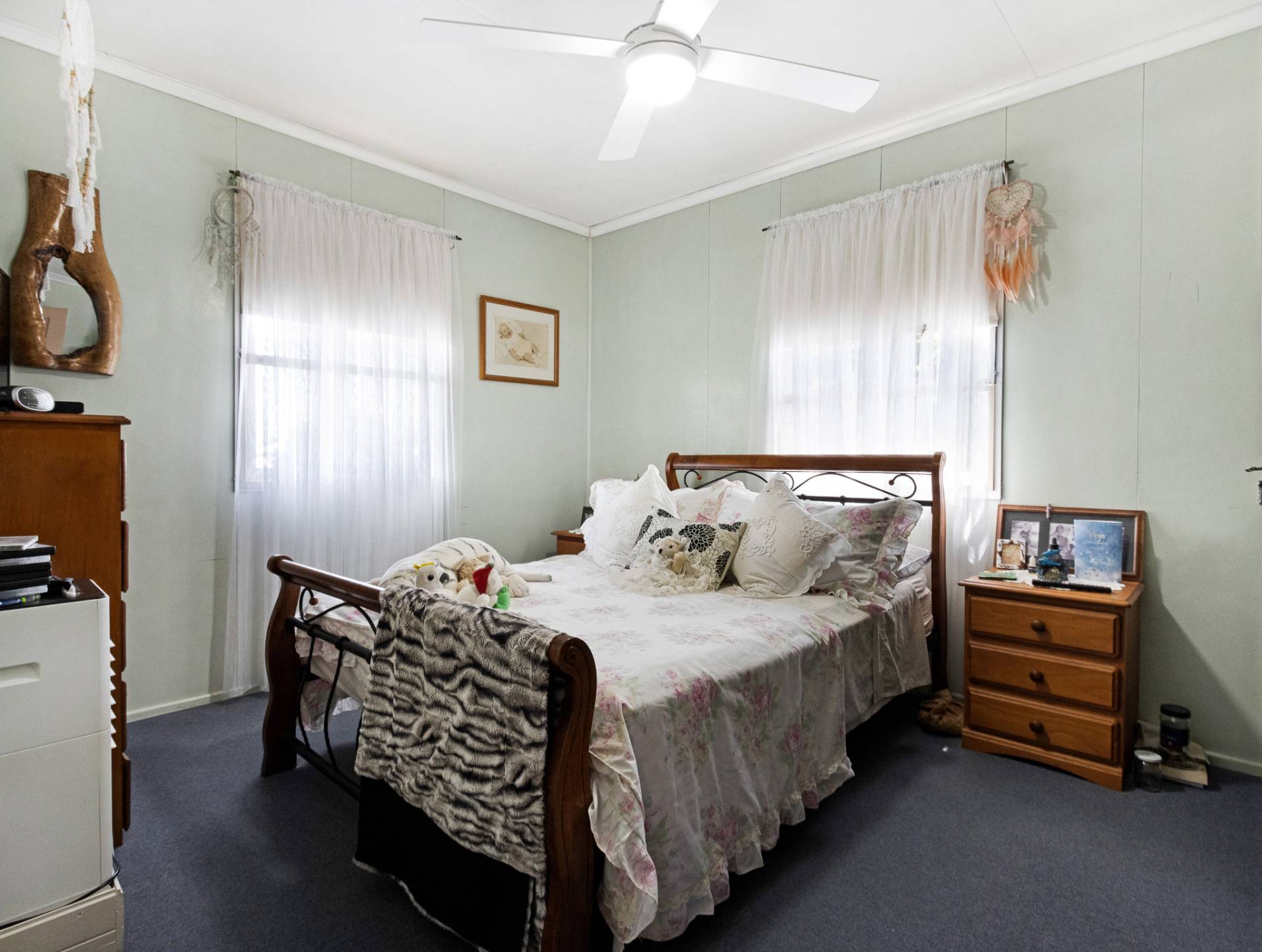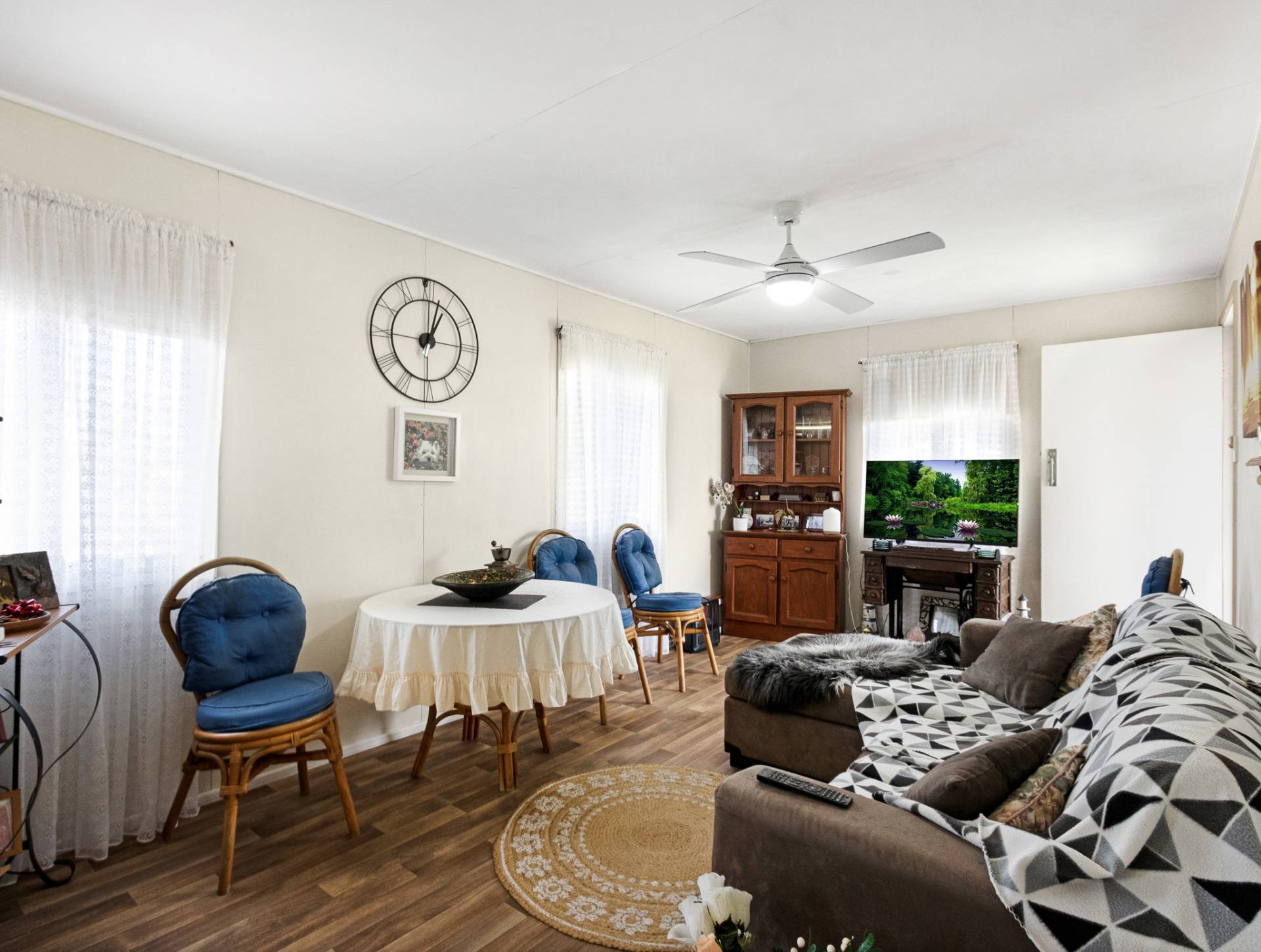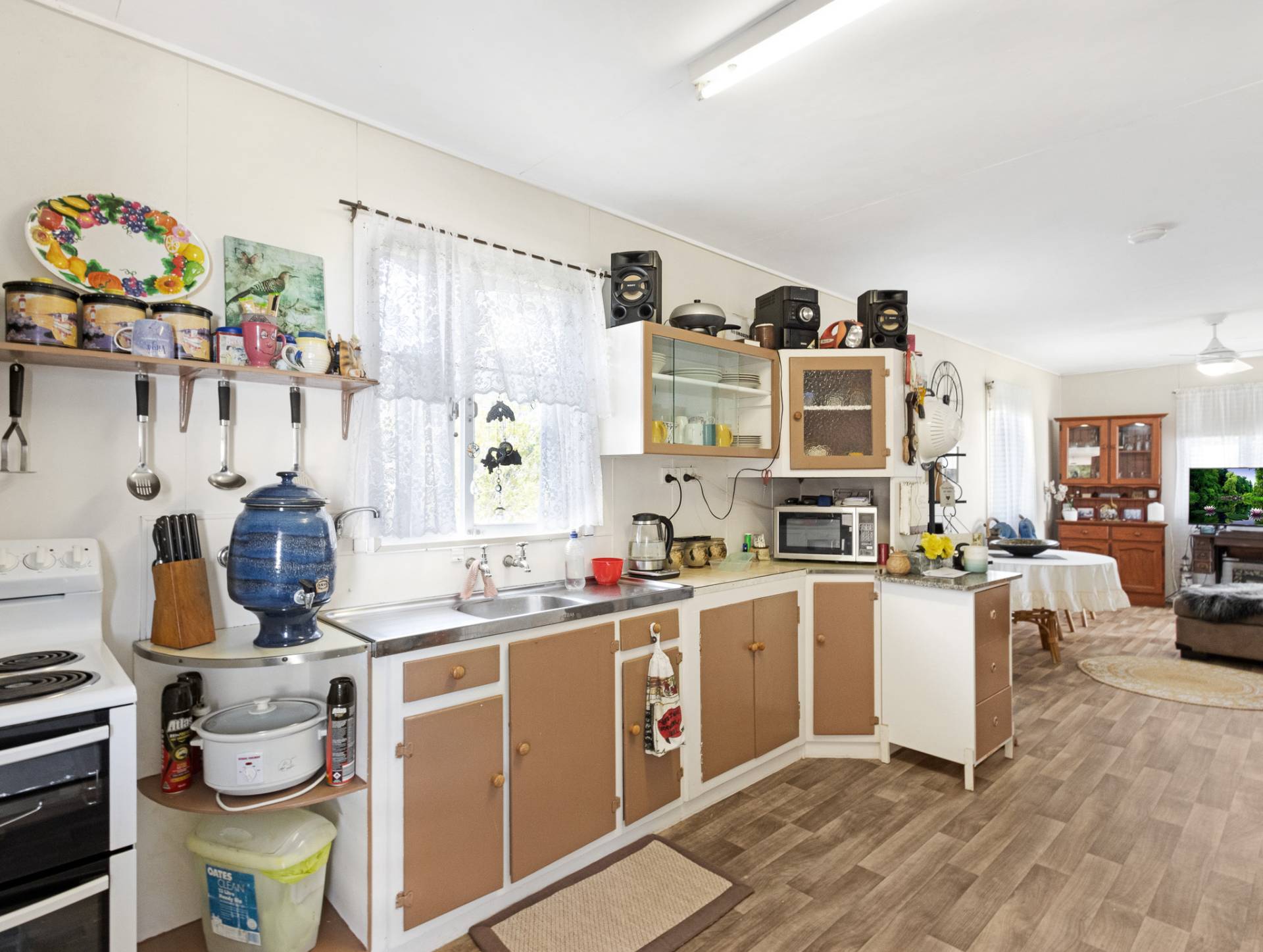 The home, with its comfortable open plan design, features two bedrooms, one-bathroom, a practical kitchen with stand-alone electric oven/stovetop and ceiling fans throughout.
