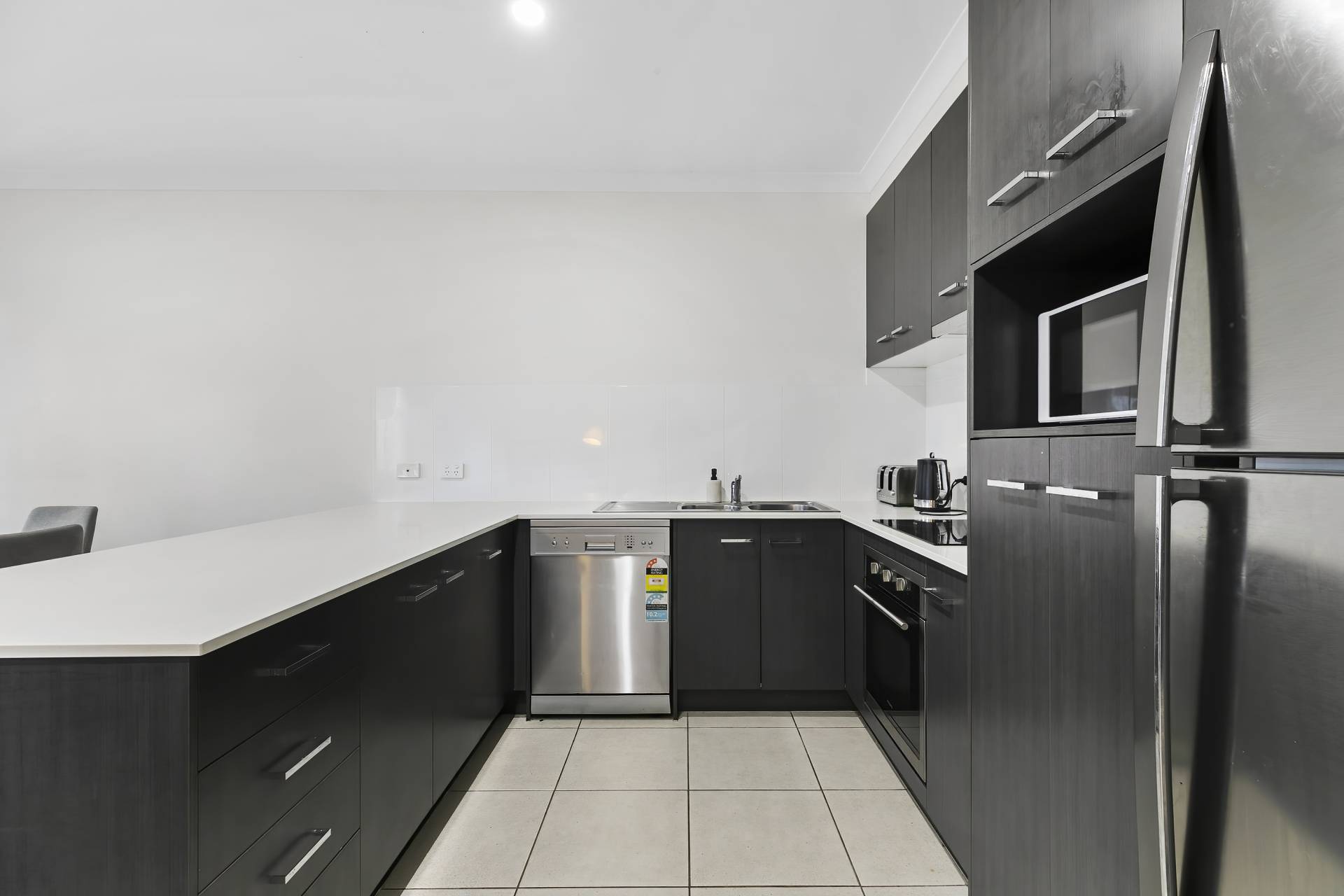 Well-appointed kitchen with stainless steel appliances, stone bench-tops, and under-stair storage