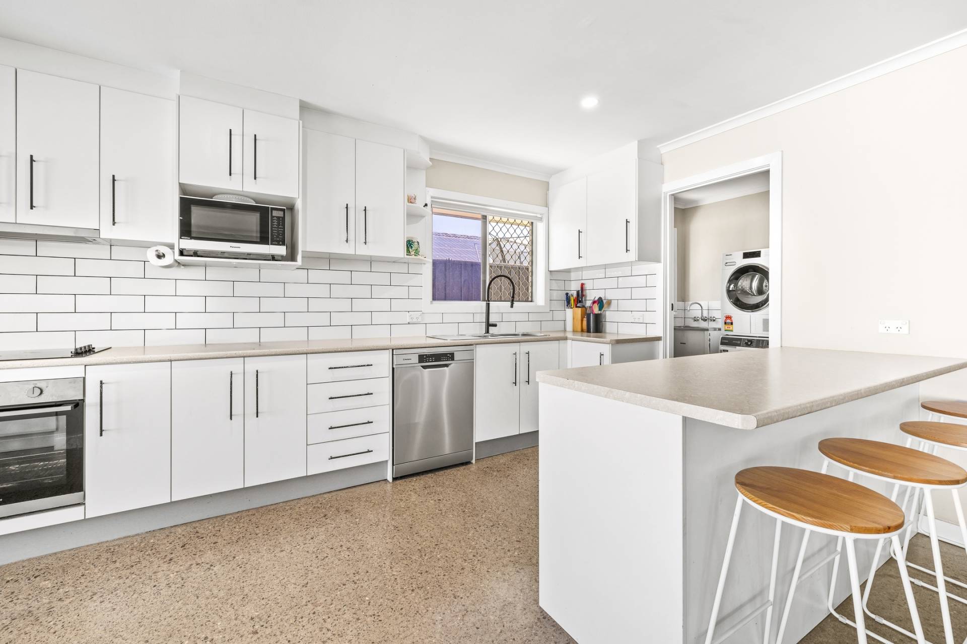 The kitchen is of a generous size with plenty of cupboard and bench space, a dishwasher and breakfast bar.