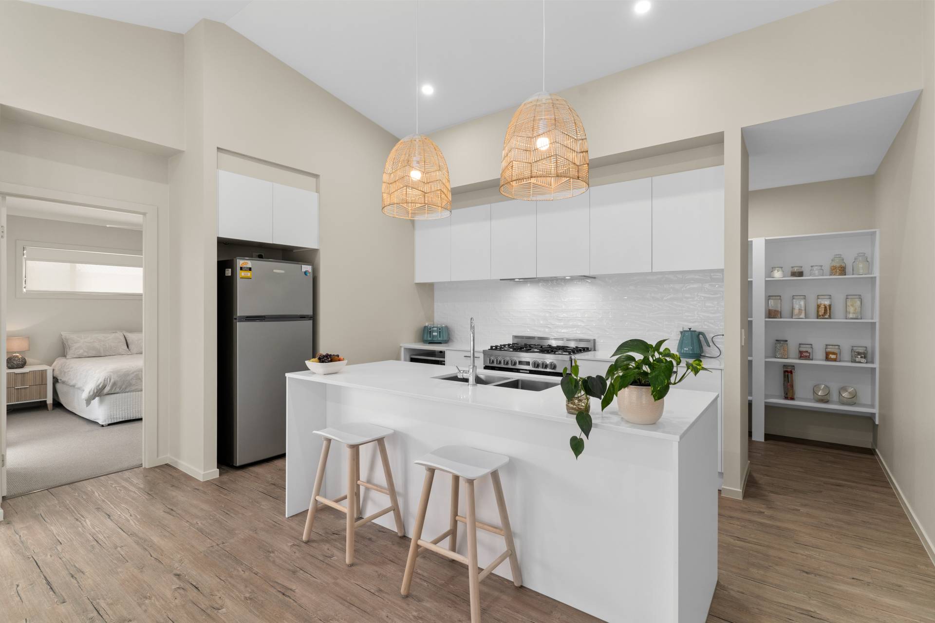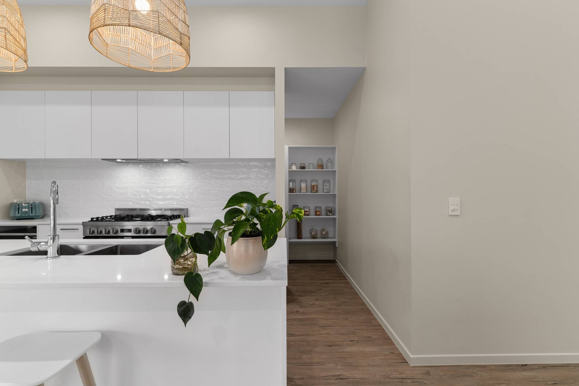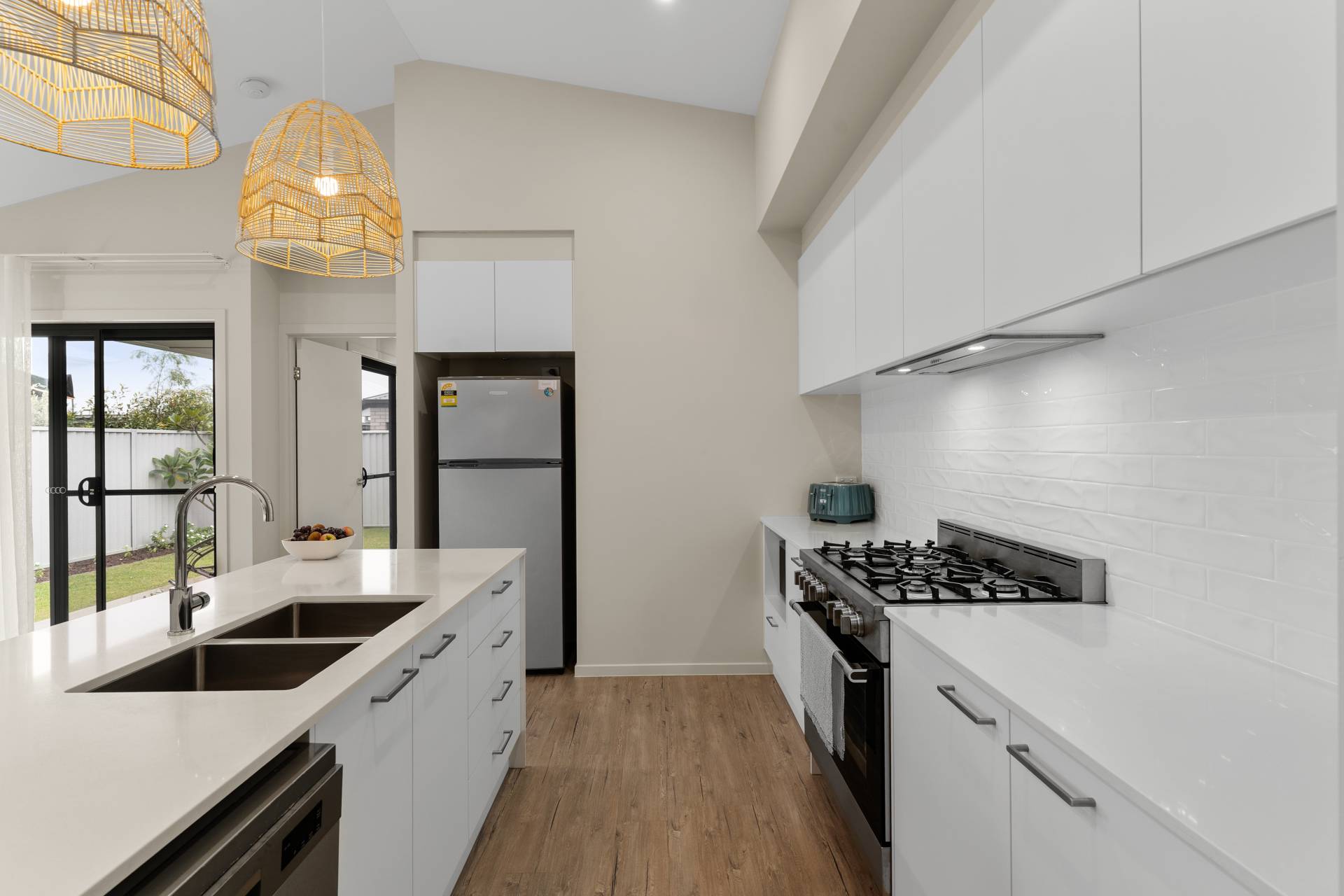 • Gourmet kitchen with 900mm gas cooktop, plumbed fridge tap, stone benches, and spacious walk-in pantry