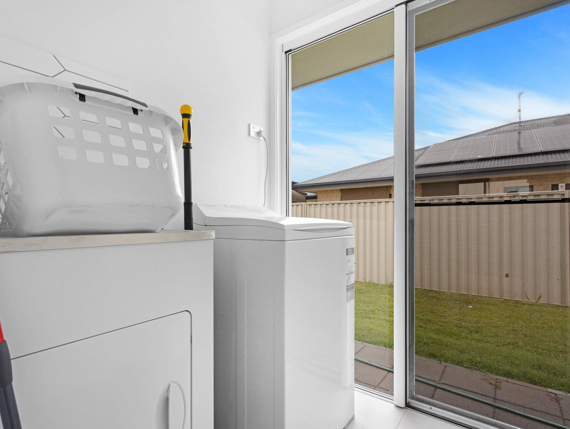 The kitchen, finished in crisp white cabinetry, eye catching splashback, island bench, dishwasher and plenty of storage and preparation space, even the most discerning home chef is bound to be impressed.