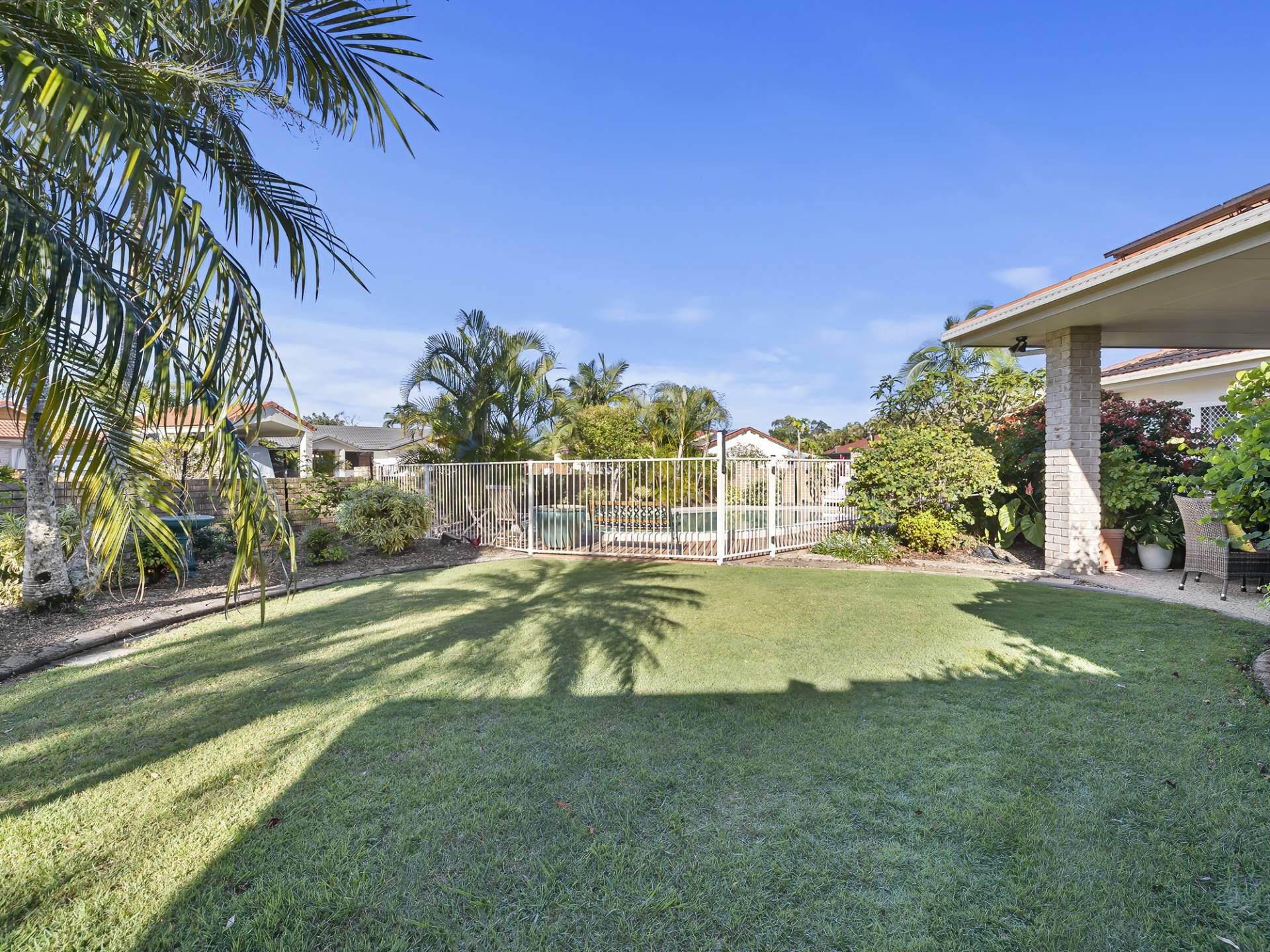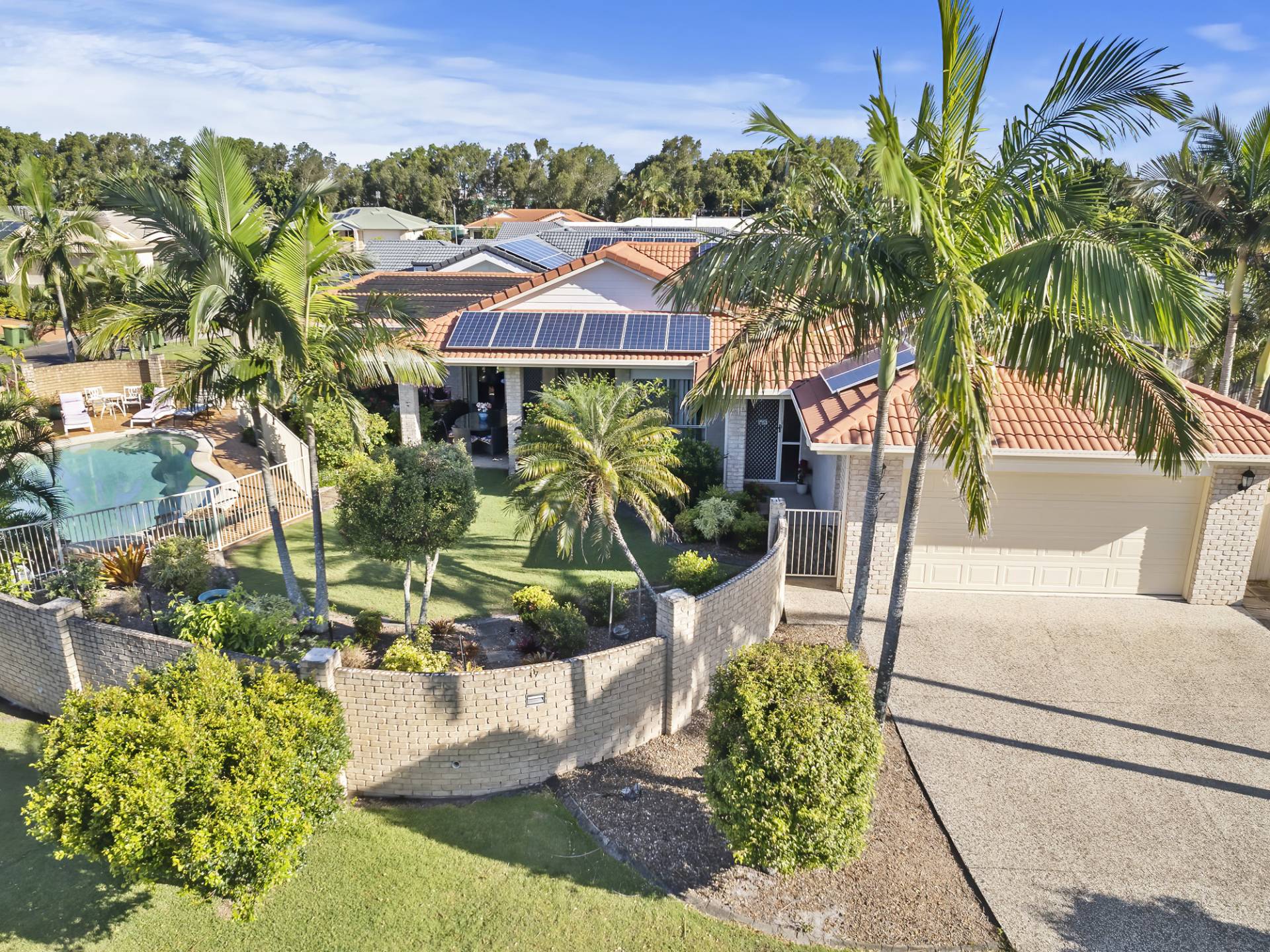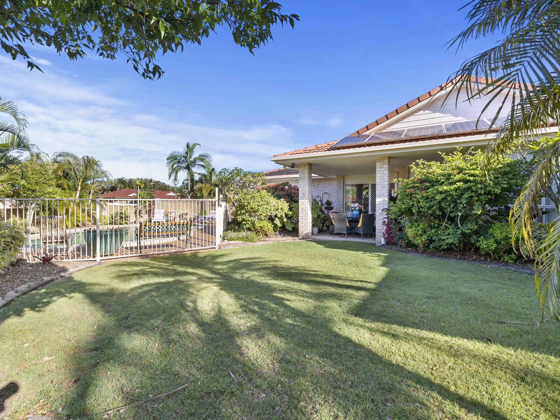 Lush tropical gardens overlook the sparkling solar heated inground swimming pool and the dual driveways offer secure storage for a large caravan or boat.