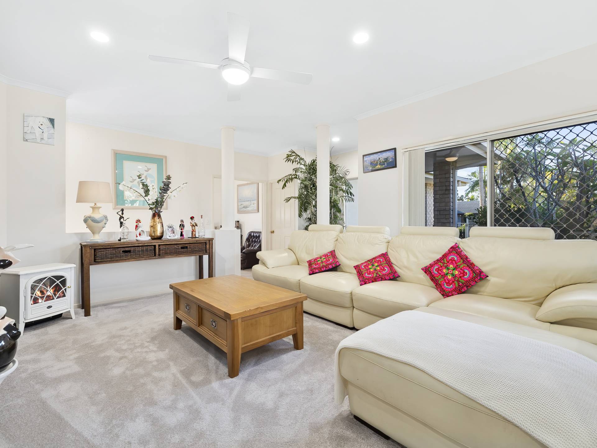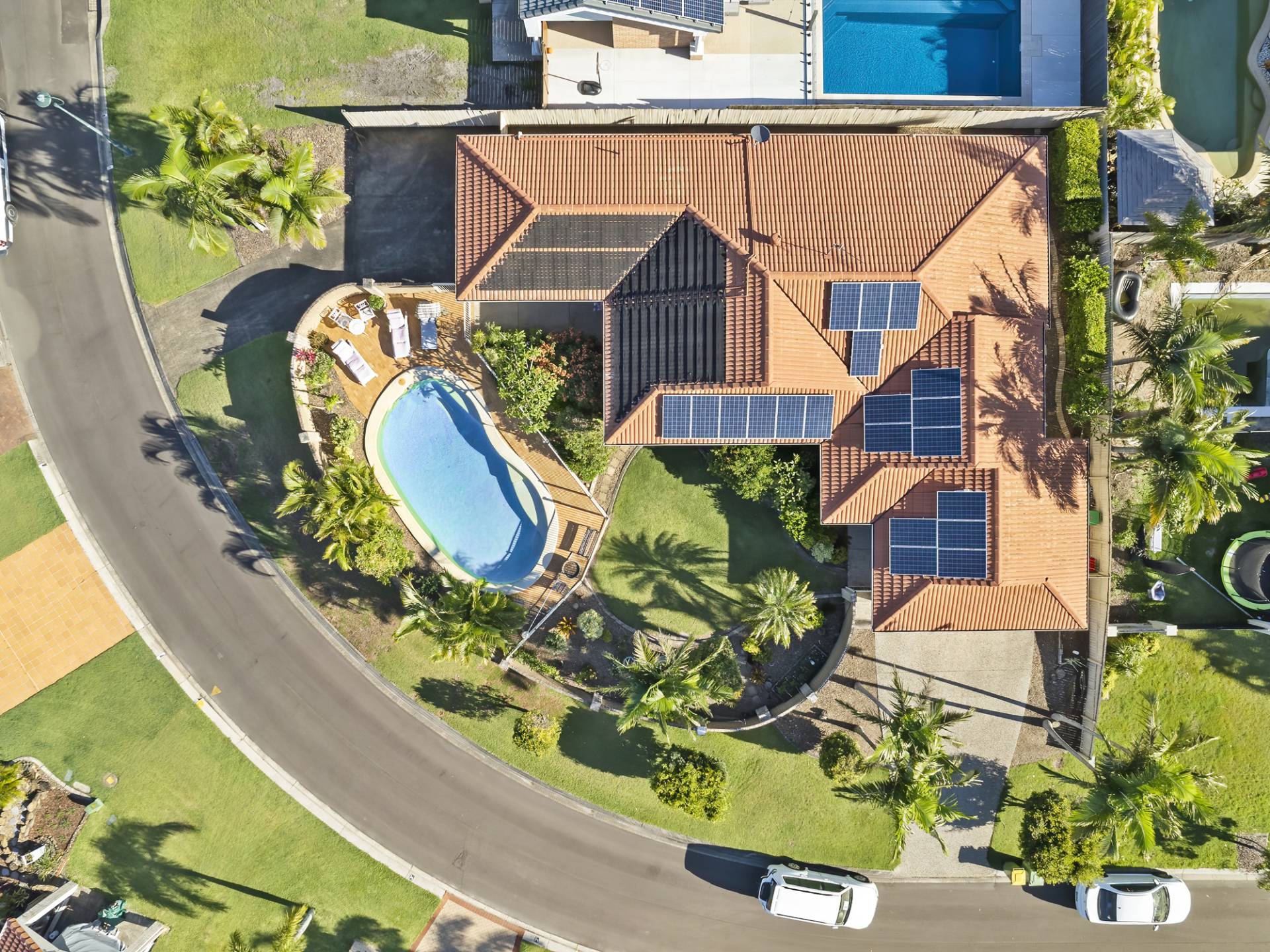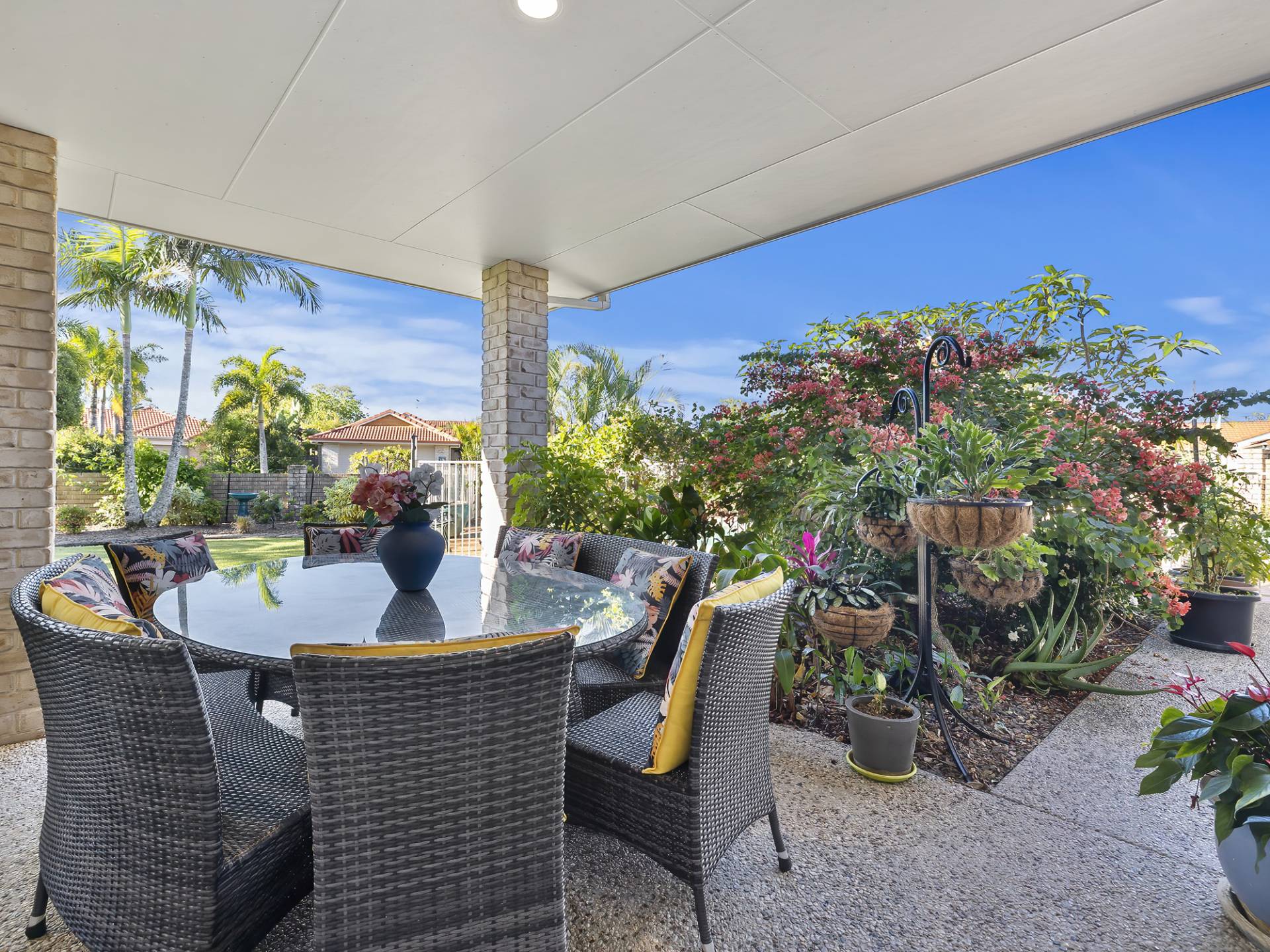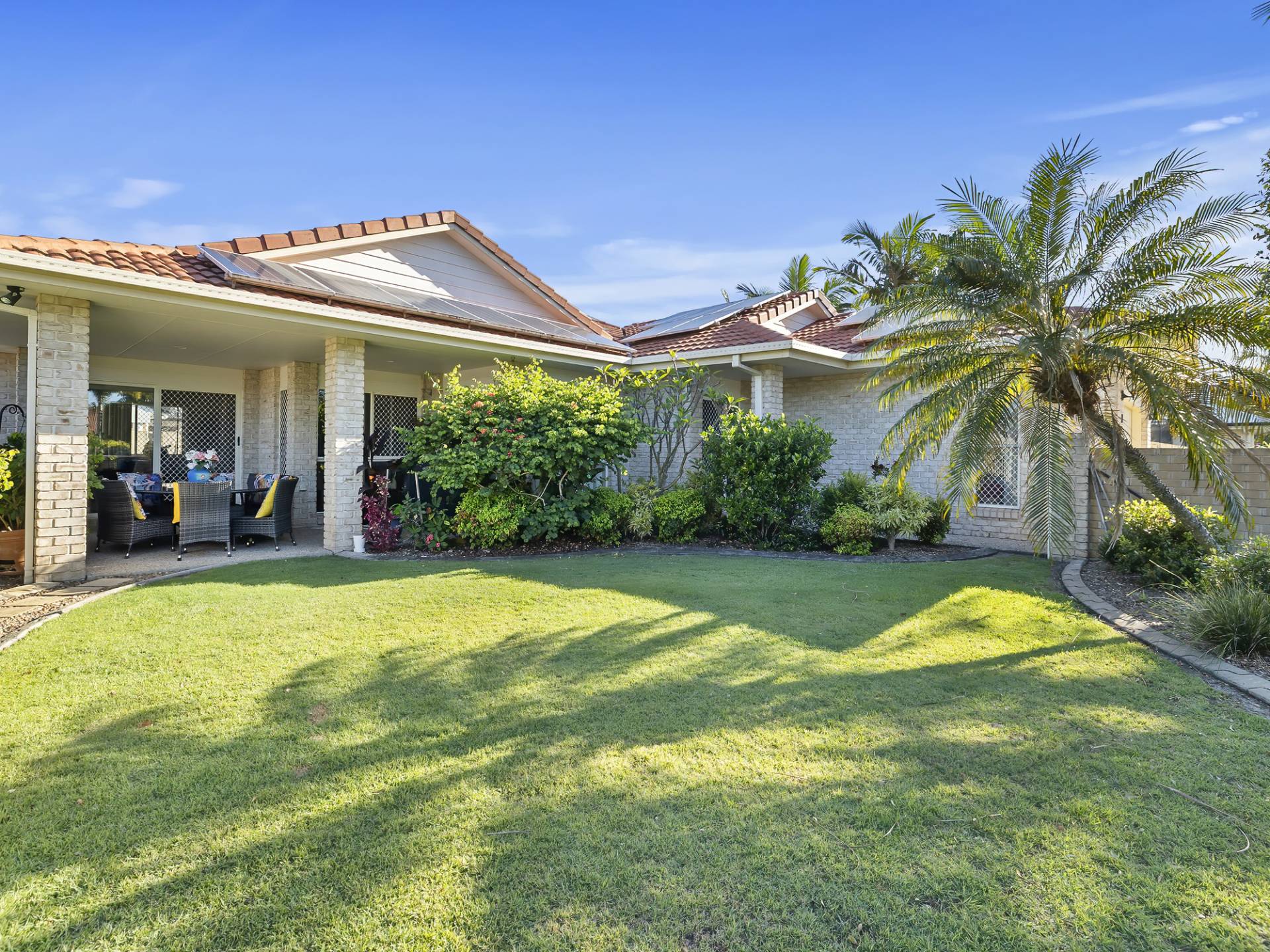Lush tropical gardens overlook the sparkling solar heated inground swimming pool and the dual driveways offer secure storage for a large caravan or boat.