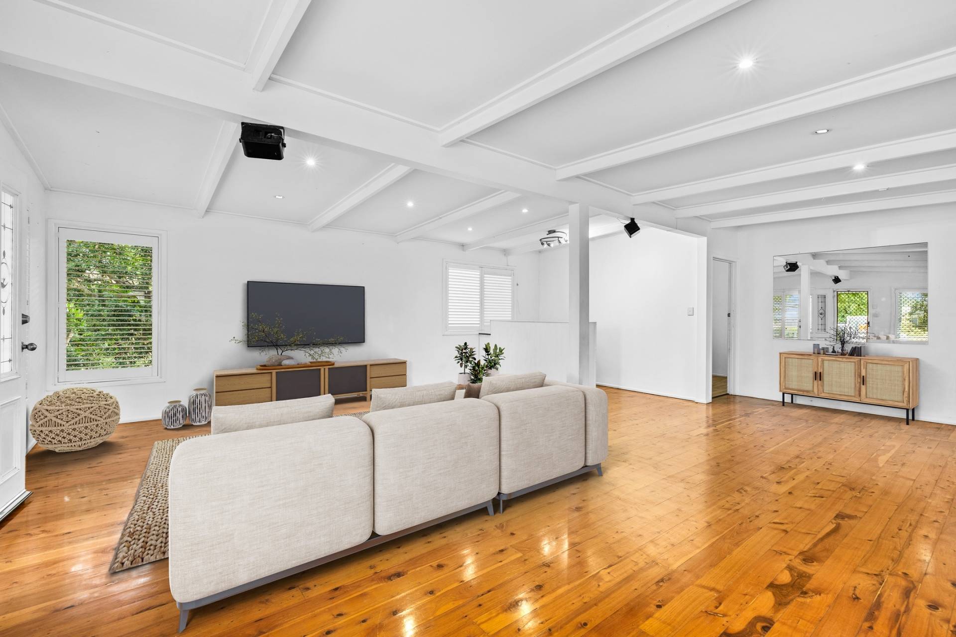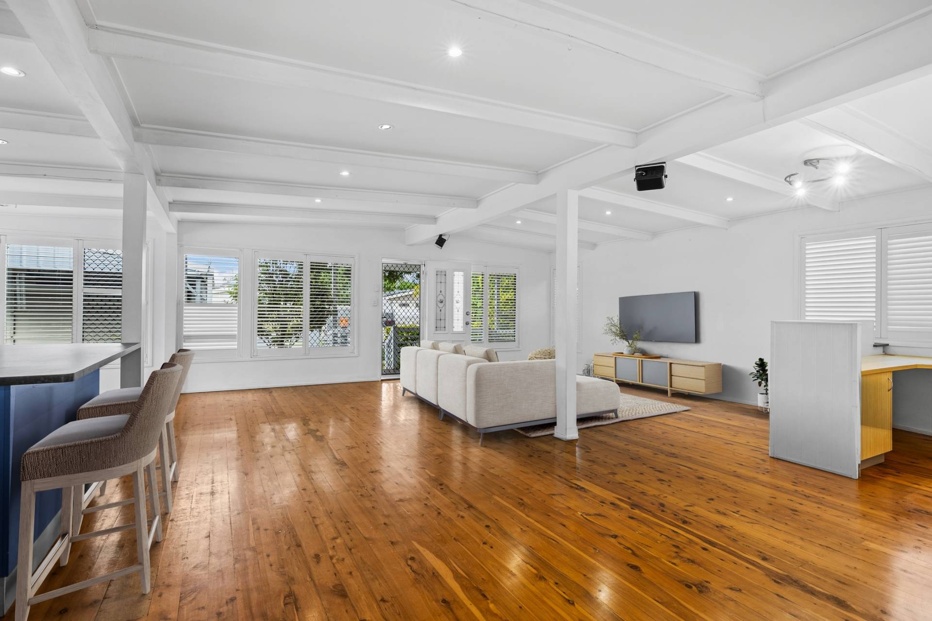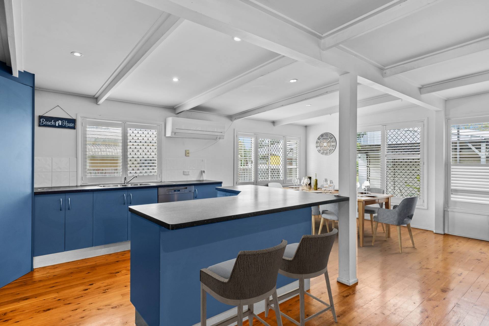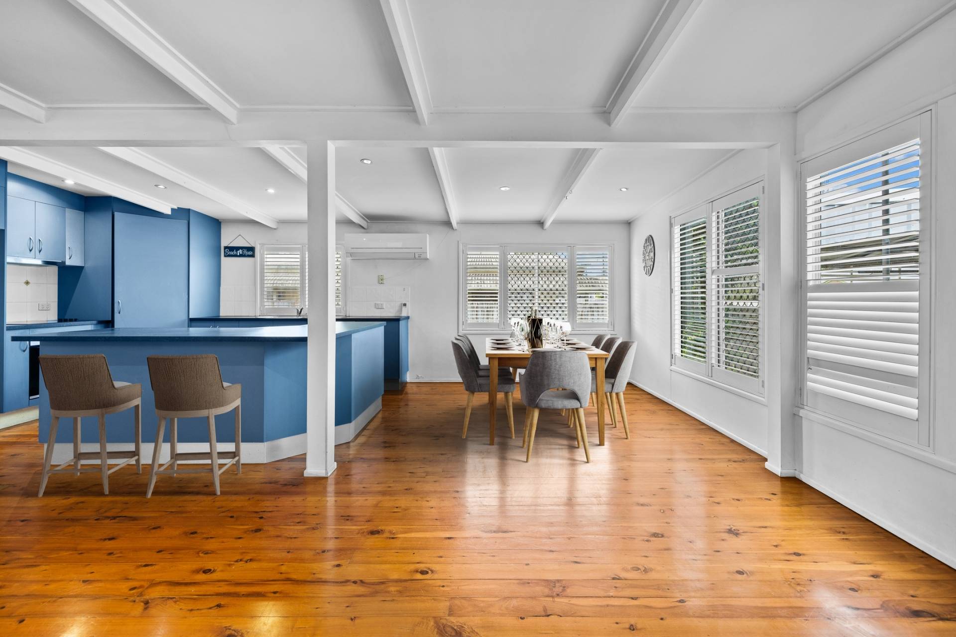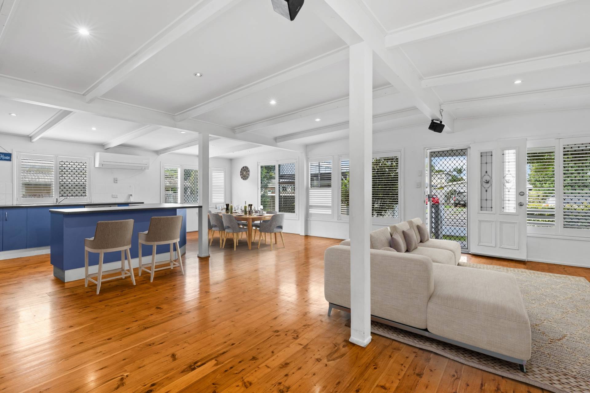 The heart of the home is air-conditioned and features an open-plan design combining the kitchen, dining, and living areas—ideal for family life and easy entertaining. With high ceilings and Baltic timber flooring throughout, the home exudes warmth, space, and timeless charm.