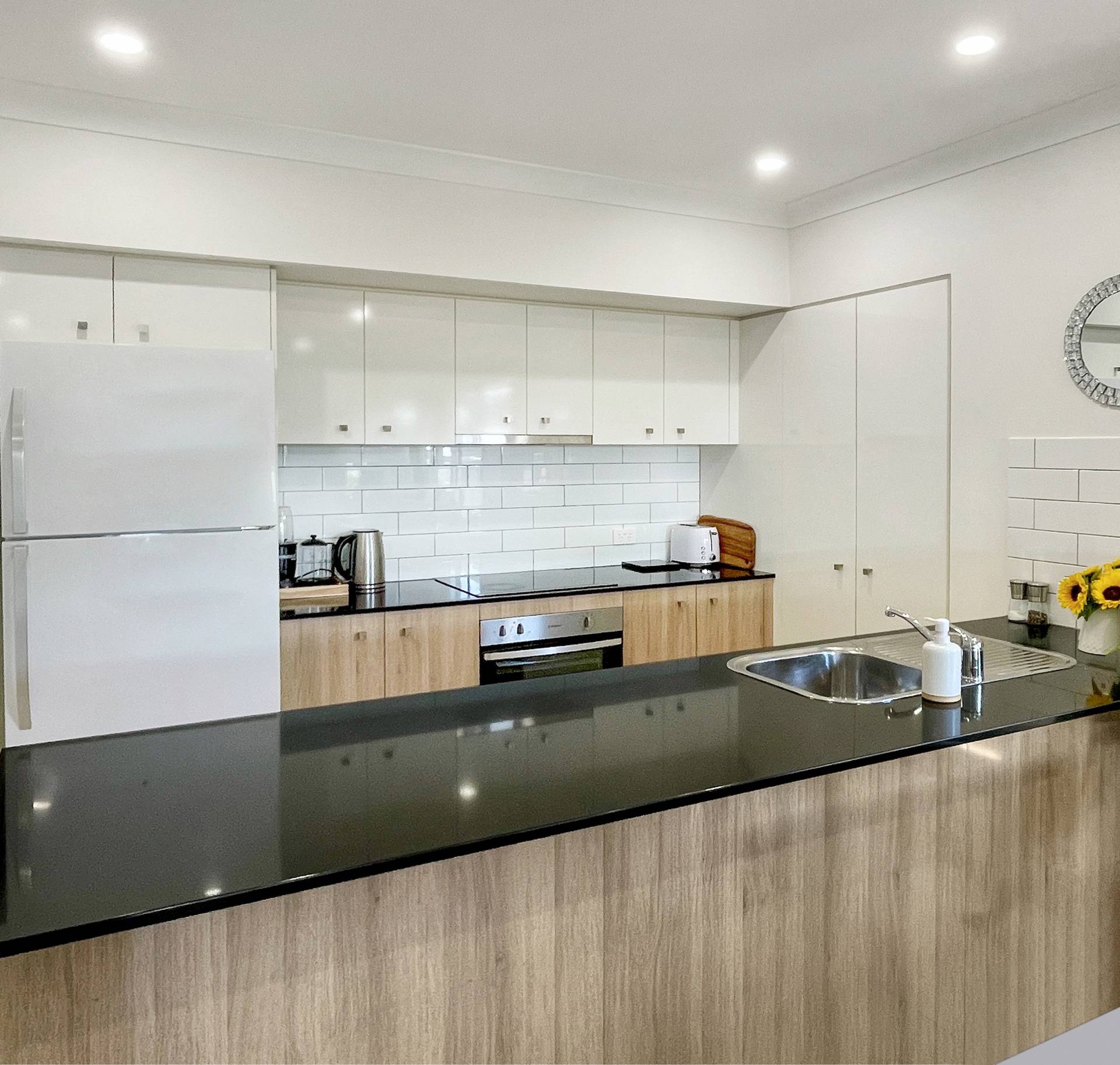 • Sleek, functional kitchen with striking black stone benchtops and a large pantry