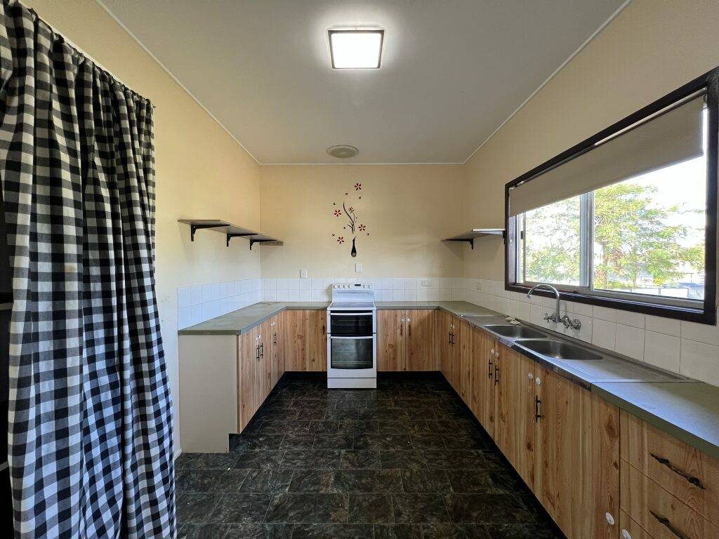 - Kitchen complete with an upright electric stove and ample storage cupboards