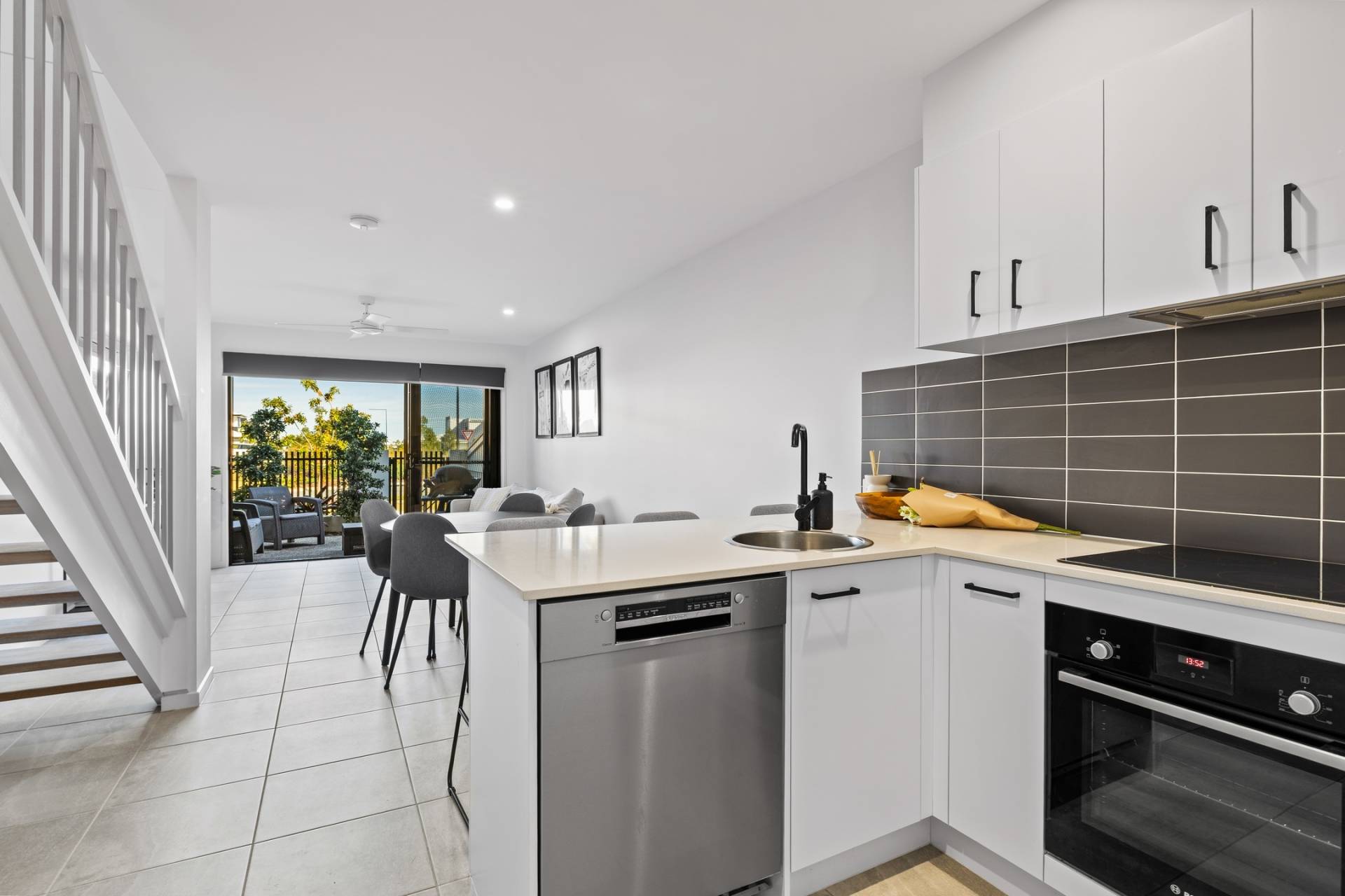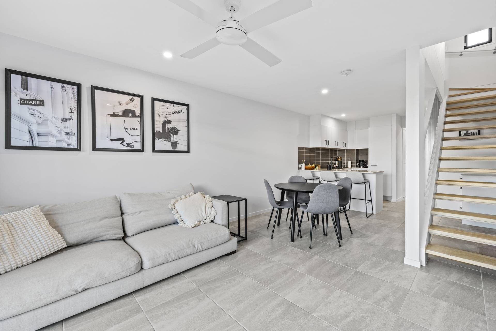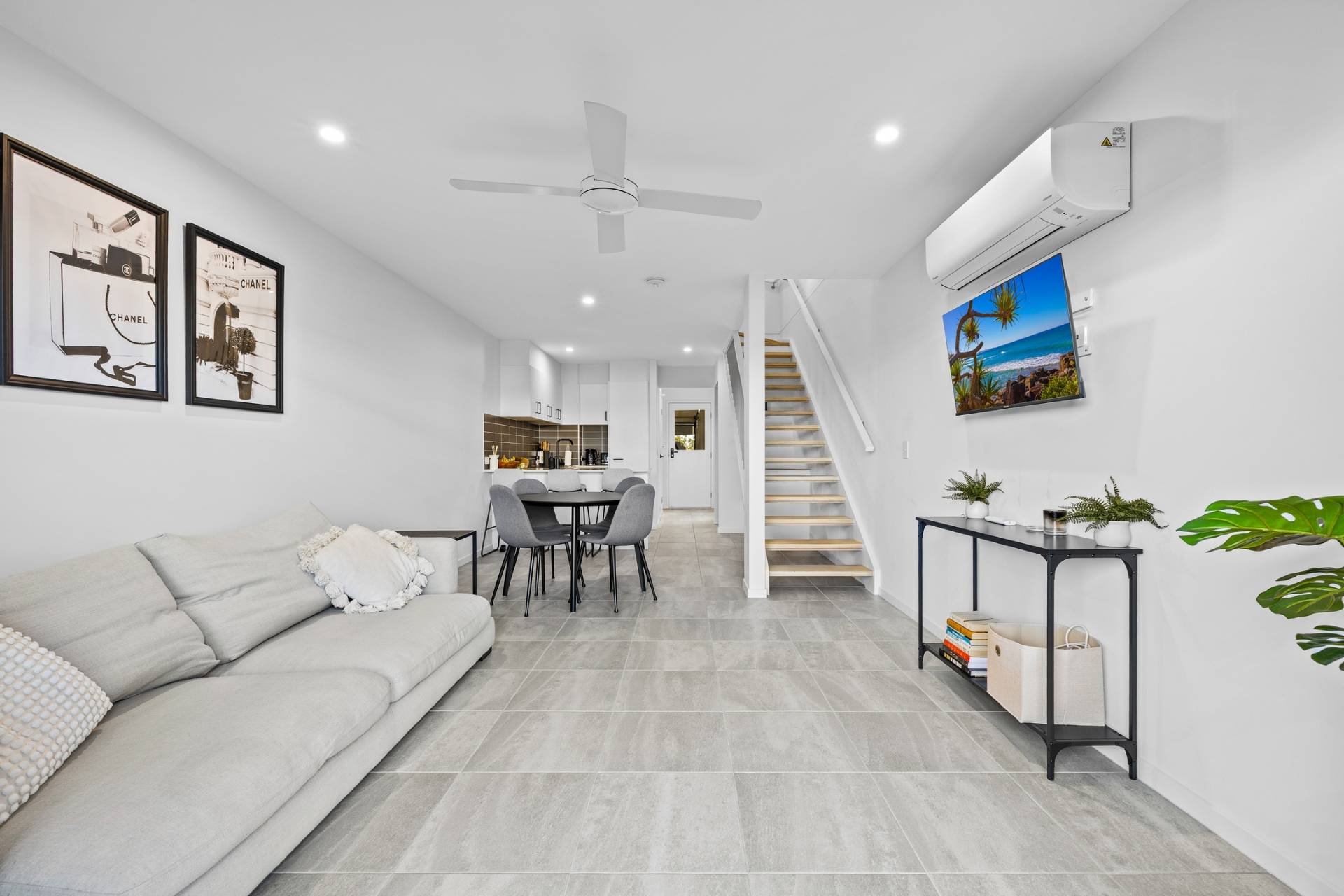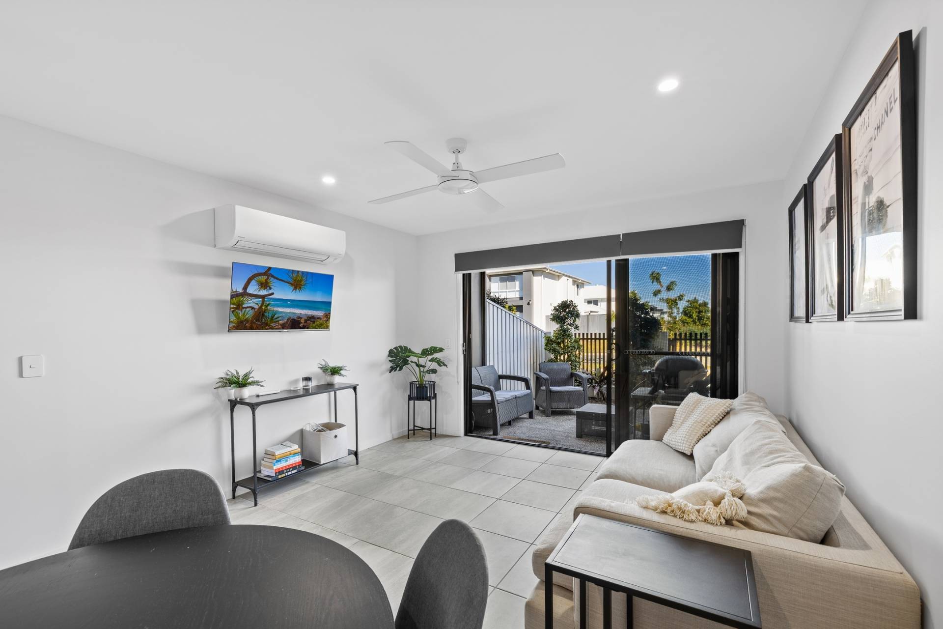 Inside the open plan living, dining, and kitchen area is light-filled and enhanced by neutral tones, tiled flooring, and a split system air-conditioner for year-round comfort.