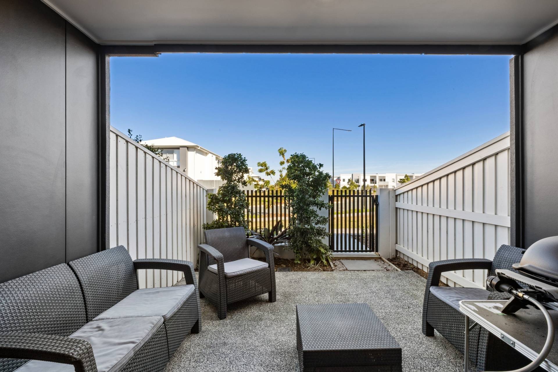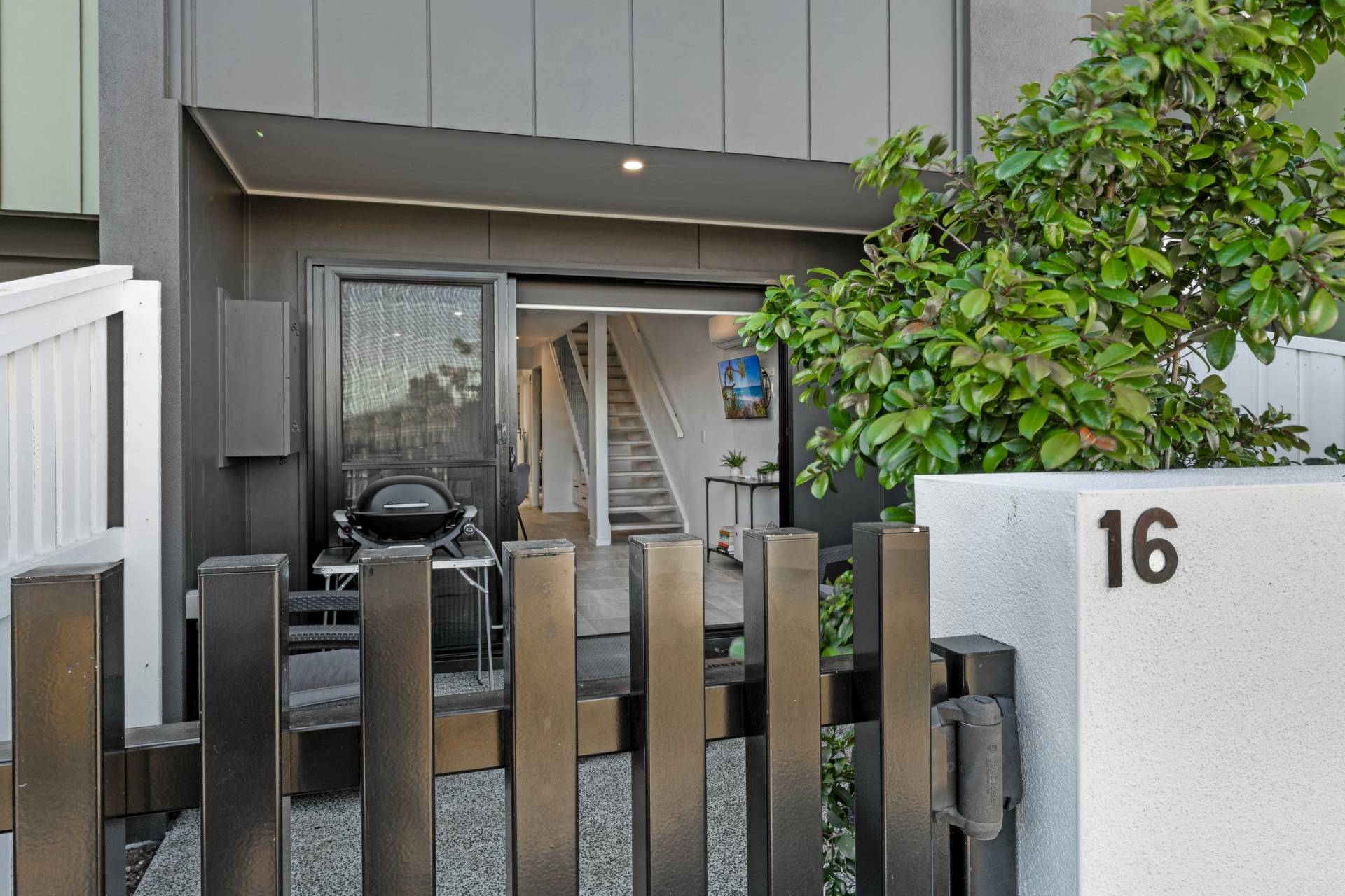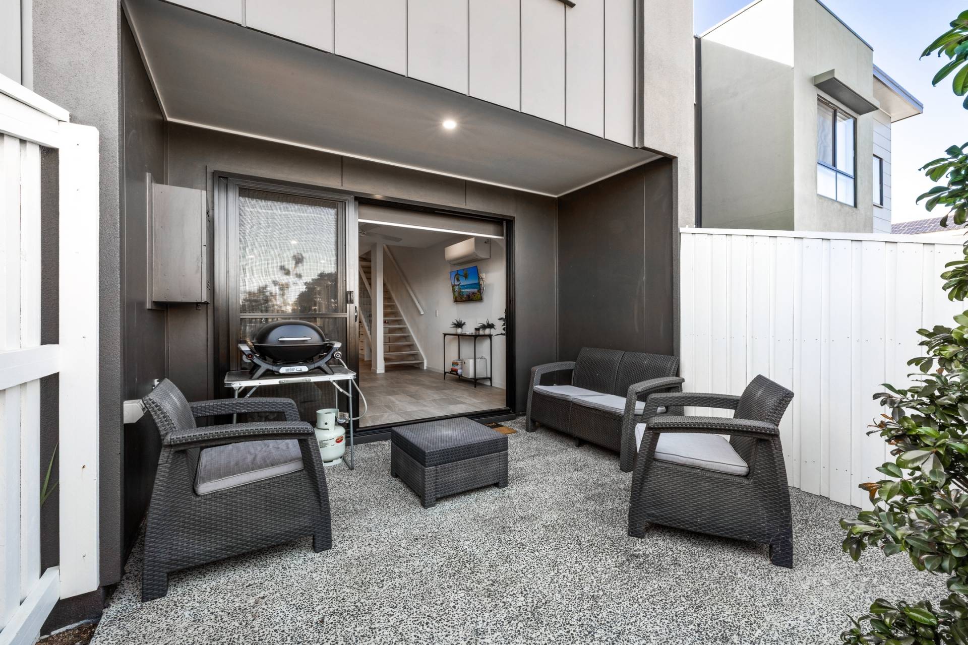 The home welcomes you with a private front courtyard, ideal for enjoying your morning coffee or hosting casual BBQs with friends and family.