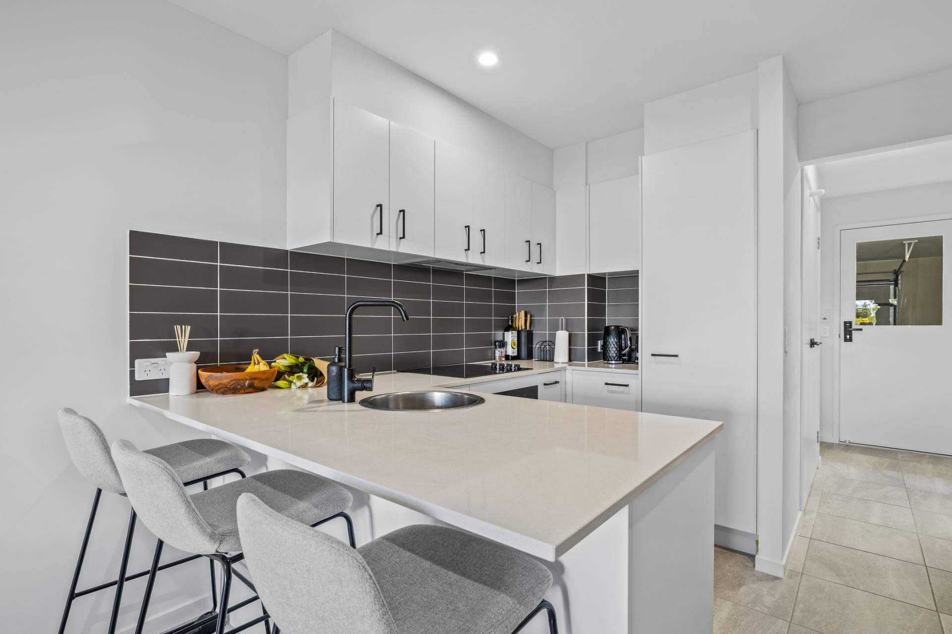 The modern kitchen features stone benchtops, a breakfast bar, and ample storage space—perfect for both daily living..