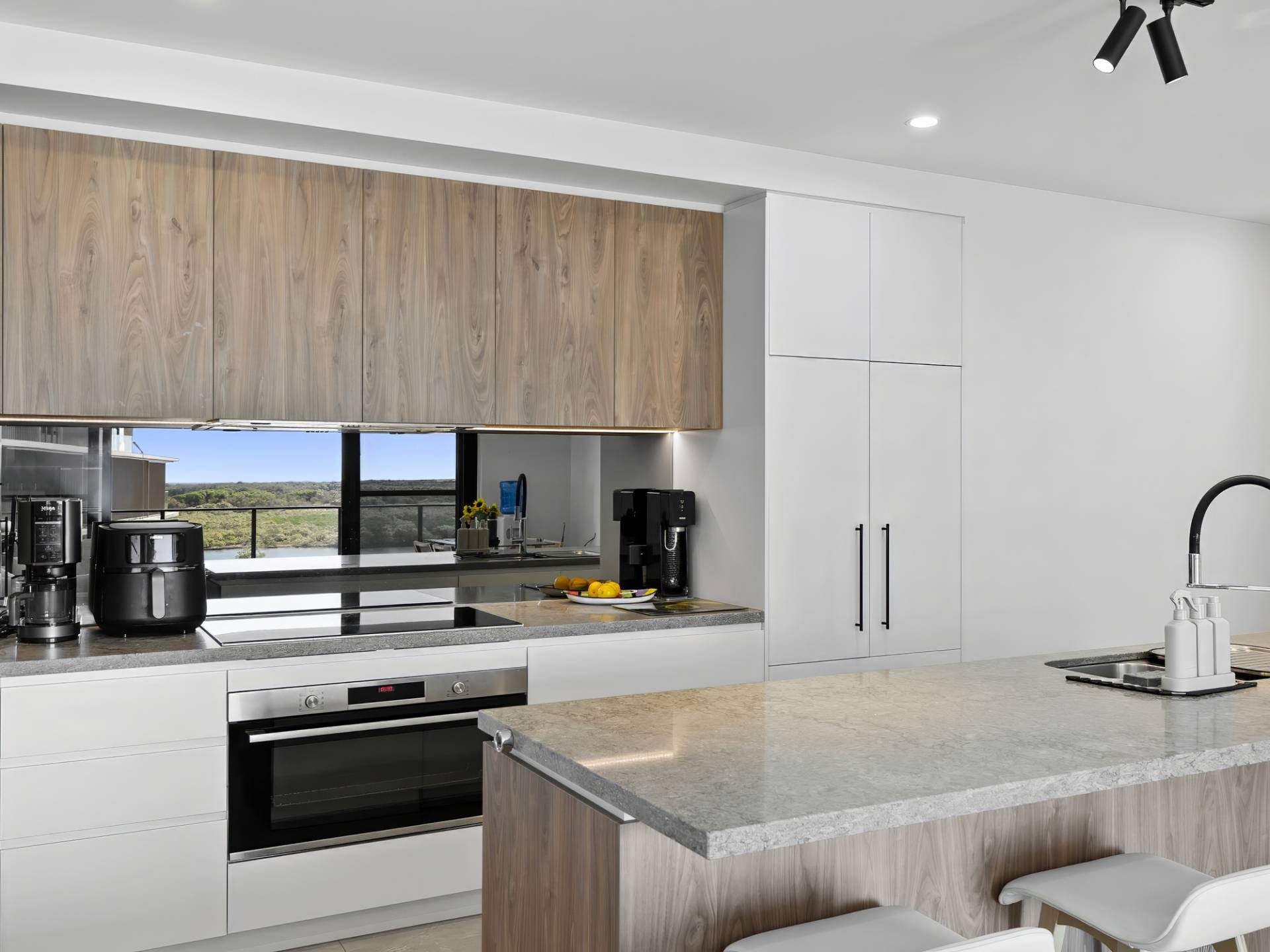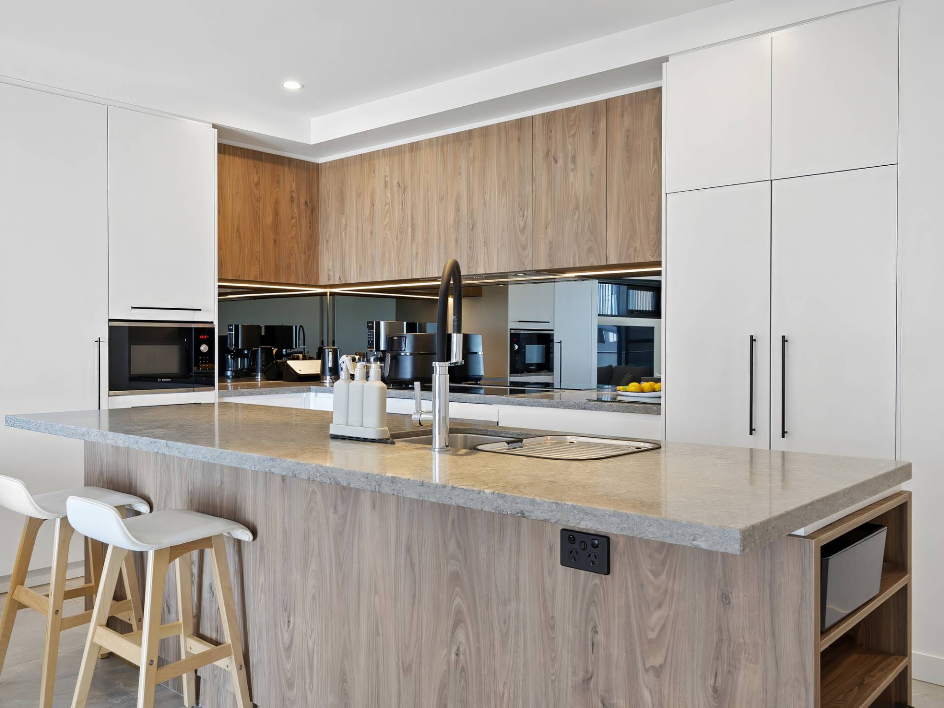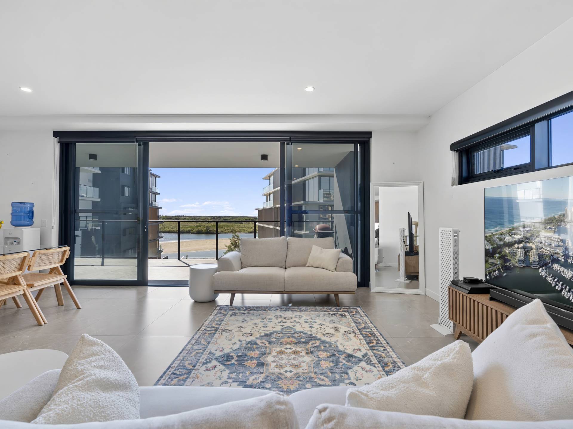 The chic kitchen is a statement in both form and function, featuring sleek stone benchtops, premium appliances, and generous storage. This space flows effortlessly in to the open-plan living and dining area, where sliding glass doors open to a large north-facing balcony - an ideal space for entertaining. This area captures a tranquil outlook toward the Maroochy River.