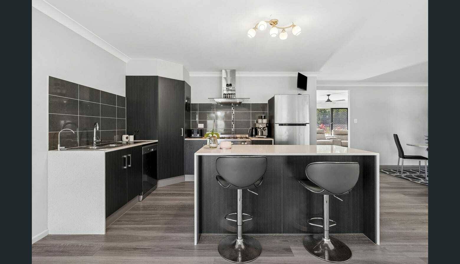 Step inside to a light-filled, open-plan layout connecting the living, dining, and family areas. The well-equipped kitchen features 20mm stone benchtops, a gas cooktop, dishwasher, and breakfast bar. A 5kW air conditioner keeps the main living zone comfortable year-round.