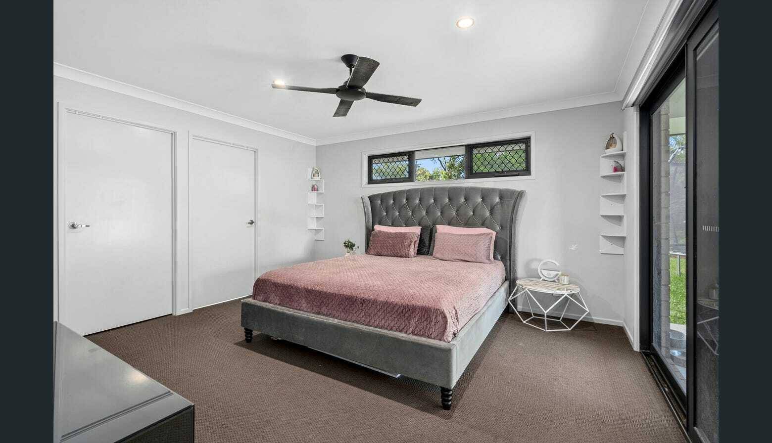 The king-sized master bedroom includes a walk-in wardrobe, ensuite, 2.5kW air conditioner, and direct access to the covered alfresco area. All additional bedrooms feature built-in wardrobes and ceiling fans.