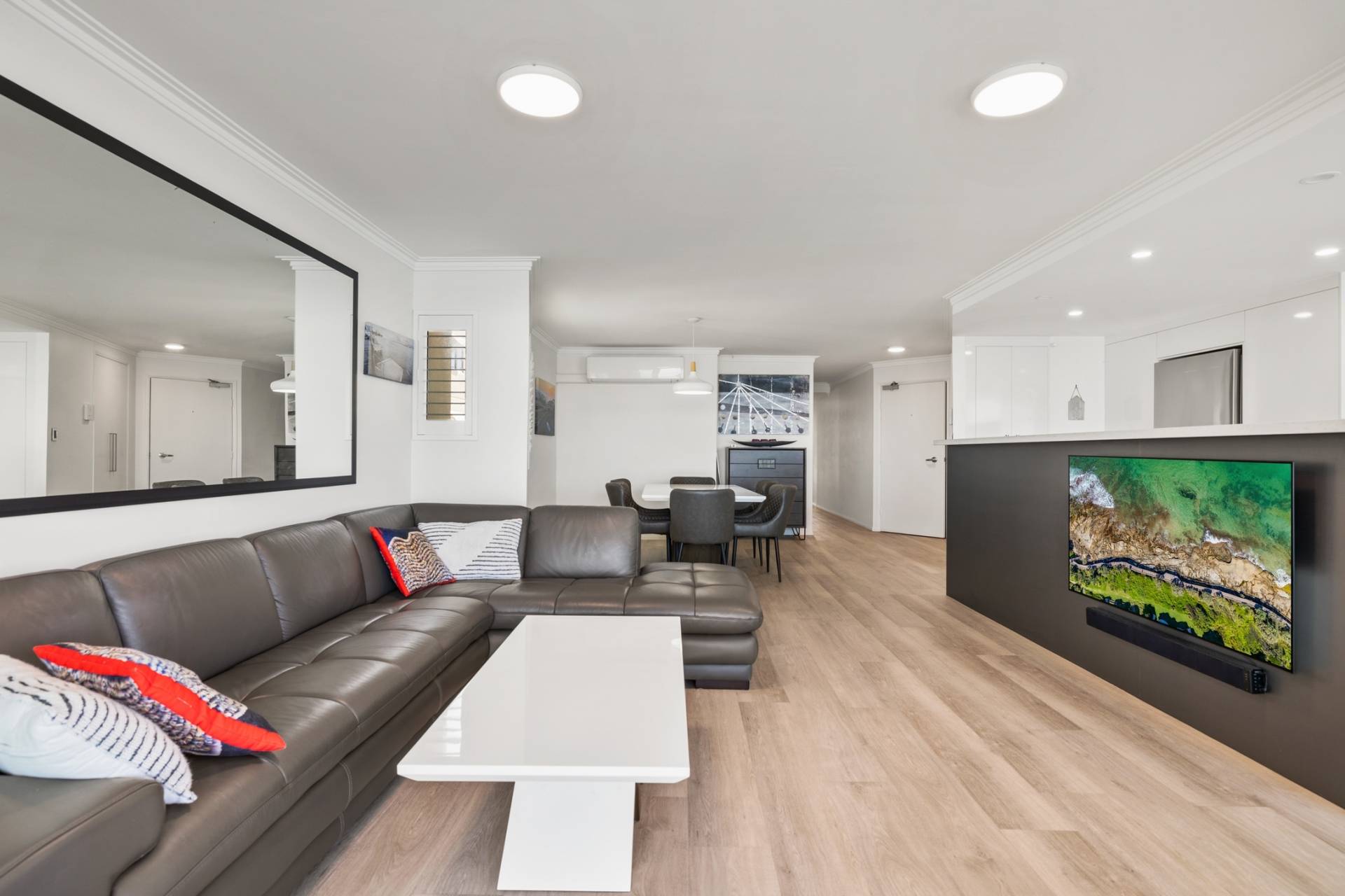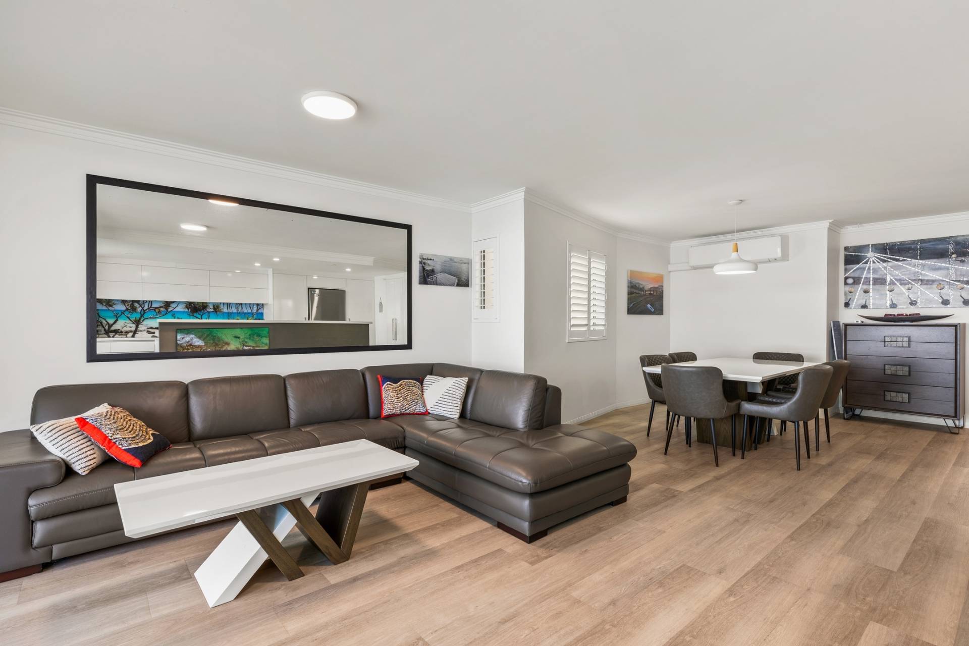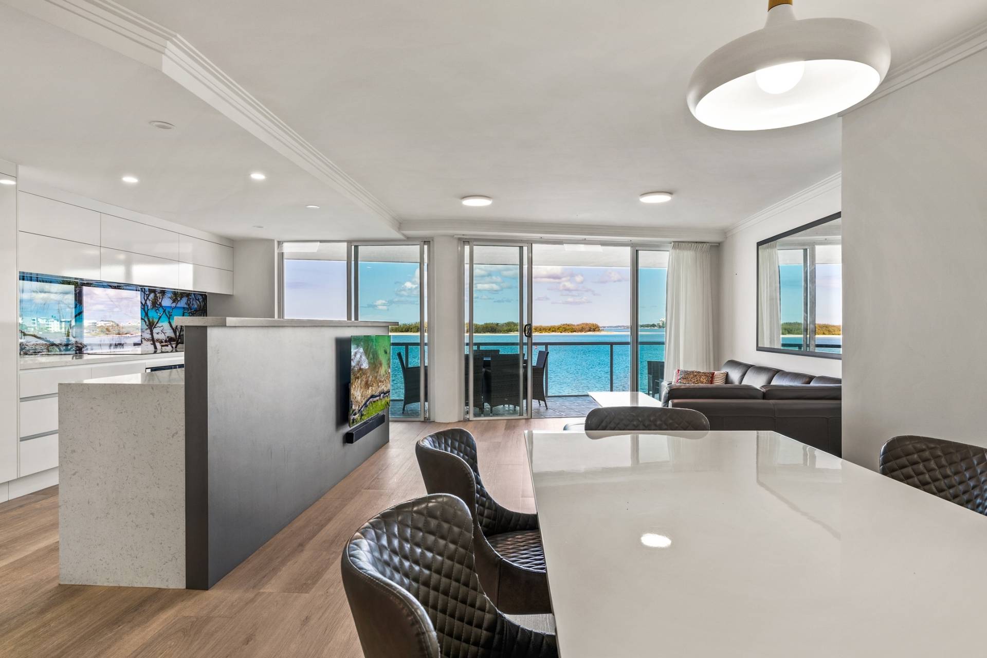 From the moment you enter, the sense of light, space, and connection to the water is undeniable. The expansive open plan living, dining, and kitchen area is bathed in natural light, flowing effortlessly through sliding glass doors to an undercover balcony that captures sweeping panoramas over Golden Beach, across to Bribie Island, and out to the sparkling waters of Moreton Bay.