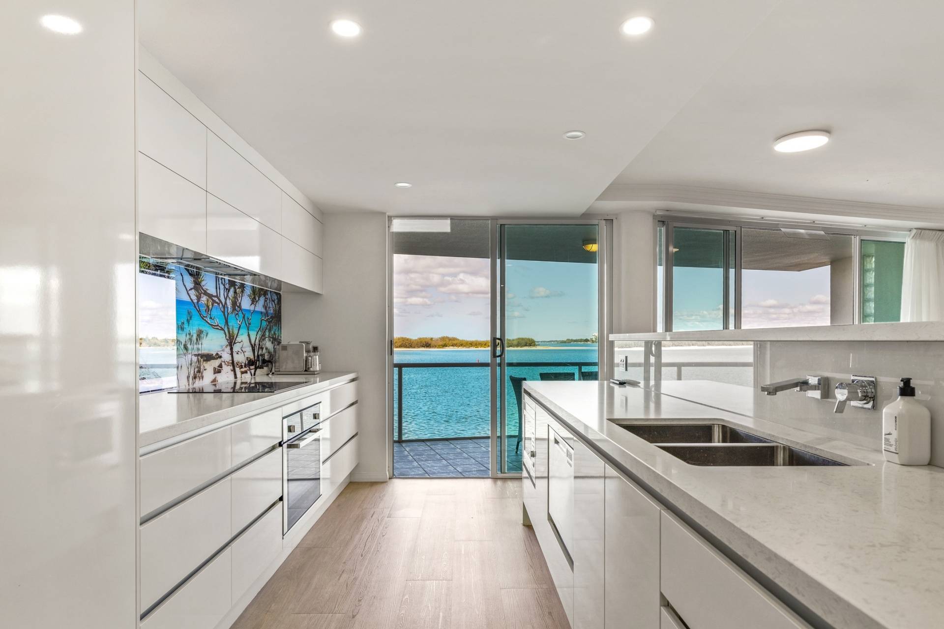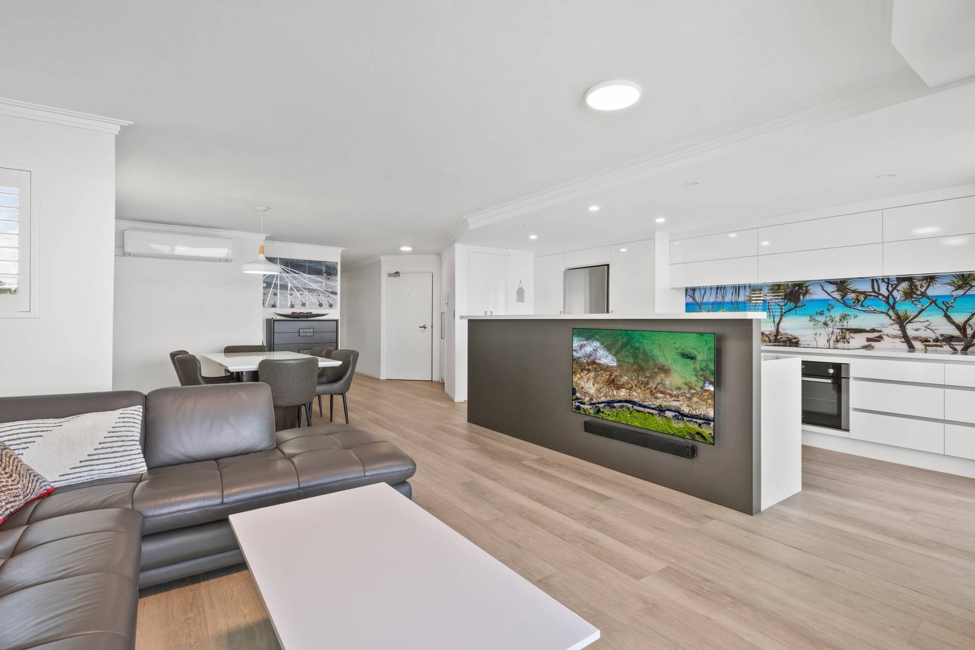 The kitchen is both impressive in scale and impeccable in style, offering abundant storage, sleek cabinetry, and quality stainless-steel appliances, including a built-in dishwasher, microwave, and fridge-freezer, all included in the sale. A striking feature splashback depicting one of the Sunshine Coast’s stunning beaches at Noosa adds a unique designer touch that will be a talking point of visitors.