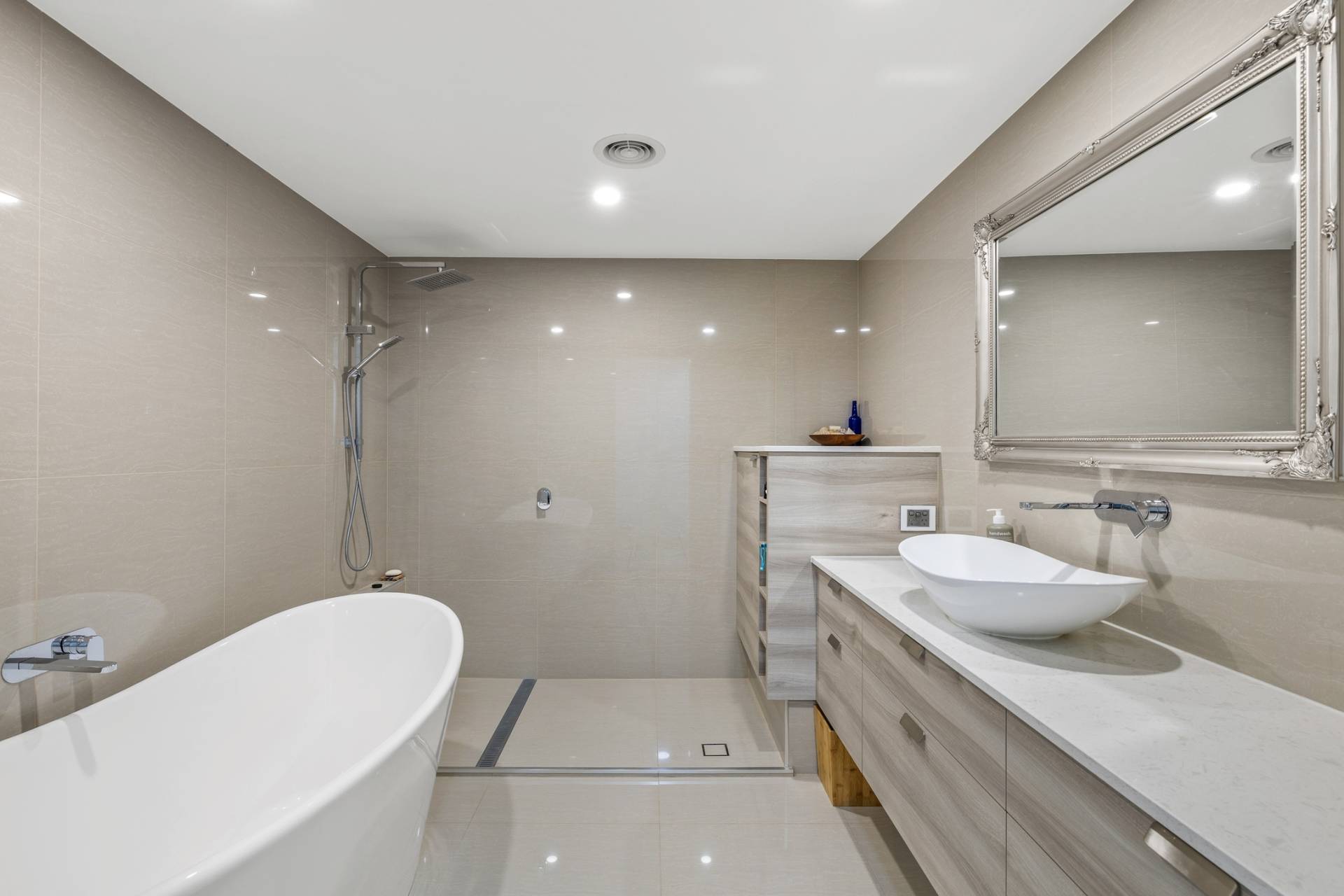 The main bathroom is beautifully appointed, featuring a freestanding designer bathtub, quality cabinetry, and a washing machine that will remain with the property at sale.