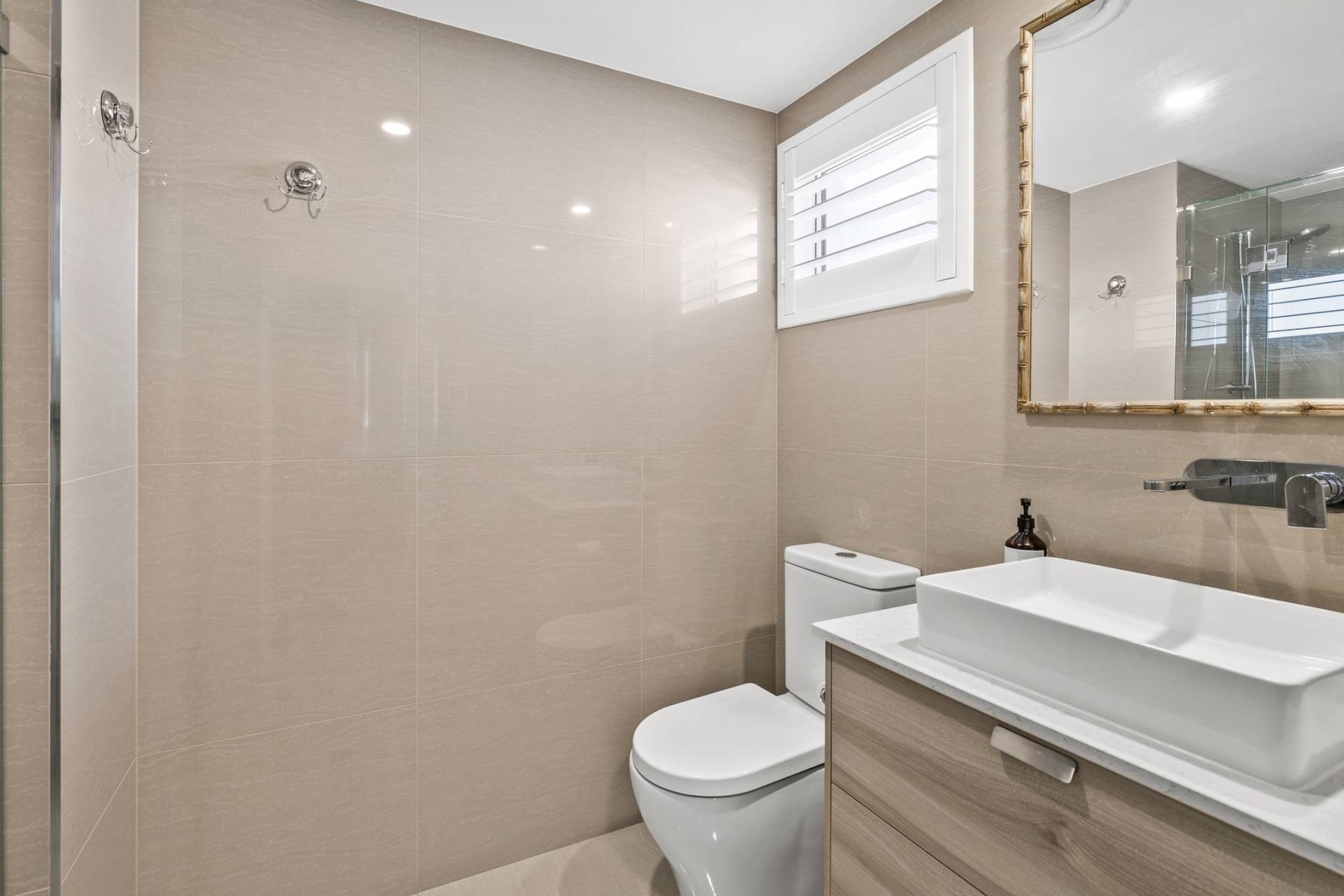 The thoughtfully designed interior, featuring white plantation shutters and a soft neutral colour palette, creates an elegant backdrop to the breathtaking water views