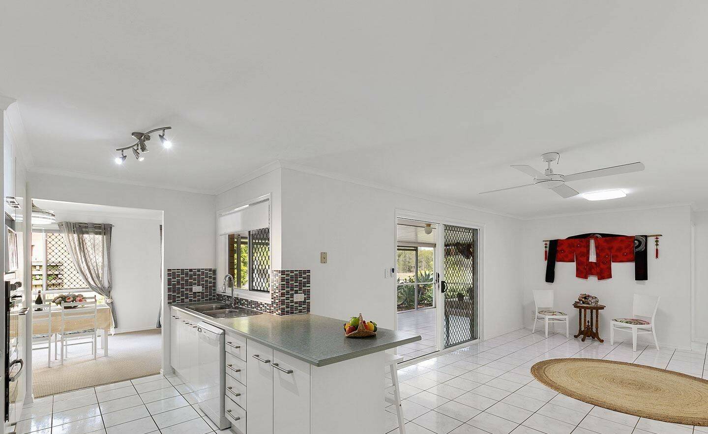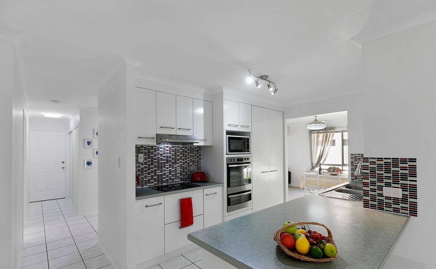 The kitchen has been finished in crisp white cabinetry with feature tile accents. With breakfast bar benchtop, electric cooktop, electric oven, dishwasher and double door pantry this space ensures cooking for family and friends is a breeze.