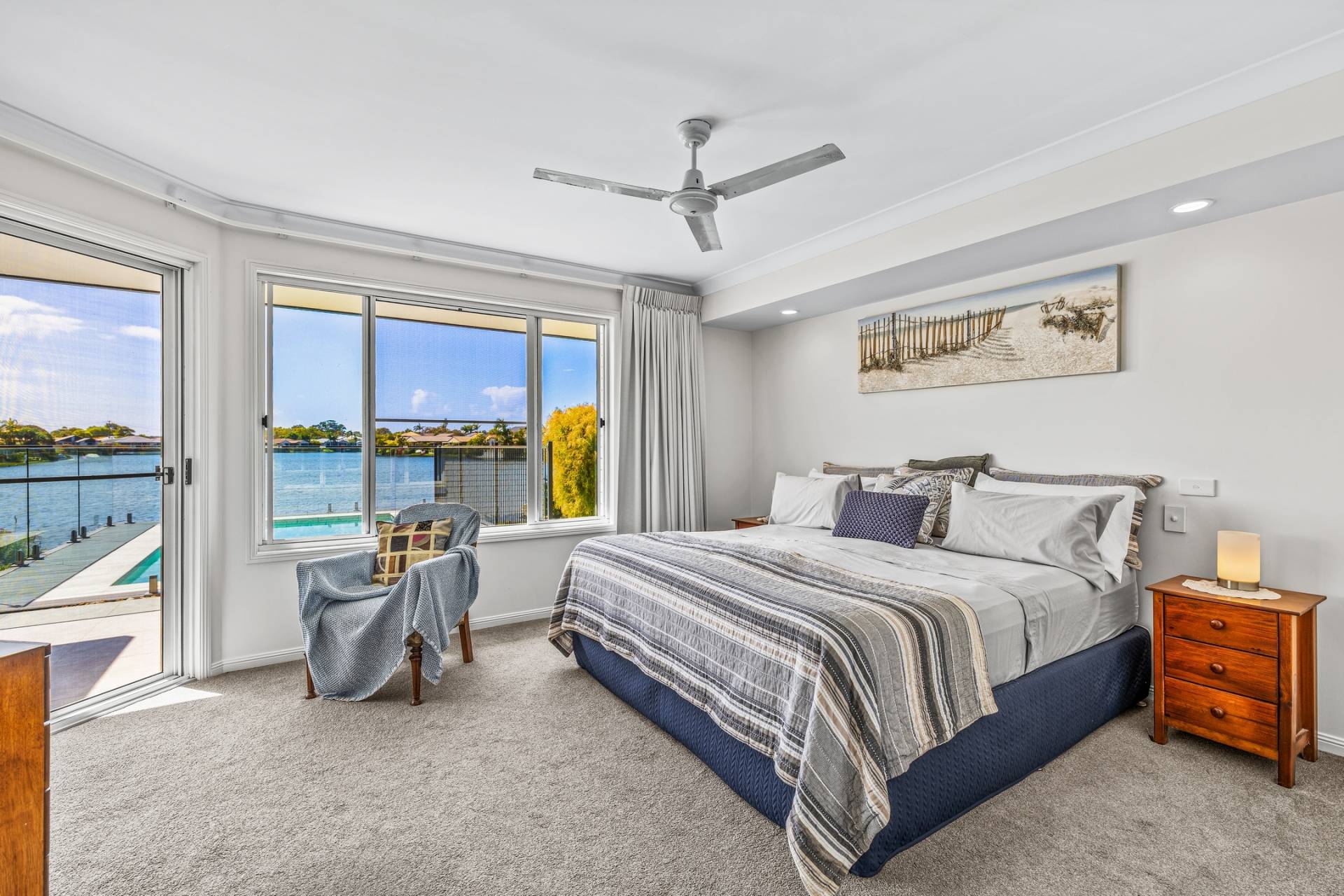 Sliding doors from both living areas open to a covered alfresco patio, perfect for entertaining or simply relaxing while overlooking the lush, landscaped backyard, the magnesium inground swimming pool, and the sparkling lake beyond.