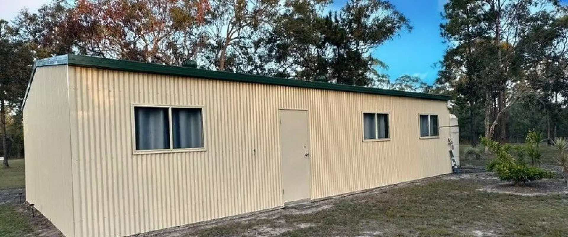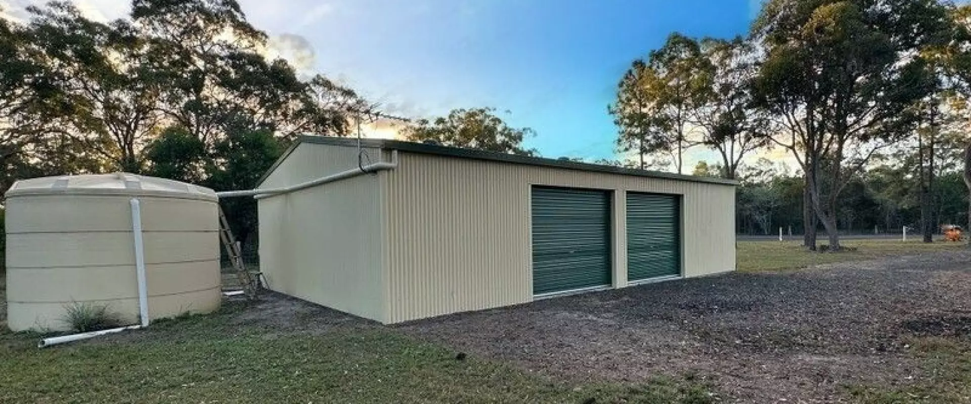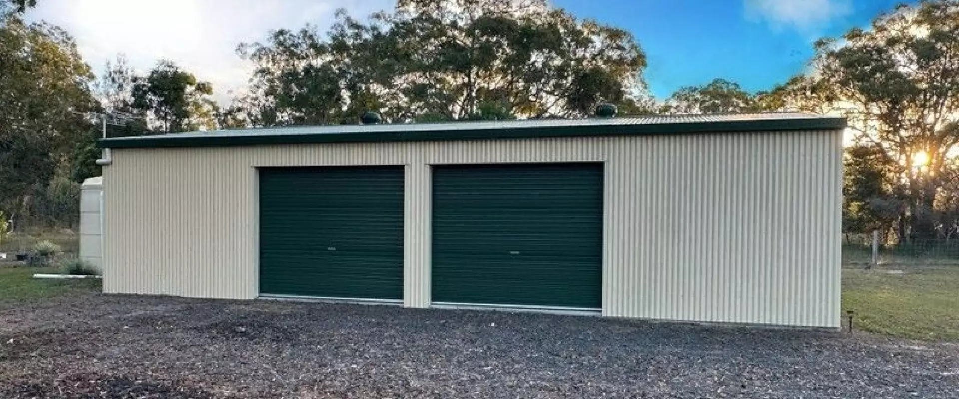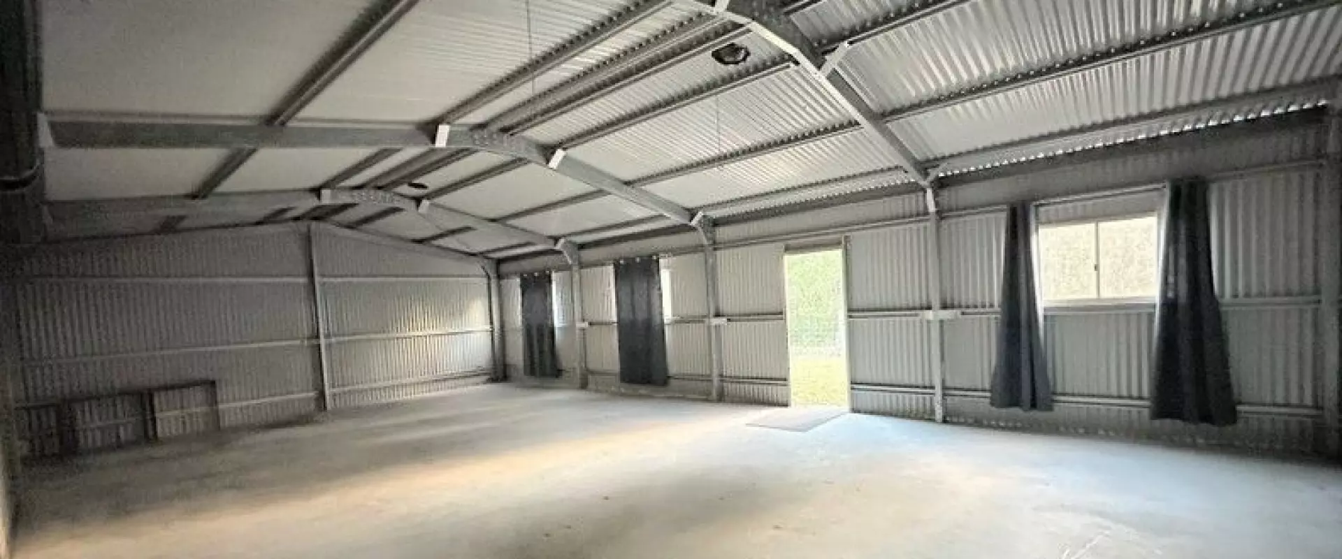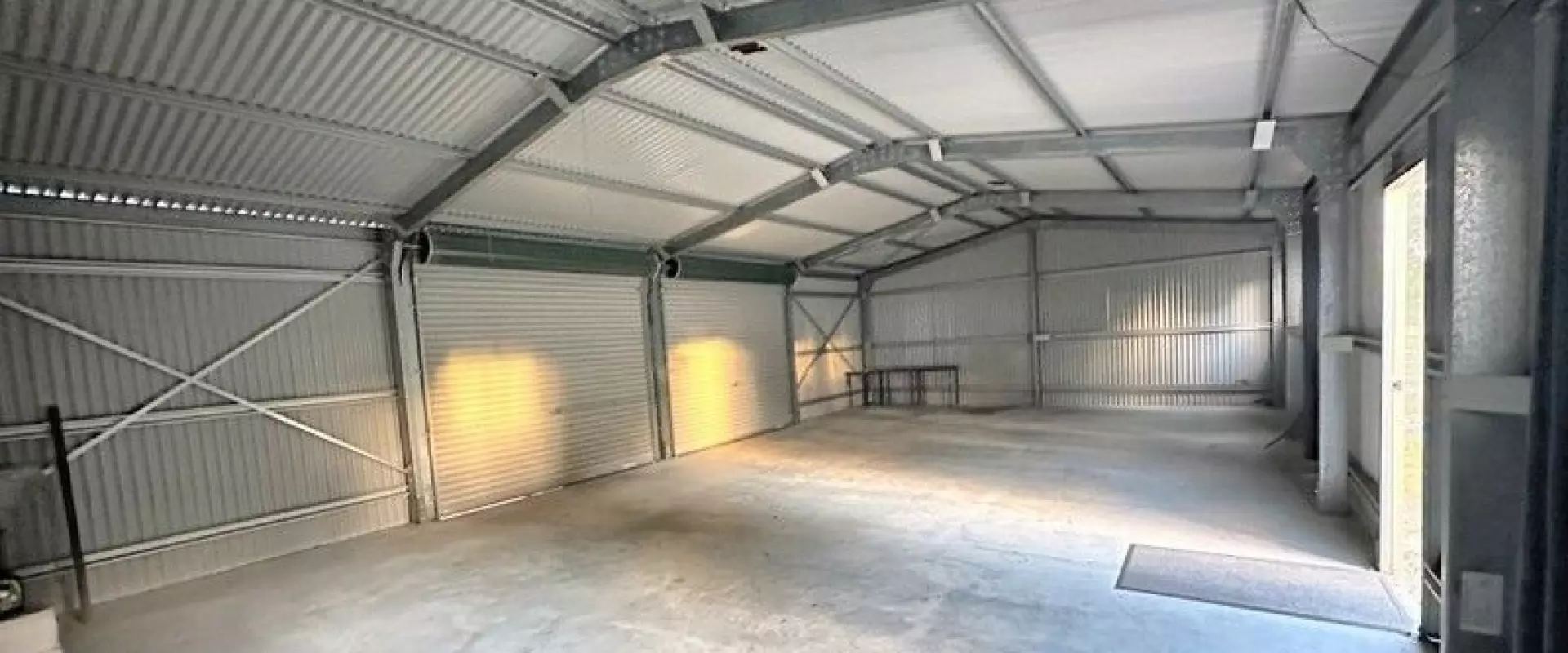 - 12m x 7m Shed with concrete floor, 2 roller doors and a personal access door