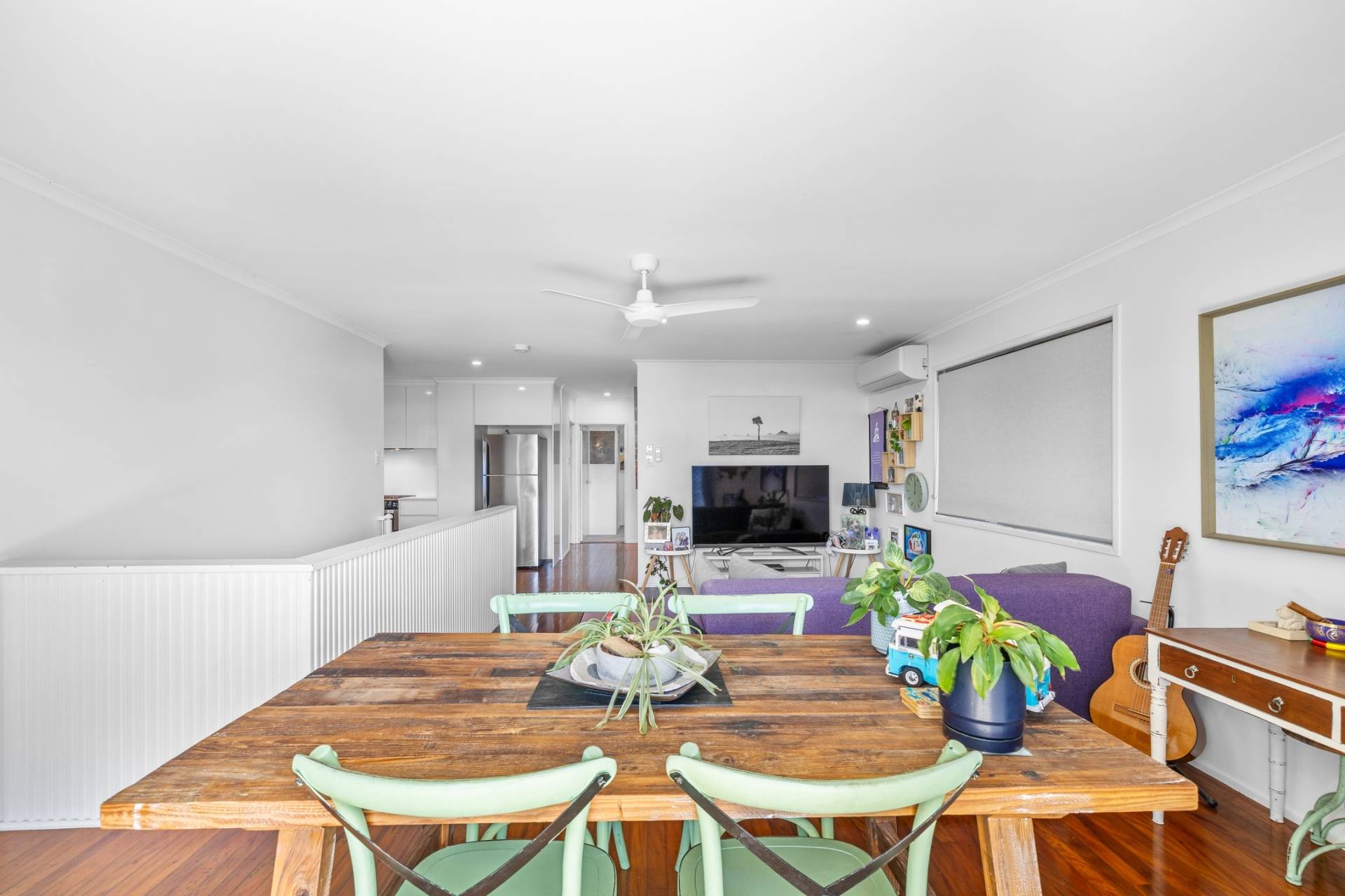 • The dining space opens to the front deck, perfect for enjoying Queensland sunsets, while the enclosed sunroom with plantation shutters welcomes in the sea breezes.