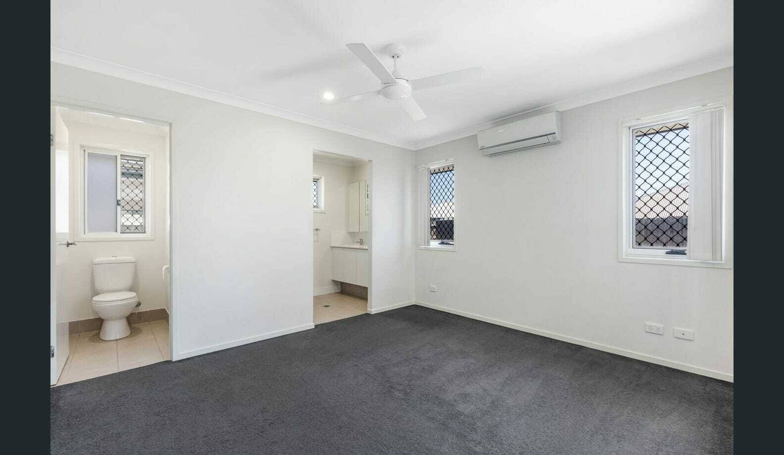 - Spacious master bedroom at the rear of the home with air-conditioning, walk-in robe, and ensuite featuring a large shower and separate toilet
