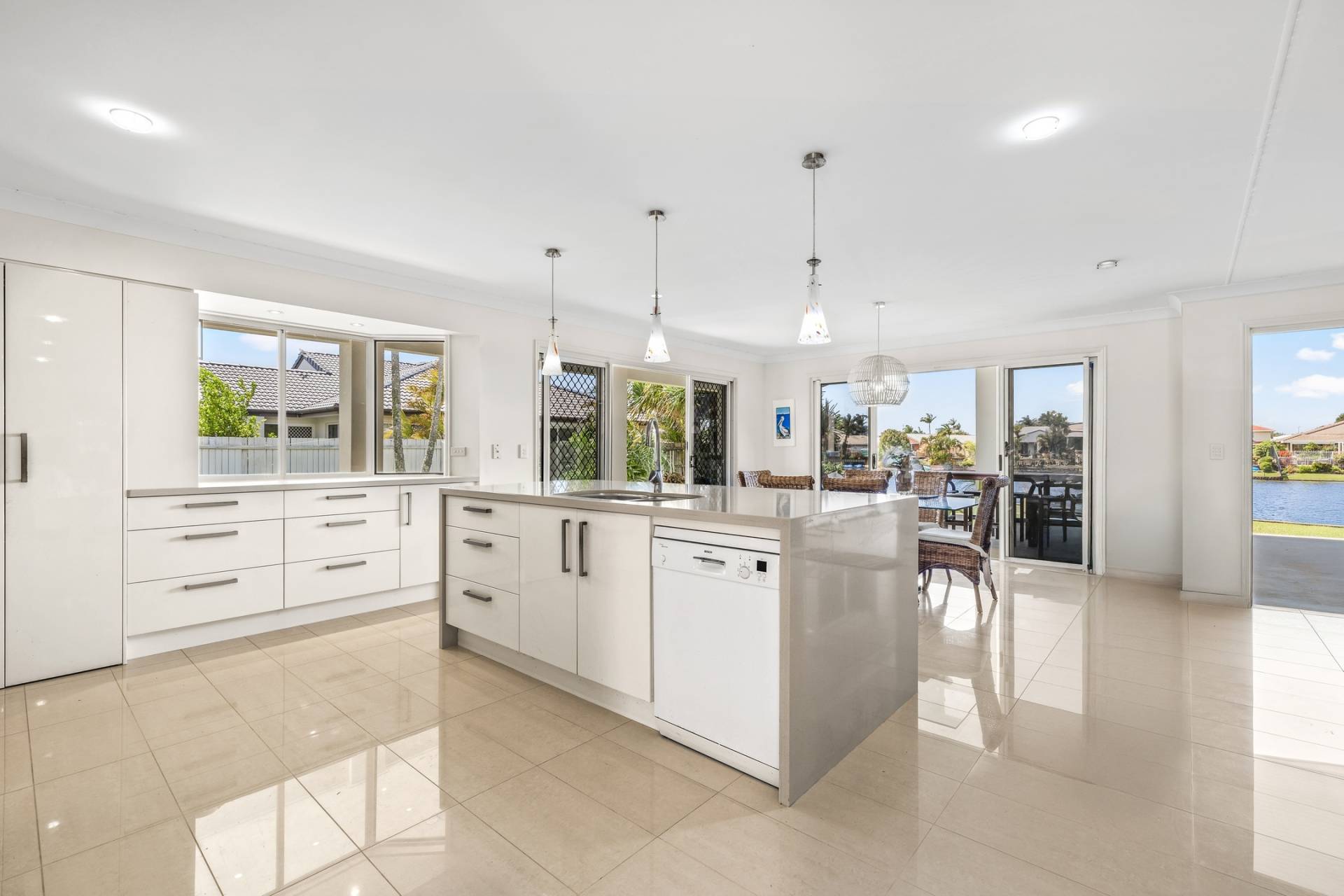 At the heart of the home, the open-plan kitchen, dining, and living areas showcase sweeping views across the outdoor entertaining zone to the sparkling waters of Lake Magellan. The kitchen, generously appointed with Bosch appliances, extensive bench space, and abundant storage, connects seamlessly to the tiled living spaces. Large sliding doors open wide to reveal an oversized undercover entertaining terrace with a striking roofline — a spectacular setting for gatherings, celebrations, or quiet evenings by the water.