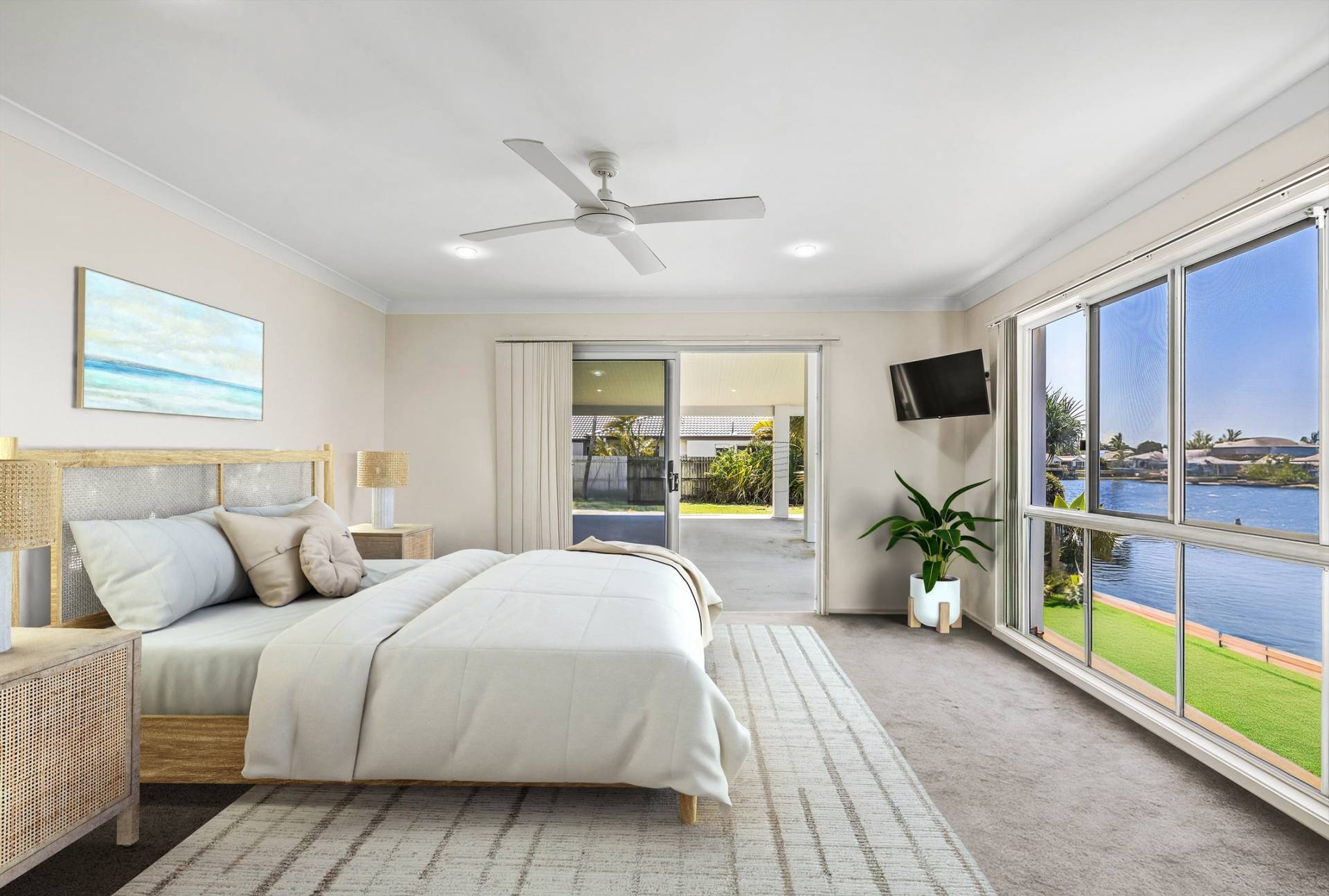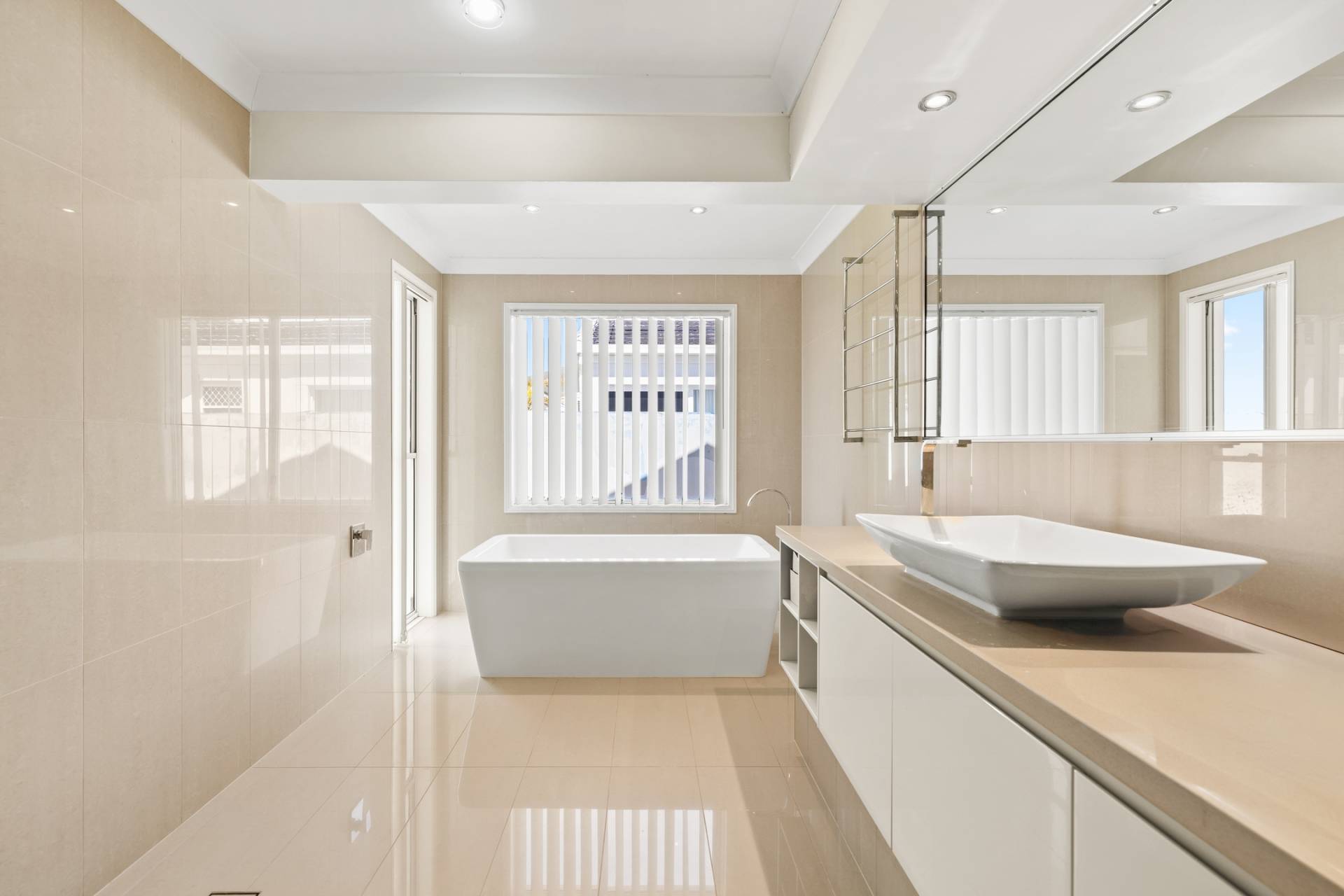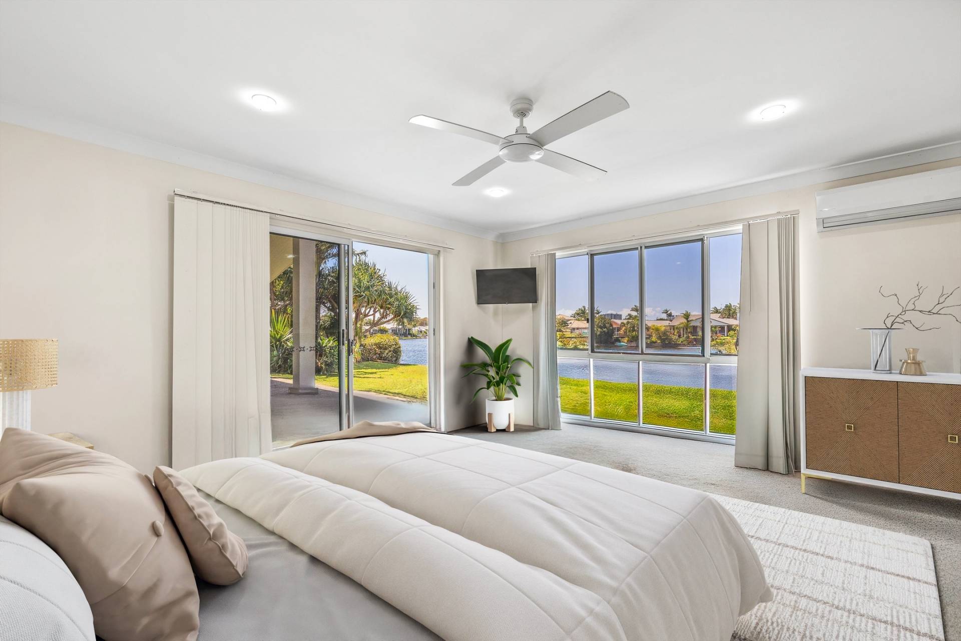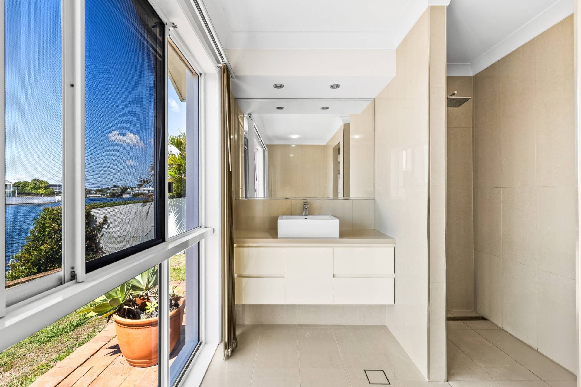 Accommodation is designed with comfort in mind. The master suite enjoys direct access to the outdoor entertaining area, along with a walk-in robe, modern ensuite, and beautiful water views to wake up to each morning. Three further bedrooms are all generously sized, with the fourth offering its own private courtyard. The bathrooms throughout are stylish and contemporary, with the family bathroom boasting floor-to-ceiling tiling, a frameless rainfall shower, freestanding bath, and separate toilet. A powder room and excellent storage add further practicality.