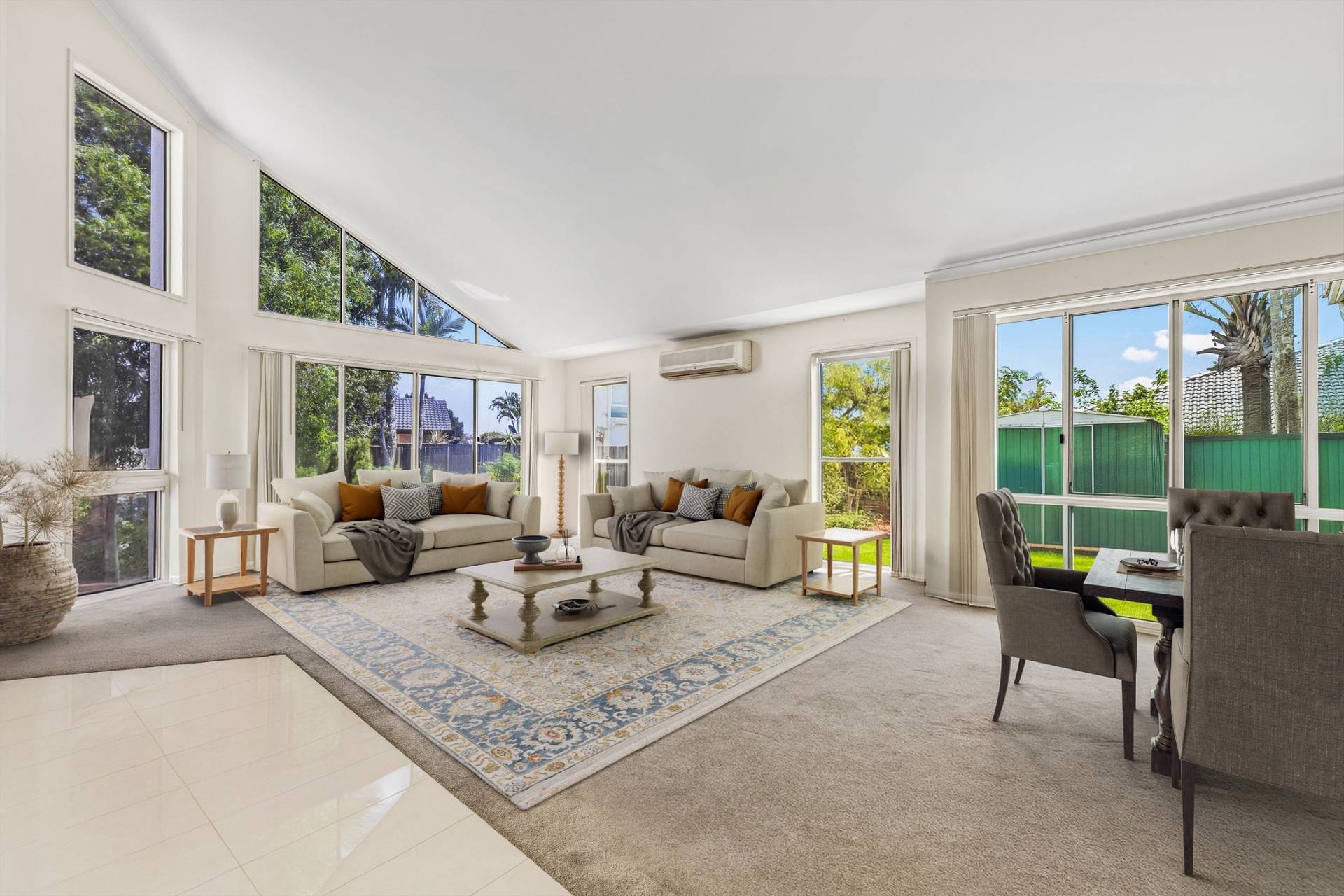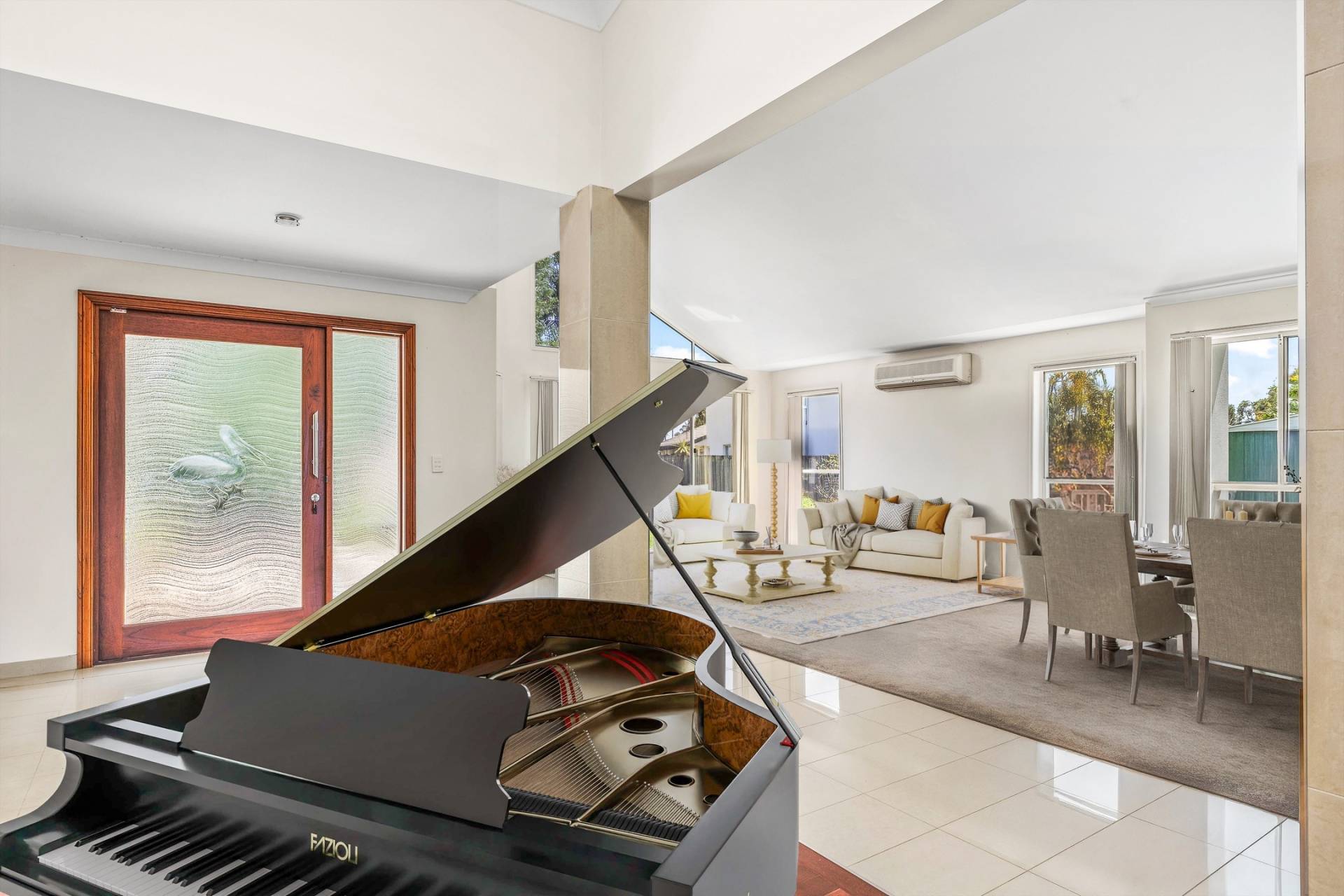 The entry makes a statement, with a custom-designed timber and glass door featuring pelican-inspired artwork that welcomes you into a wide foyer. To one side, the formal lounge and dining room is a true centrepiece — soaring, slanted ceilings, expansive windows, and a wonderful sense of light and space create an atmosphere that is both impressive and inviting.