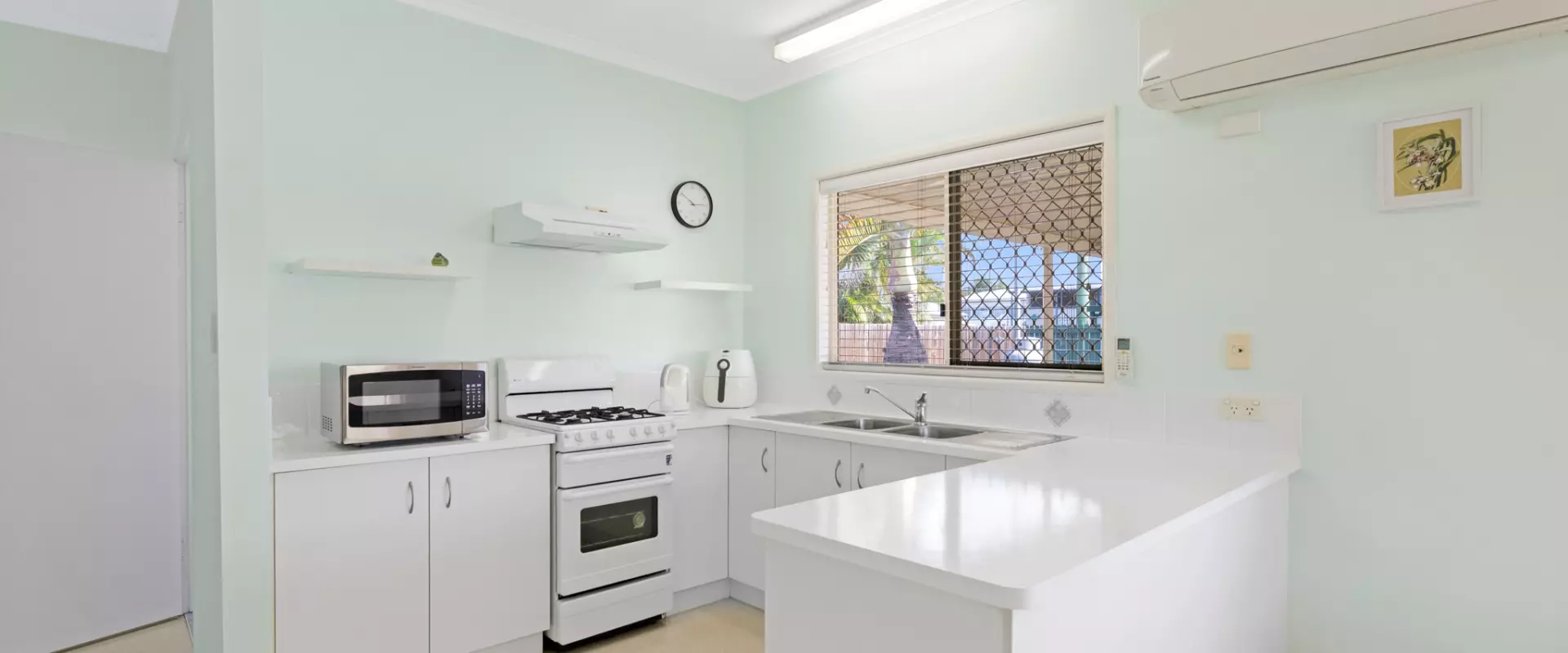The kitchen is equipped with a stand-alone stove/oven and plenty of cupboard and bench space.