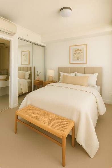 • A master bedroom with built-in wardrobe, ensuite, and air-conditioning