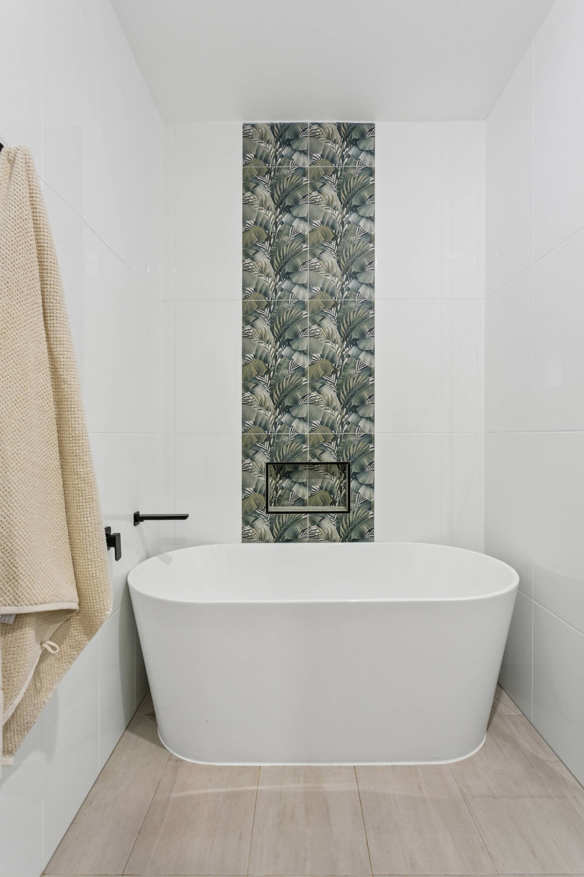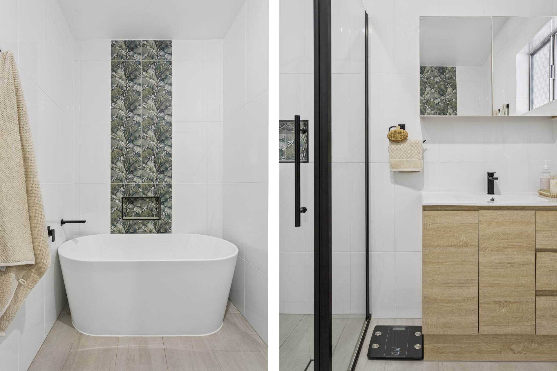 Each of the three bedrooms is fitted with built-in mirrored wardrobes, air-conditioning, new fans, and soft carpet underfoot. The updated bathroom includes floor-to-ceiling tiles, a freestanding bath, niche shelving in the shower, and a separate toilet, offering practicality and a clean, modern feel.