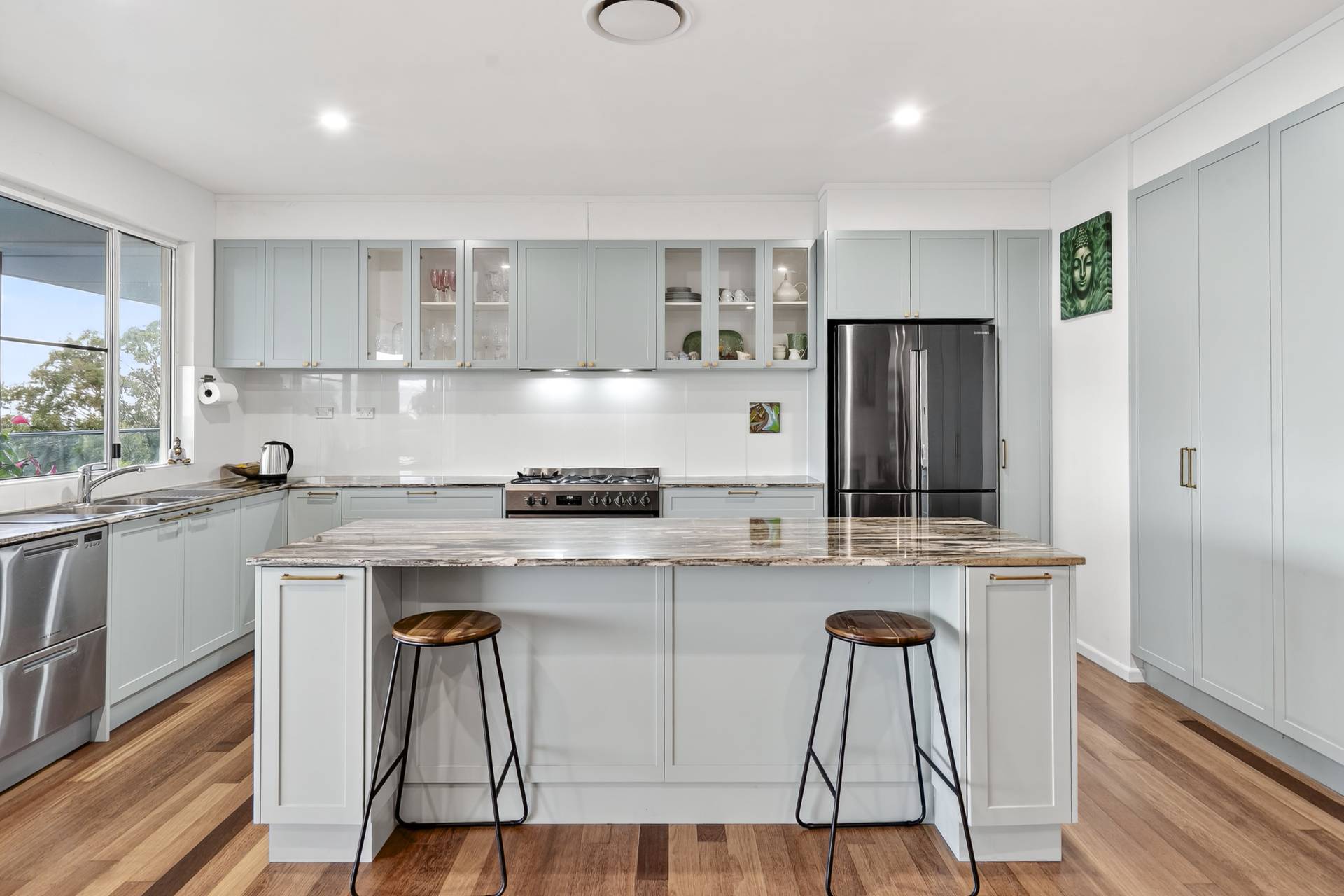 . European kitchen appliances, solid polished granite benchtops, wraparound breakfast bar, and stylish cabinetry.